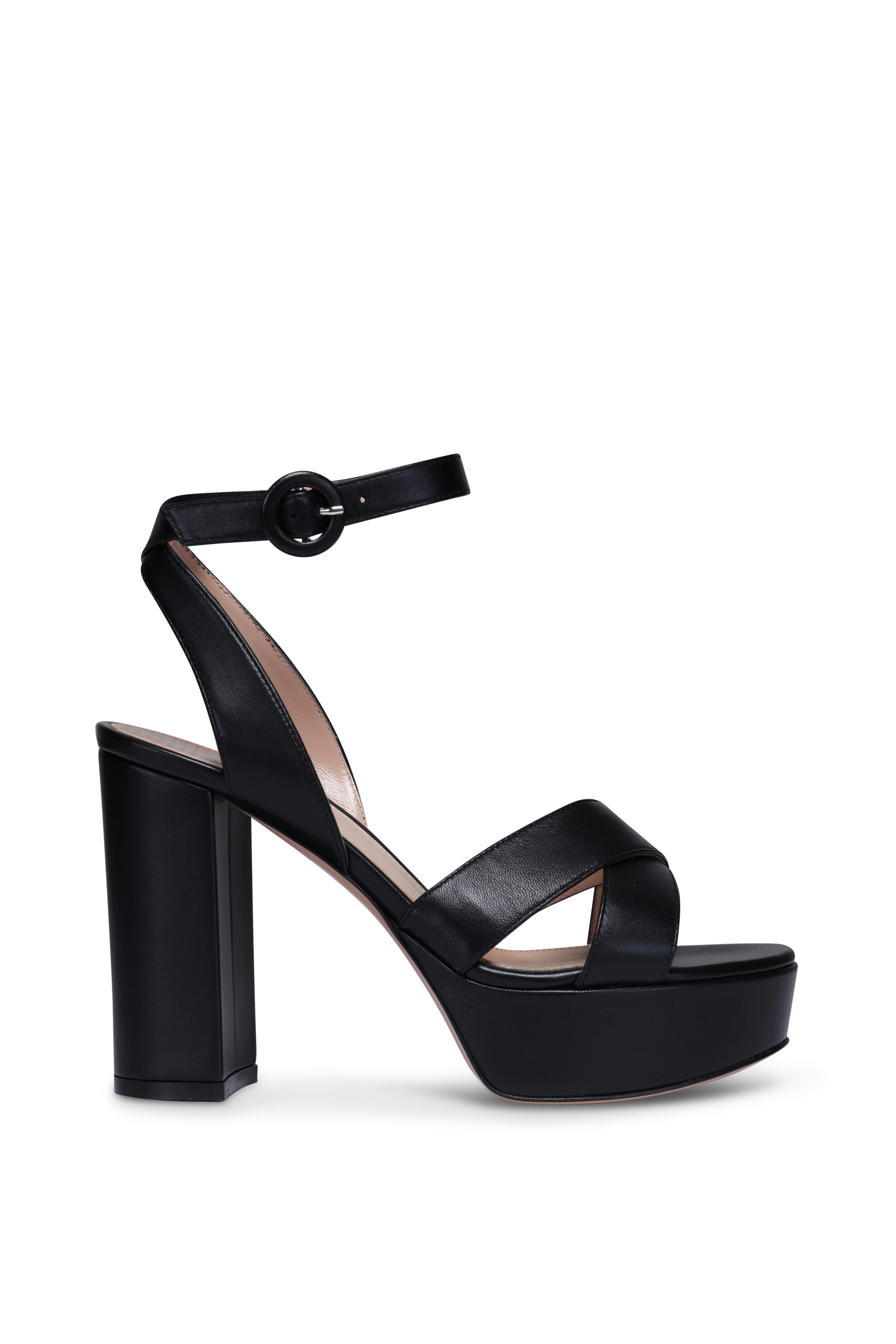 Nappa leather upper. Leather lining and sole. Open toe. Adjustable ankle strap. Criss-cross vamp. Slip-on style. Made in Italy. Heel measurement: 70mm.