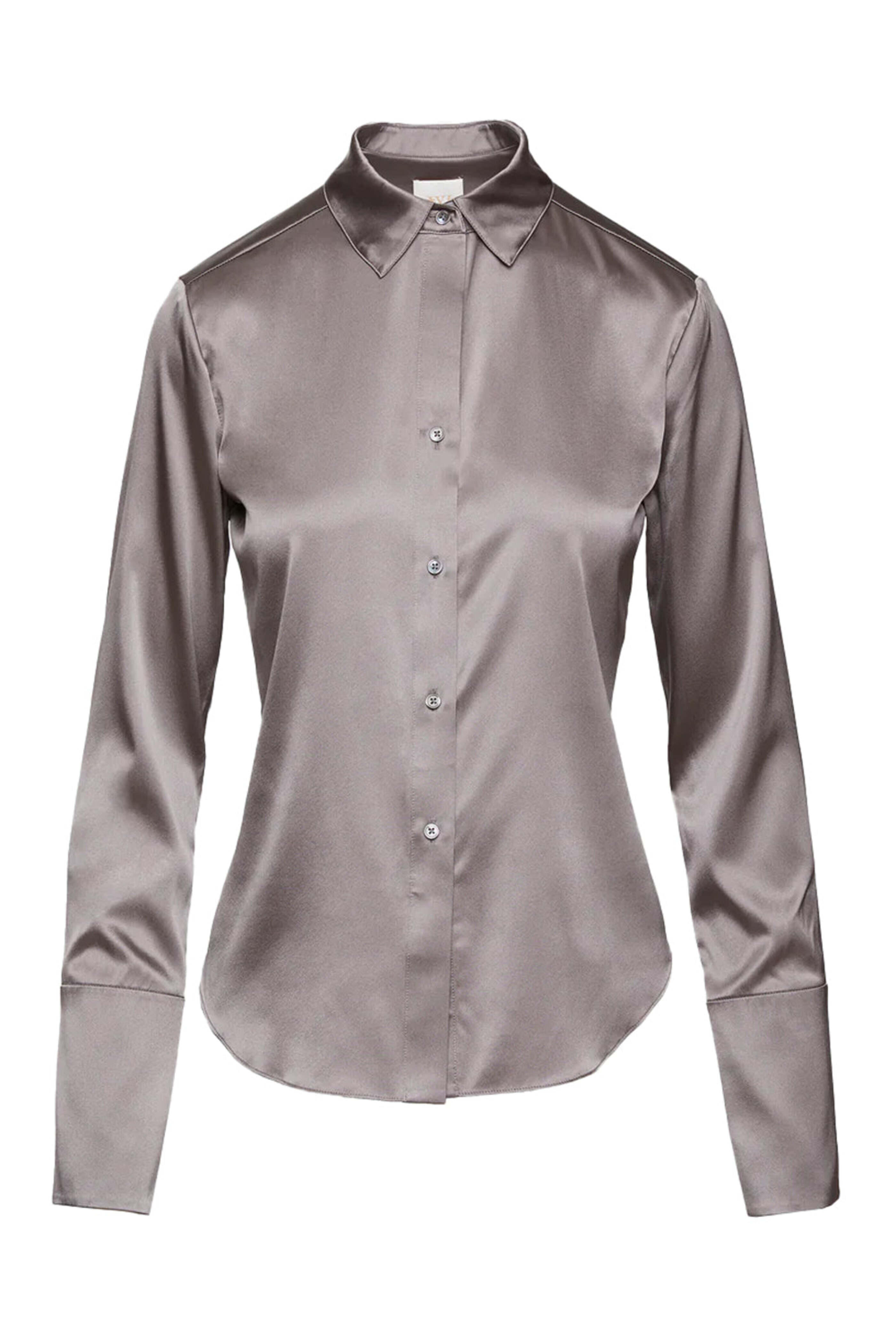 TWP Gunmetal Silk Bessette Shirt. Collar. Long sleeves; button cuffs. Button down front closure. Slim silhouette. Rounded hem. 97% silk, 3% elastane.