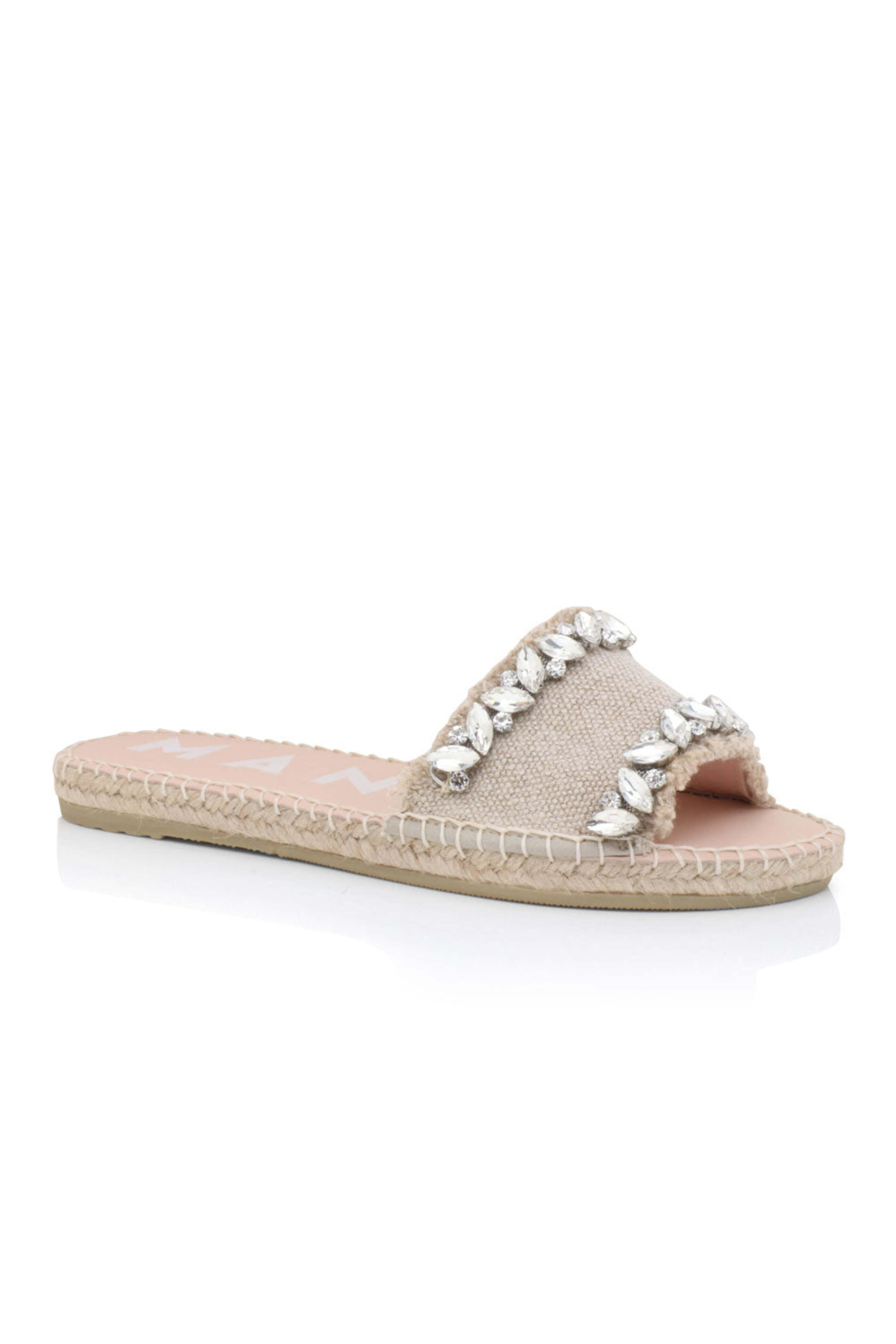 Manebi Capri Sandal in Natural. Open toe. Slip on. Gem detailing on strap. Leather lining. Microfiber sole with thin natural rubber layer. Made in Spain. 100% organic hemp upper.