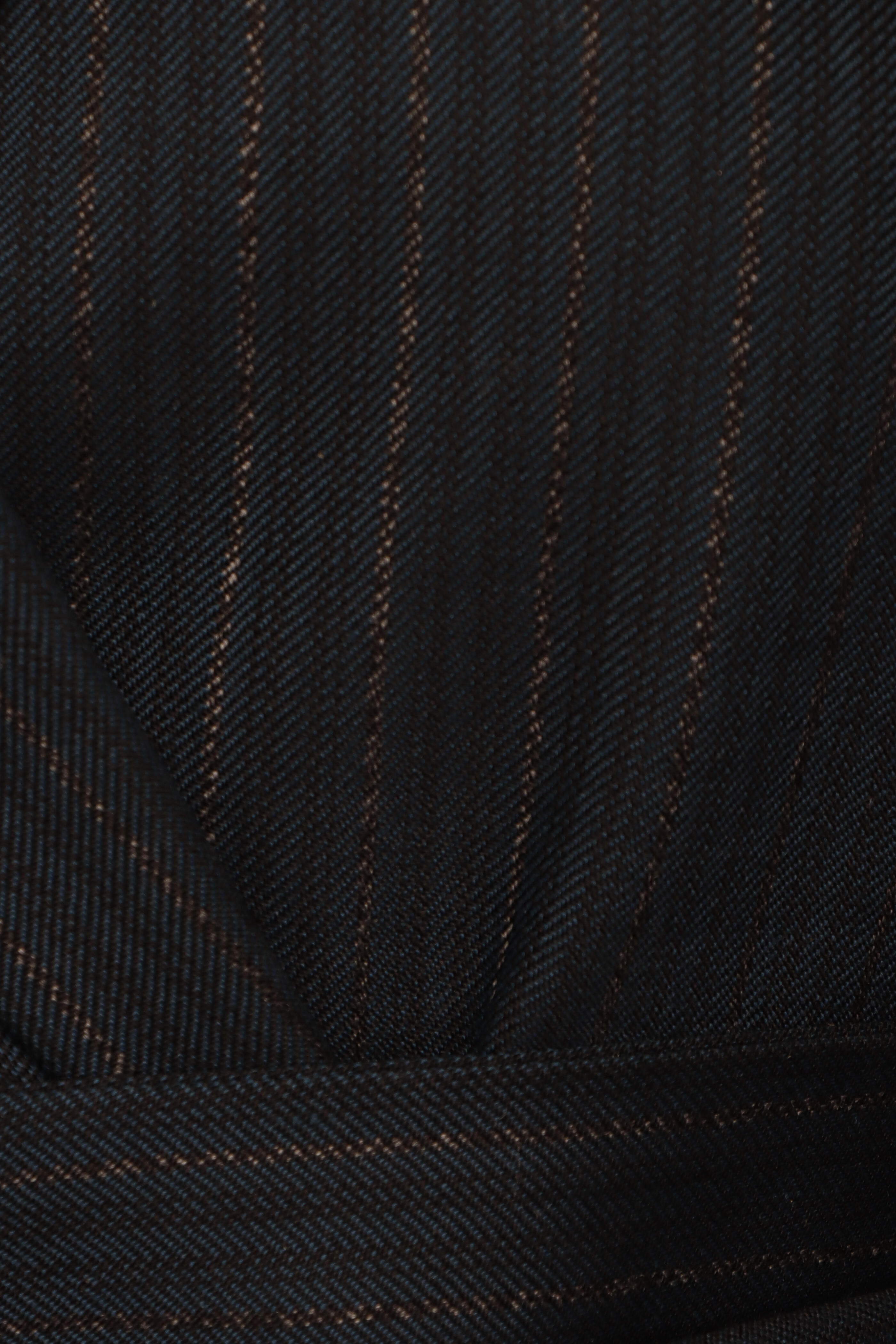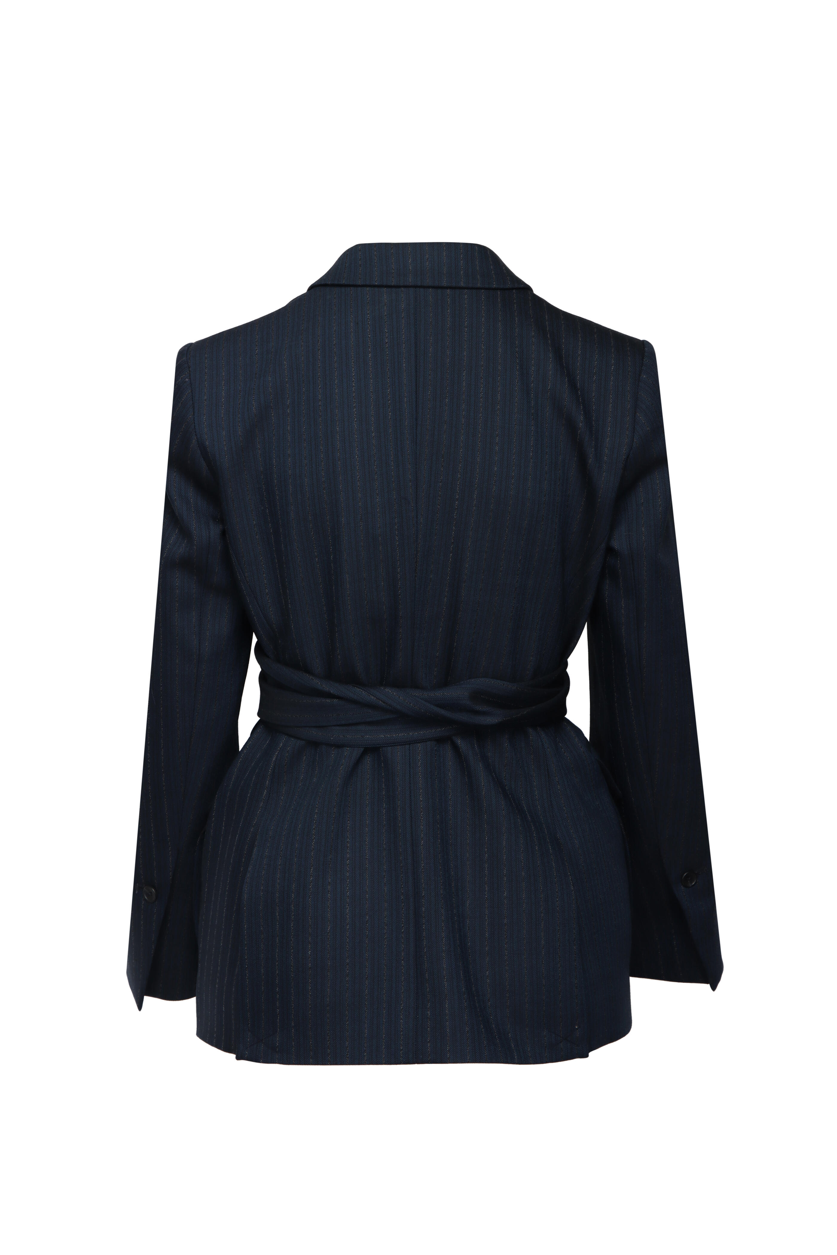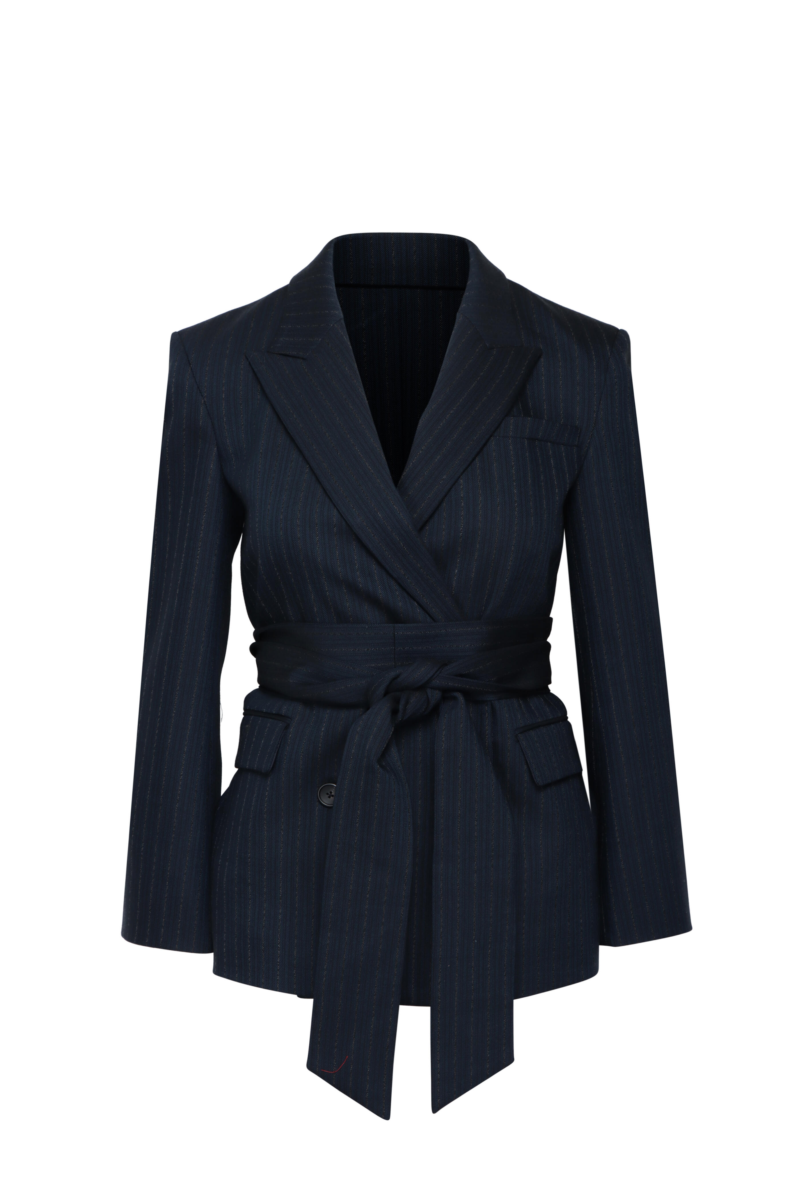 Peak laple. Long sleeves; button cuffs. Single chest welt pocket. Button front closure. Removable self-tie belt; self-fabrication. Hip flap pockets. Boxy fit. Pinstripe detail. Imported. 98% wool, 2% elastane.