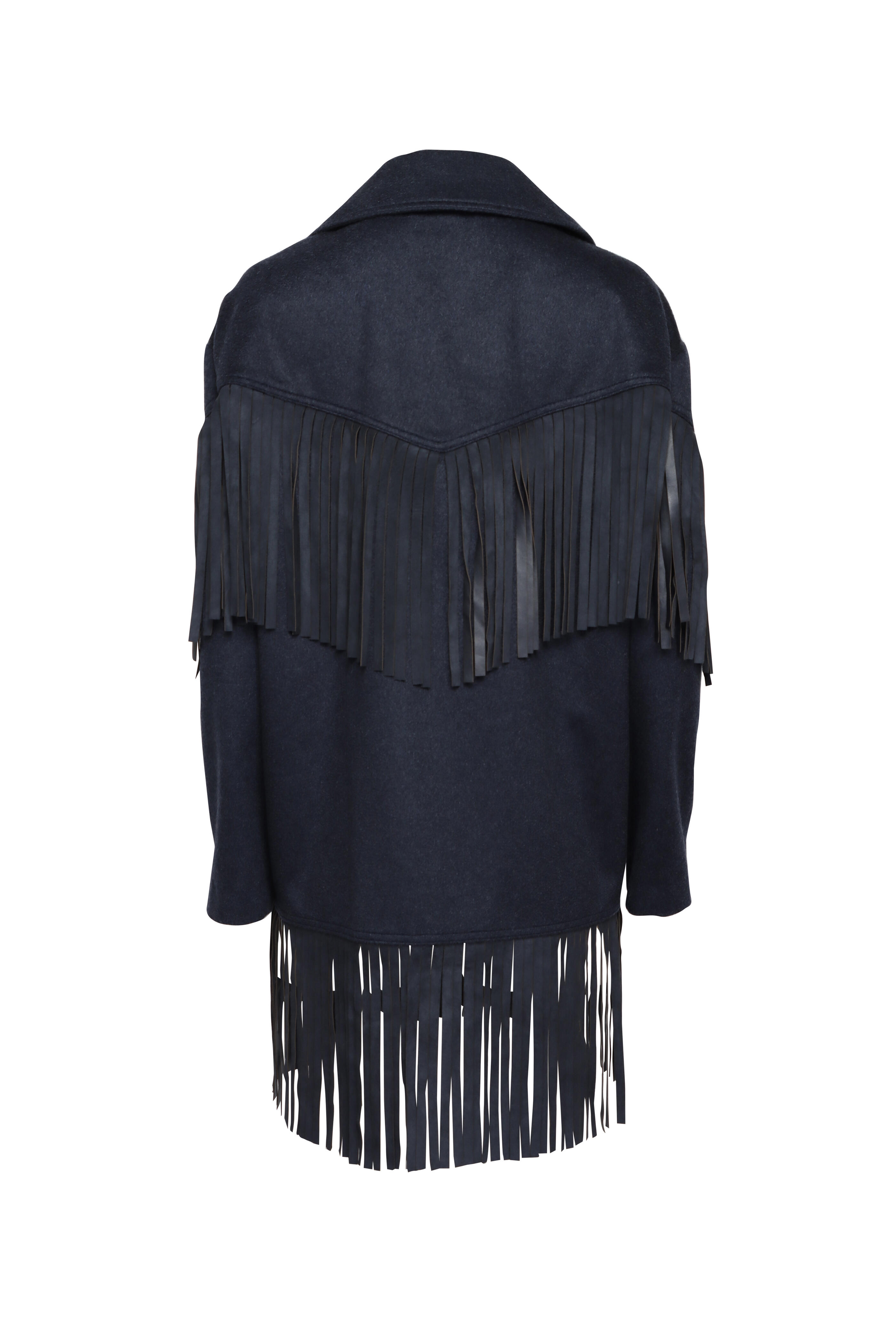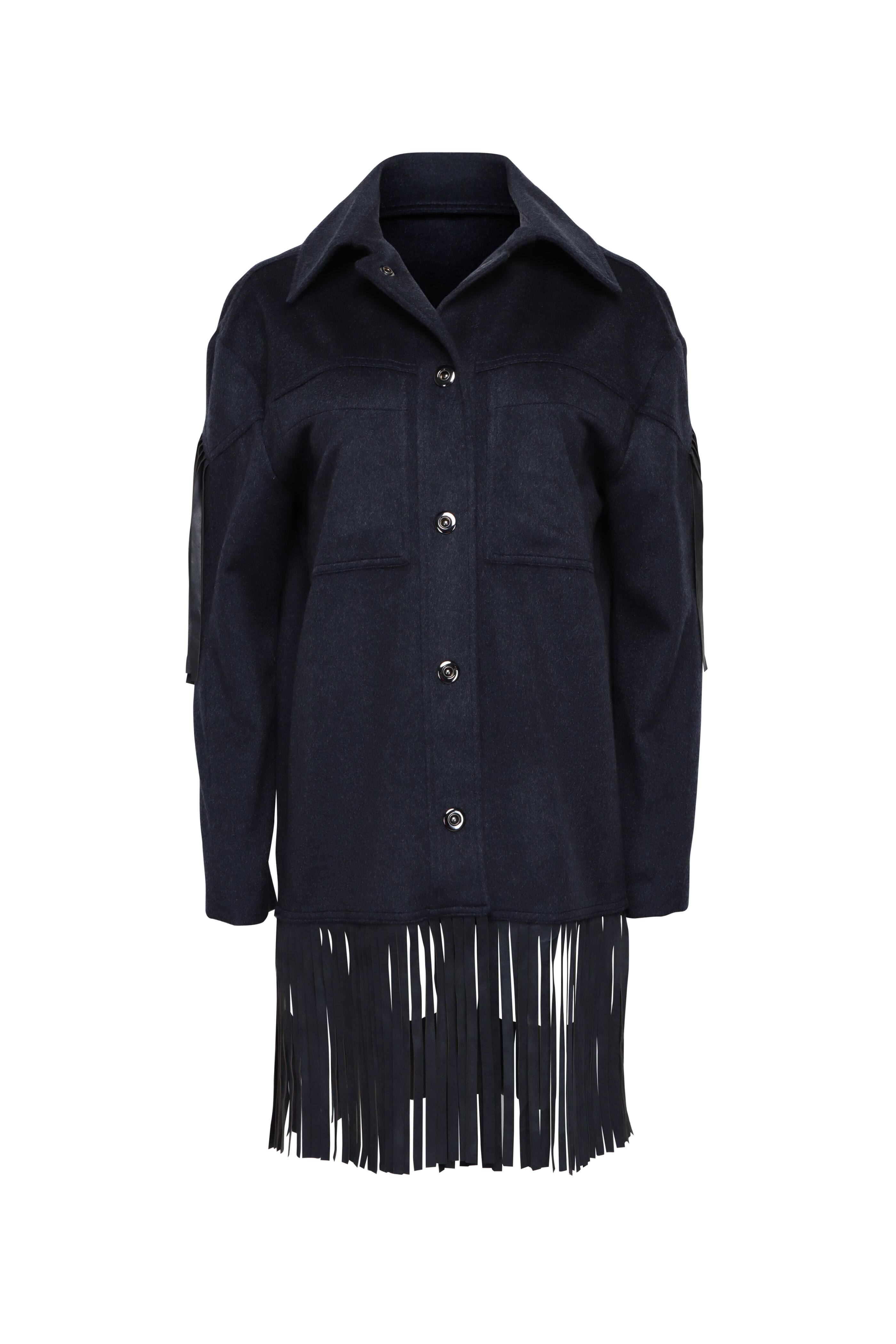 Collar. Drop shoulders. Long sleeves. Button front closure. Chest patch pockets. Fringe detail at back yoke and hem. Relaxed fit. Imported. Long length. 100% cashmere outer, 100% suede fringe detail. Dry clean.