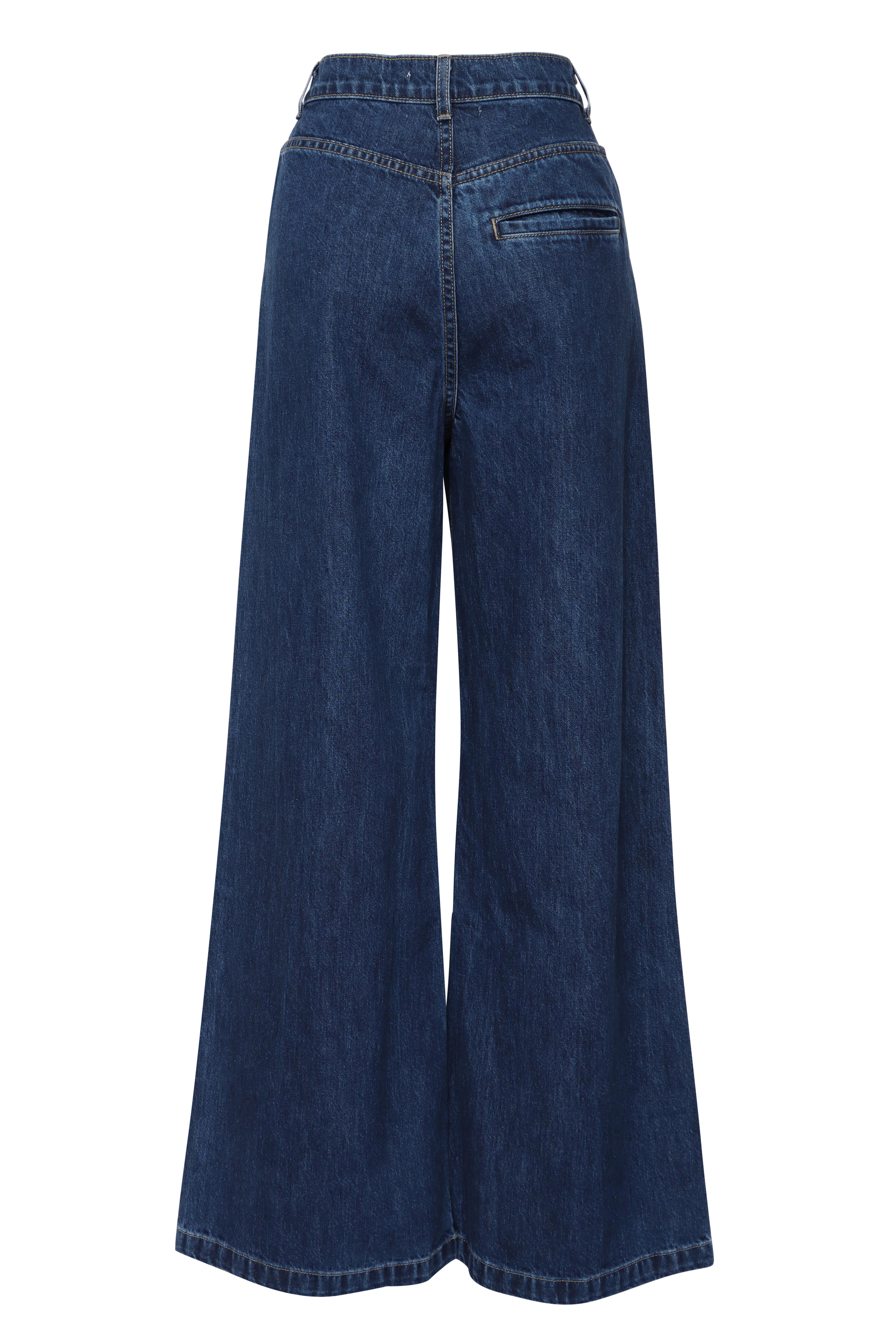 High rise. Button closure. Zip fly. Belt loops. Five pocket style. Wide through leg. Denim fabrication. Imported. Full length. 100% cotton. Machine washable.