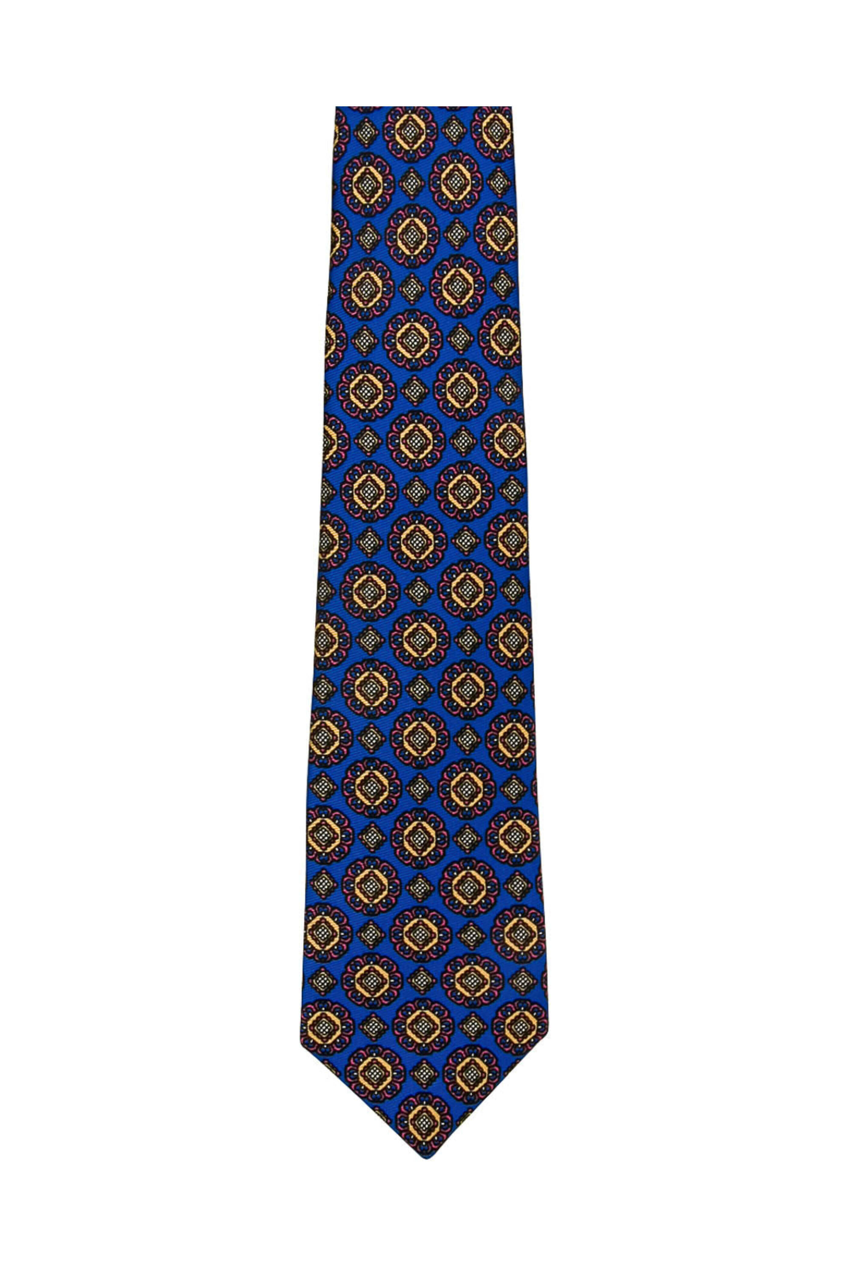 - Kiton Royal Blue with Yellow and Pink Medallion Tie Seven-fold tie 58 long 3.25 wide 100% silk Handmade in Italy