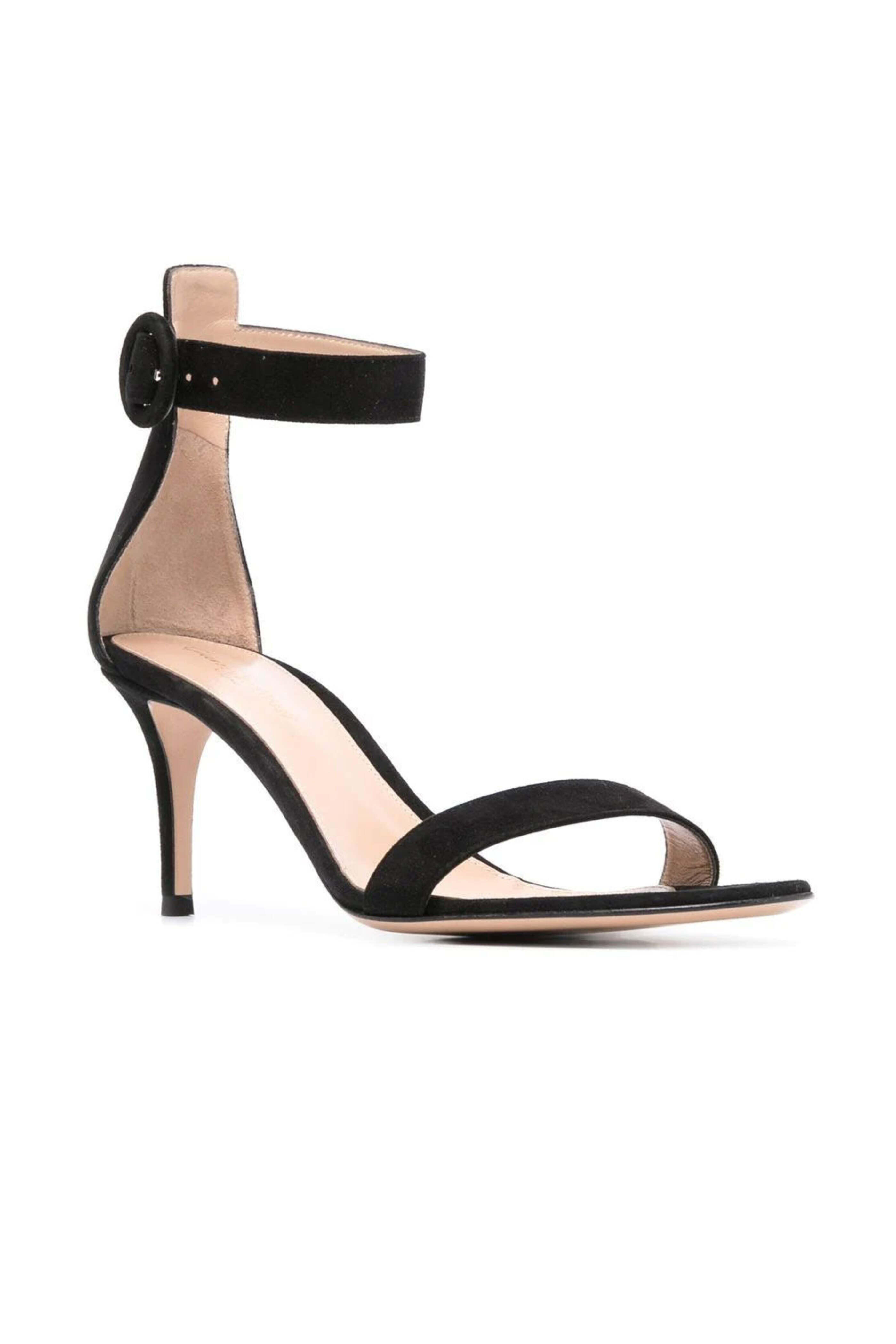 Gianvito Rossi Portofino Sandal in Black. Round open toe. Buckle-fastening ankle strap. 75 (70 mm) stiletto heel. Circular buckle. Suede upper. Leather lining and sole. Made in Italy.
