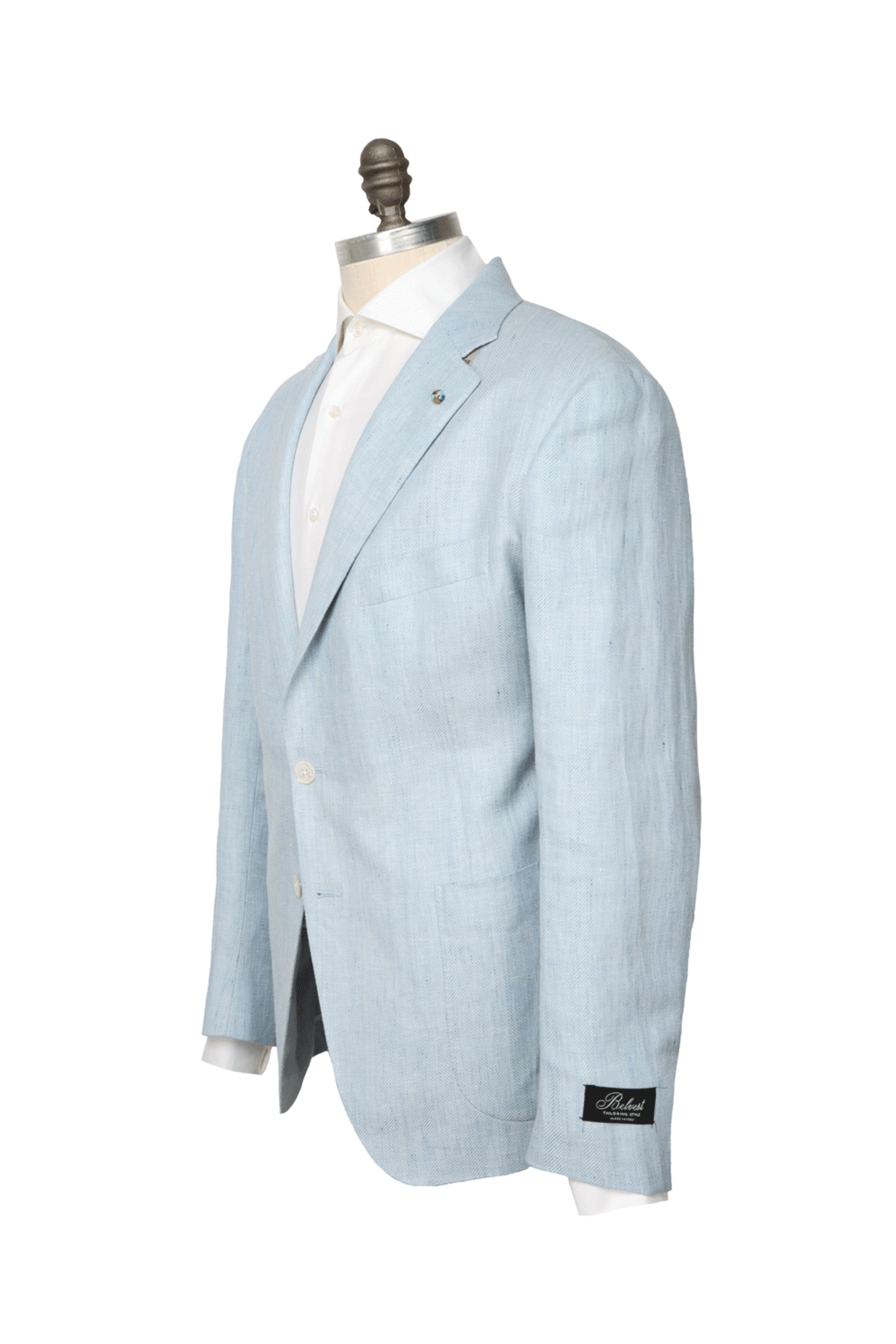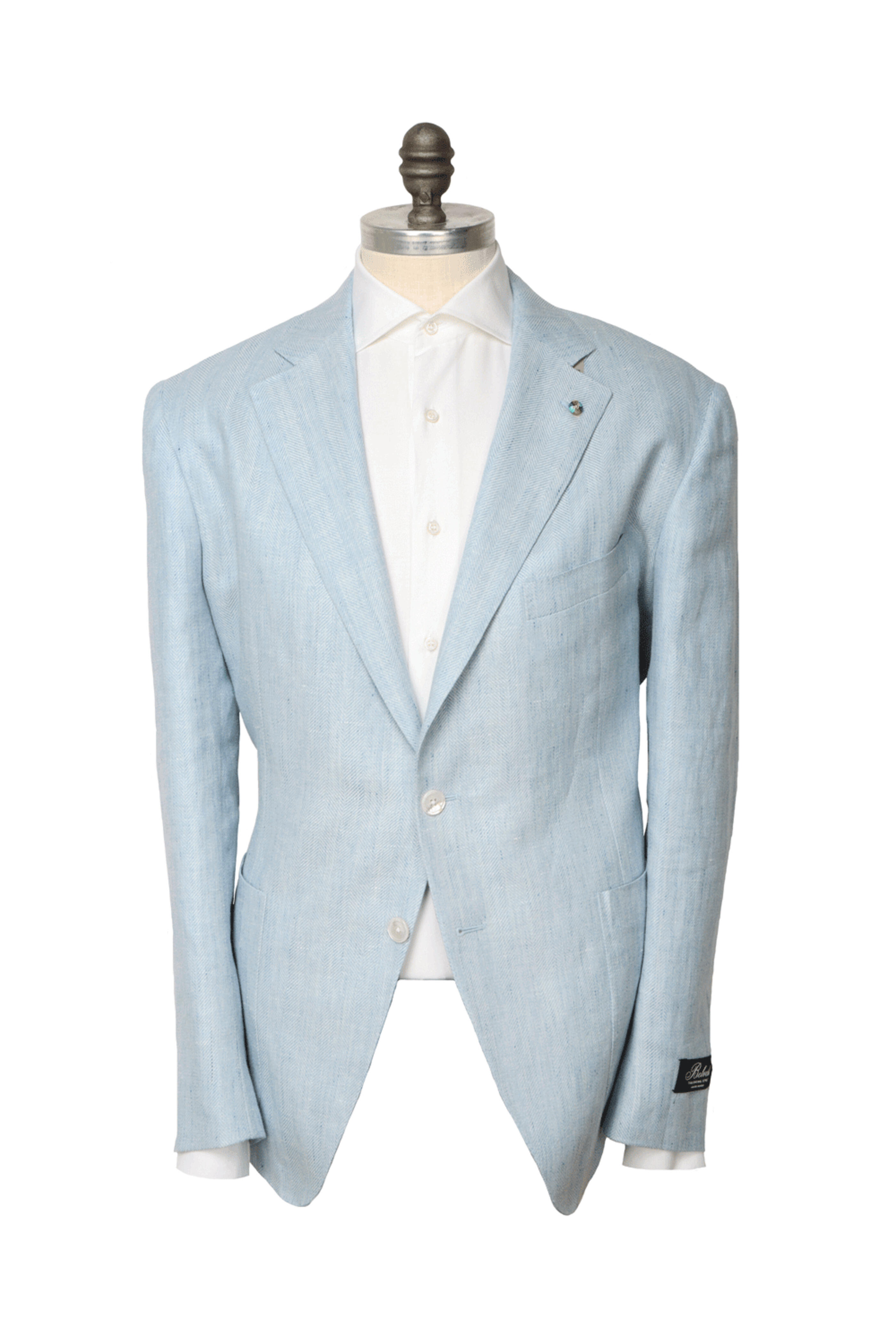 Belvest Pale Blue Sportcoat. Notch lapels. Two button jacket. Front left welt pocket. Waist patch pockets. Double back vents. Unfinished buttonholes. Drop 6. Quarter-lined. Cupro lining. Made in Italy . 60% Linen, 40% wool, .