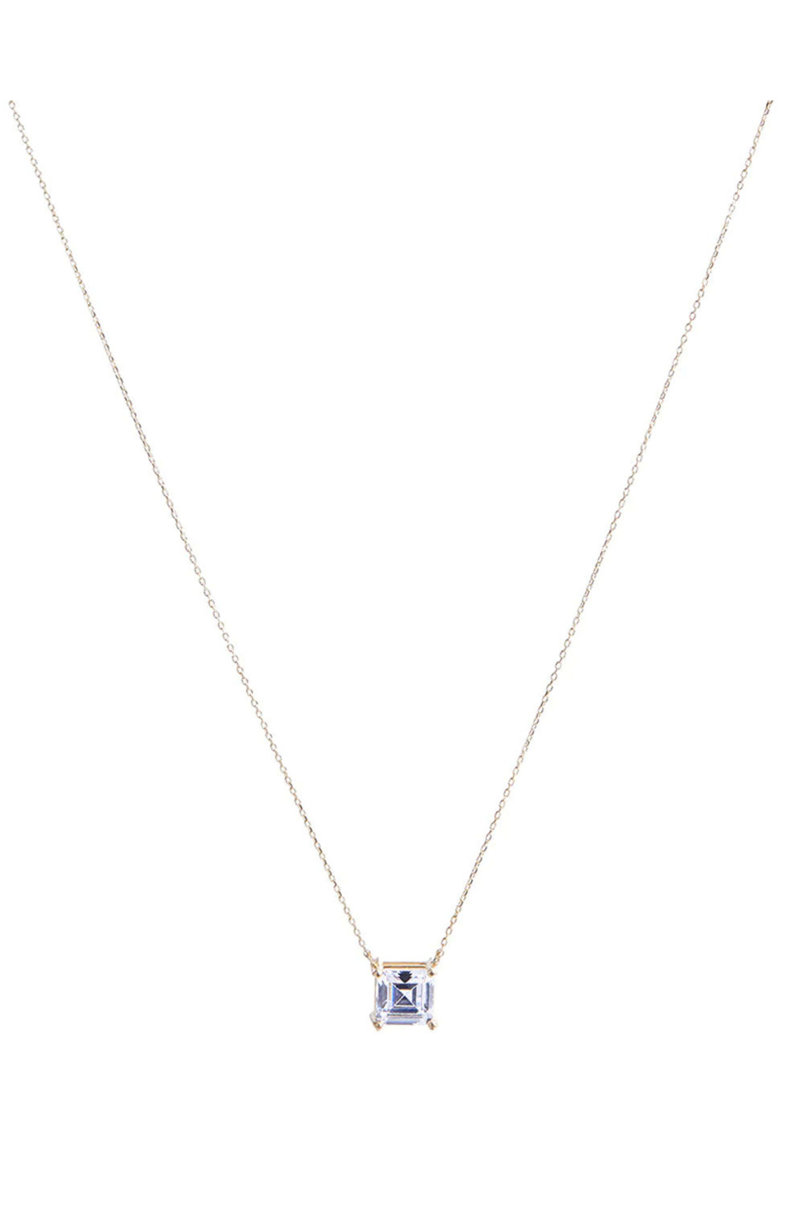 Nickho Rey Maya Single Grey Stone Necklace. 14k gold vermeil. Grey color crystal. Link chain. Floating stone. 0.5 L x 0.5 W. 15 L chain. Lobster claw clasp.