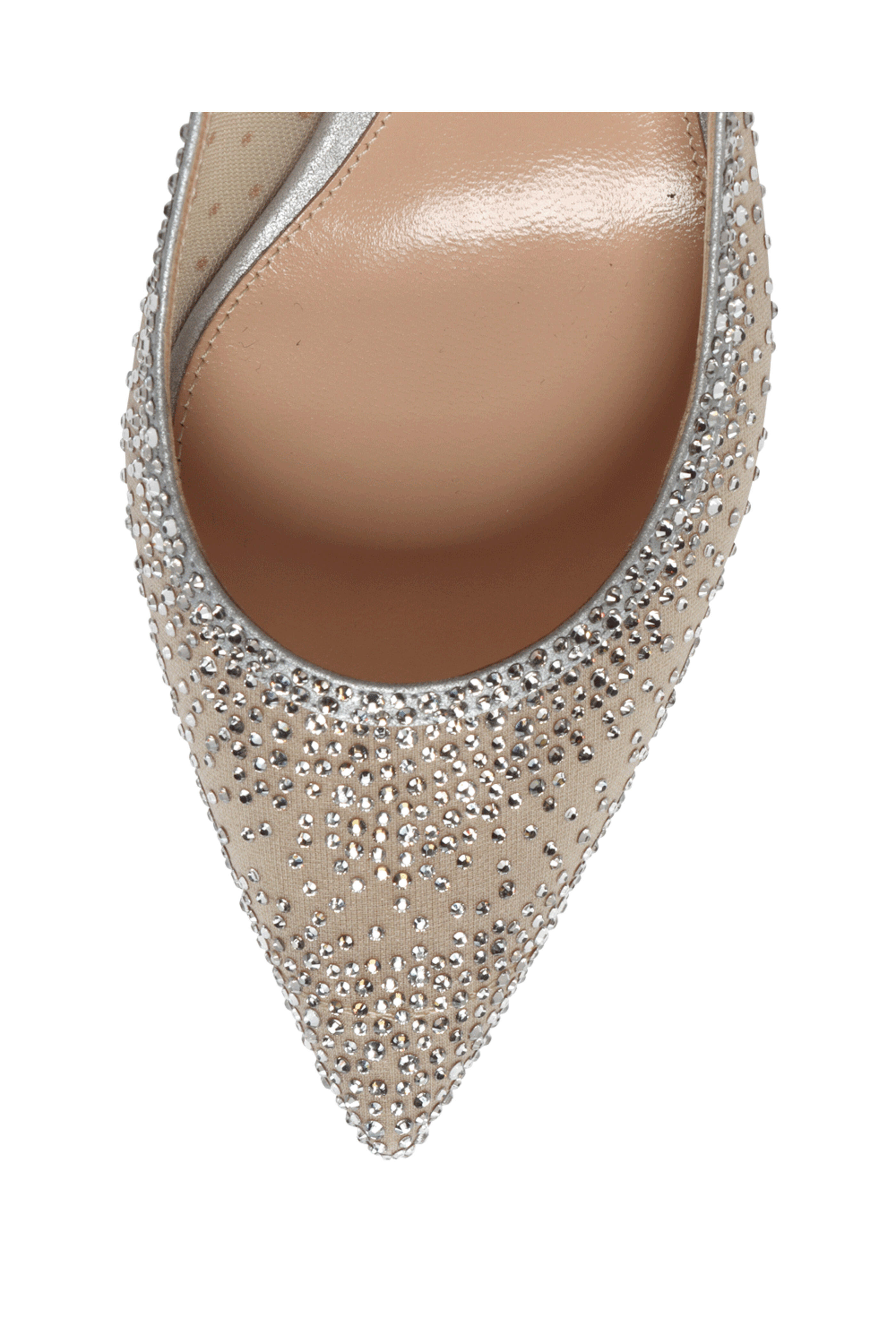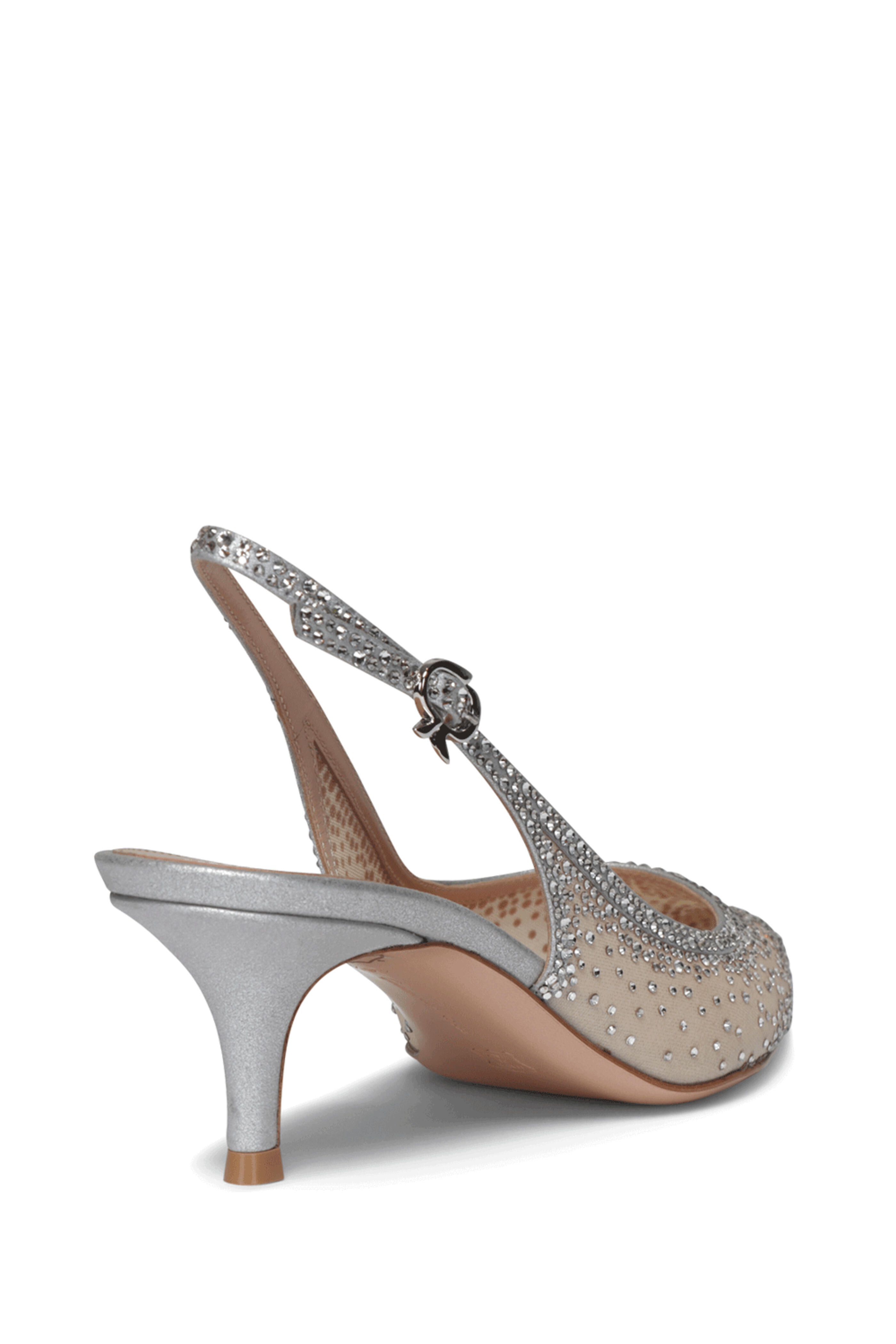 Organza silk upper. Pointed toe. Adjustable buckle strap. Slip-on style. Embellished with dazzling crystals. Leather lining and sole. Suede trim. Made in Italy. Heel height: 55mm.