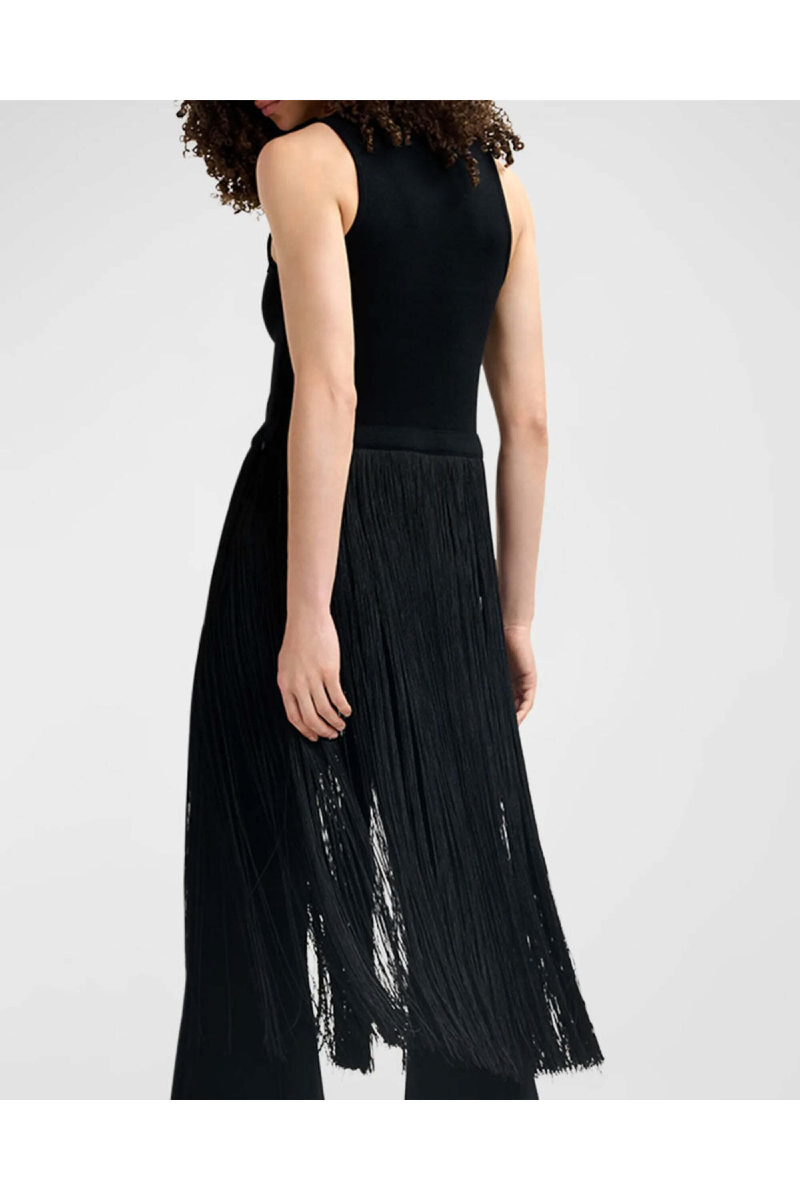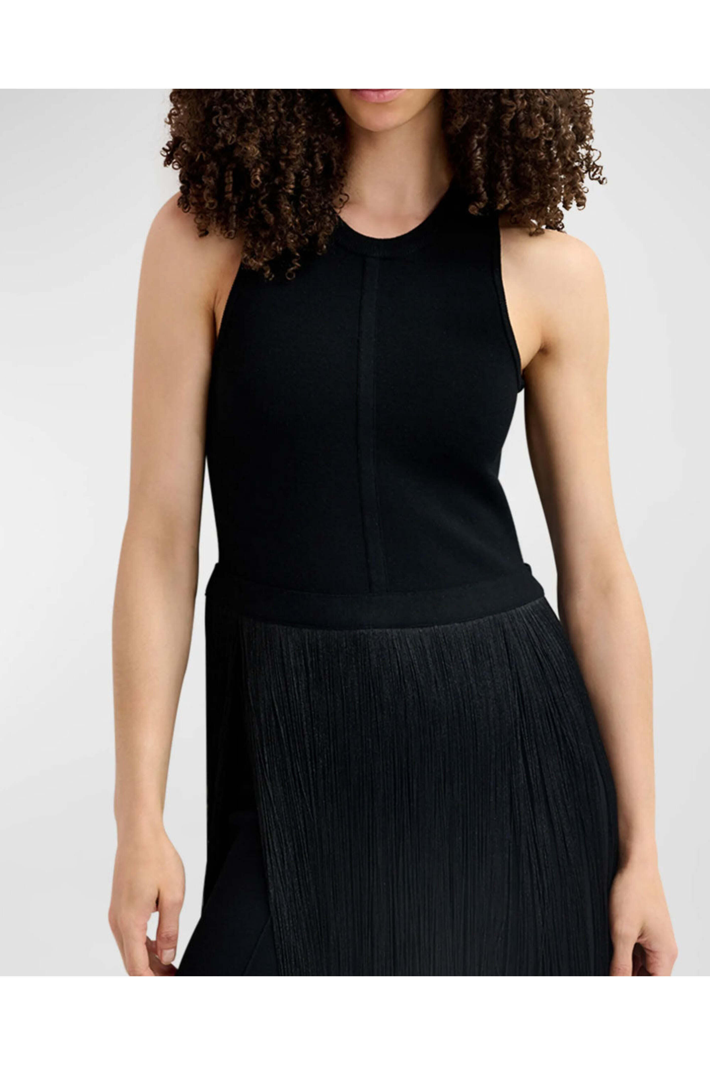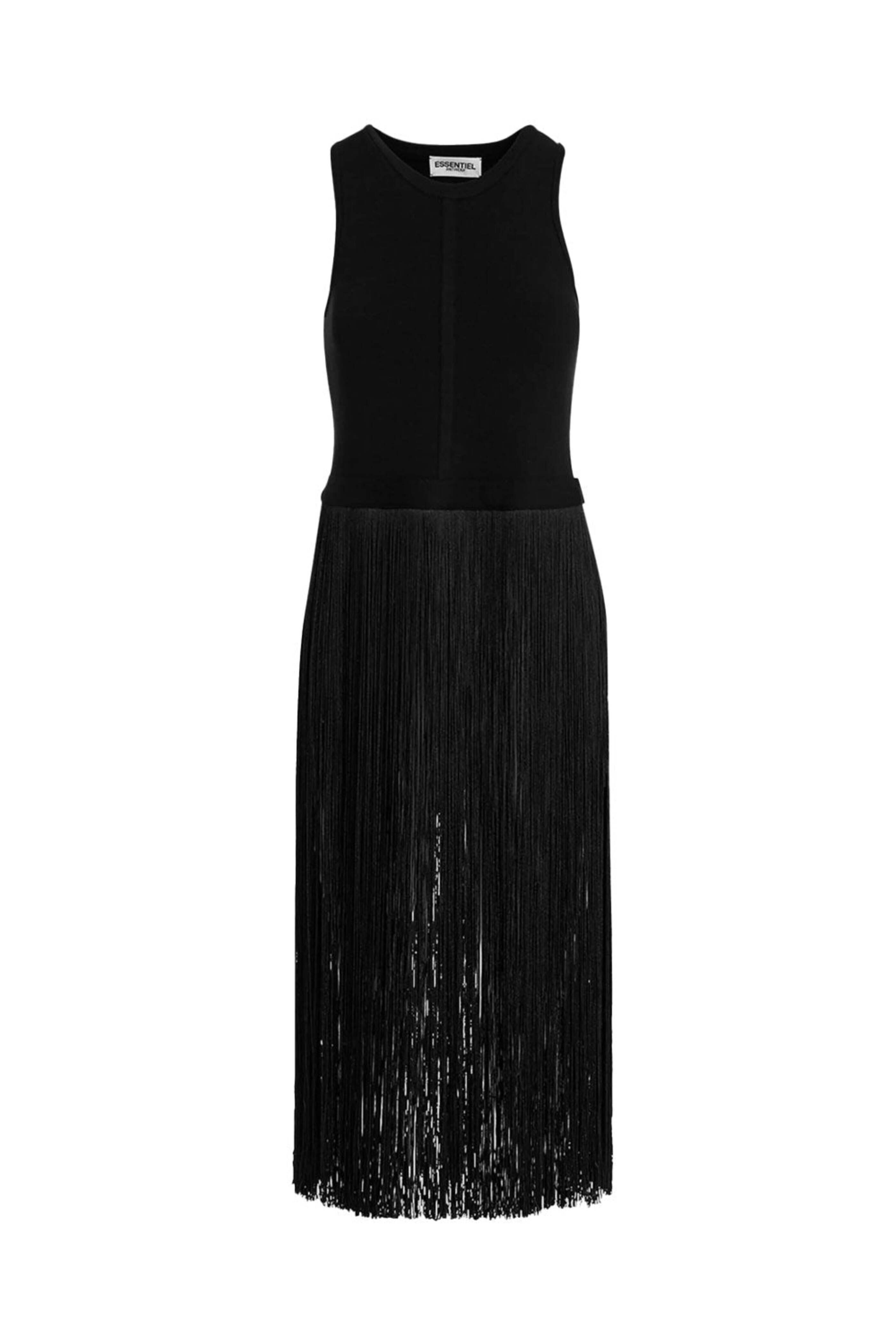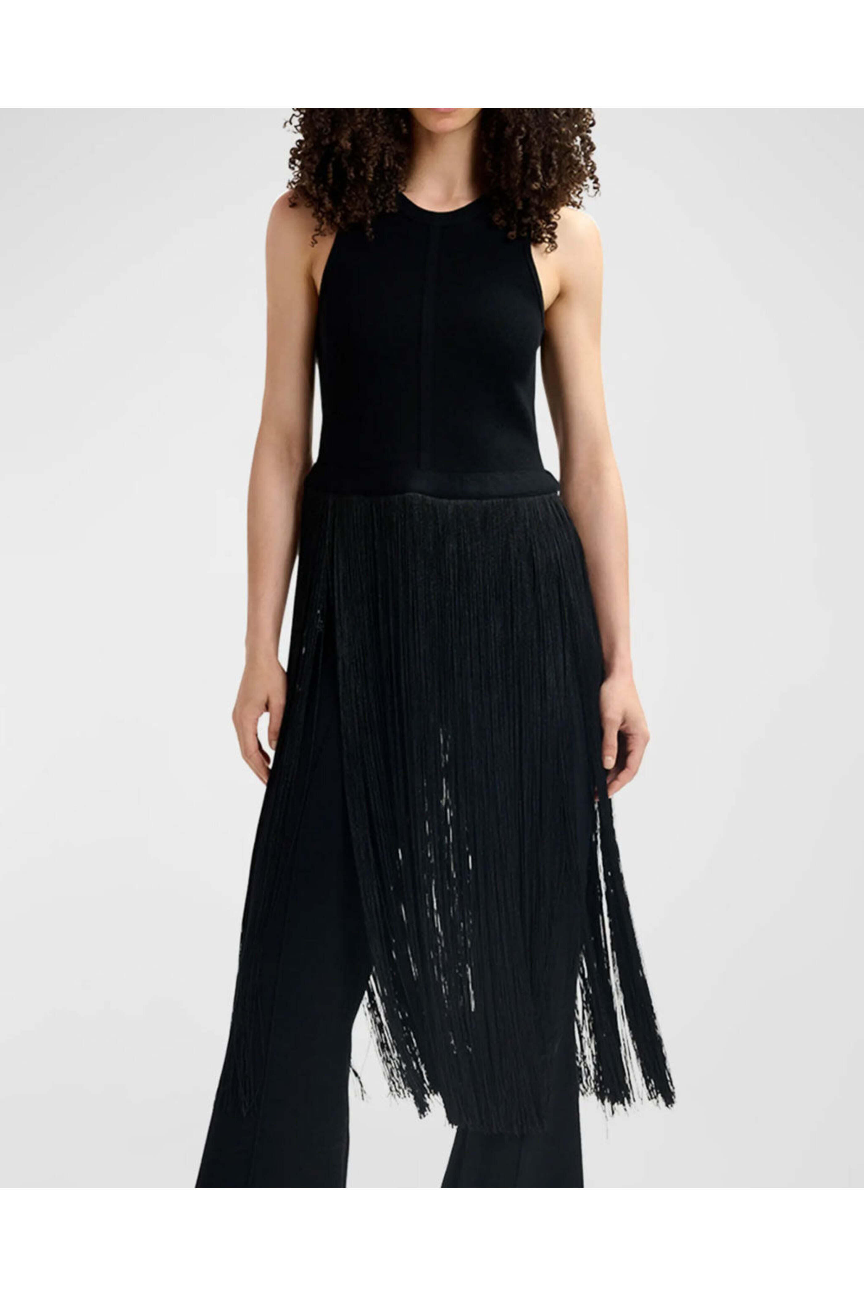 Essentiel Antwerp Black Gabbers Long Fringe Top . Approx. 47" from shoulder to hem . Round neckline . Sleeveless . Slim fit . Pullover style . Viscose/polyester . Hand wash .