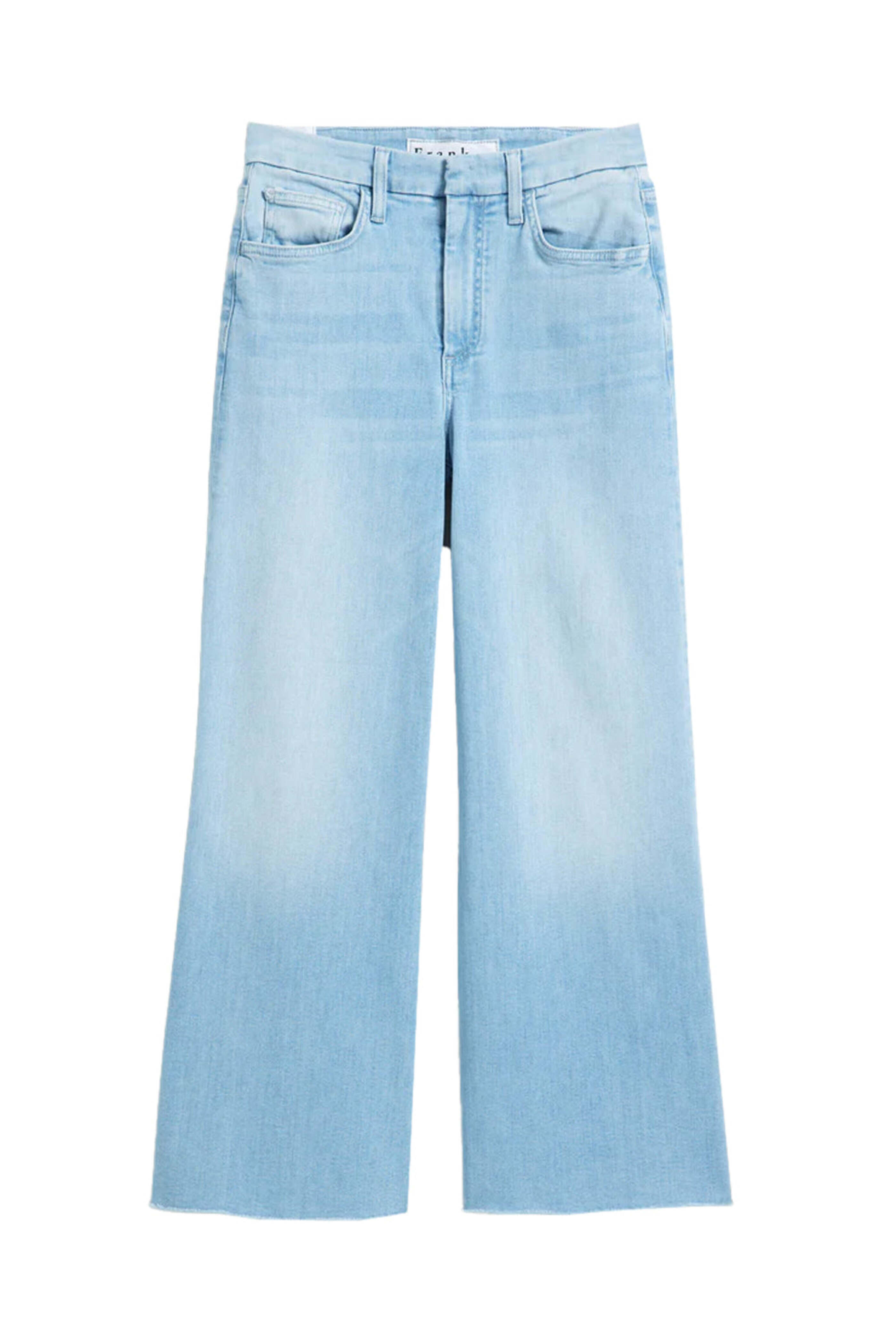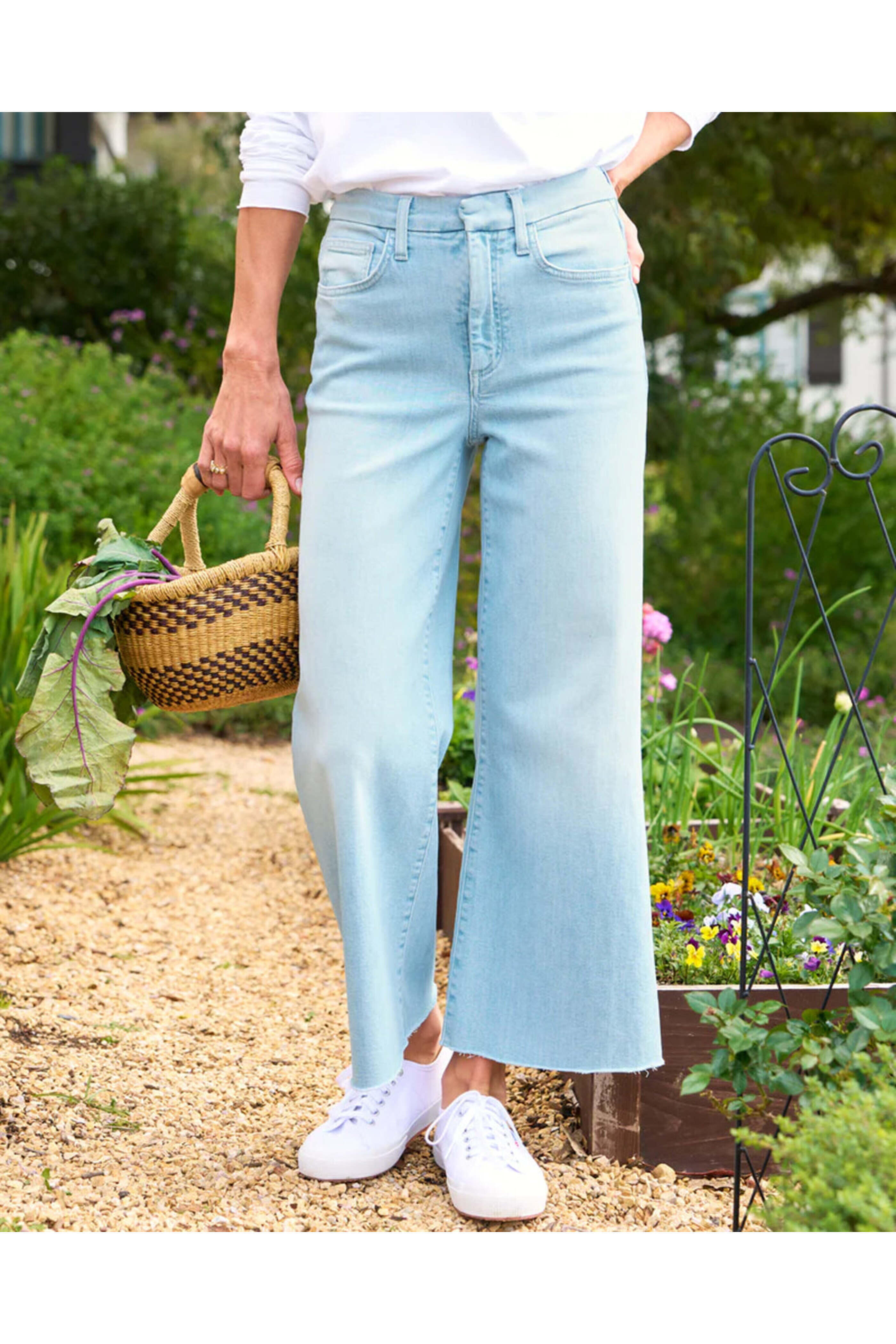 Mid rise. Hook and eye closure. Zip fly. Belt loops. Five pocket style. Straight silhouette. Wide through leg. Cropped length. Raw hem. Frank & Eileen Galway Denim Gaucho in Super Wash. 92% cotton, 6% polyester, 2% elastane.