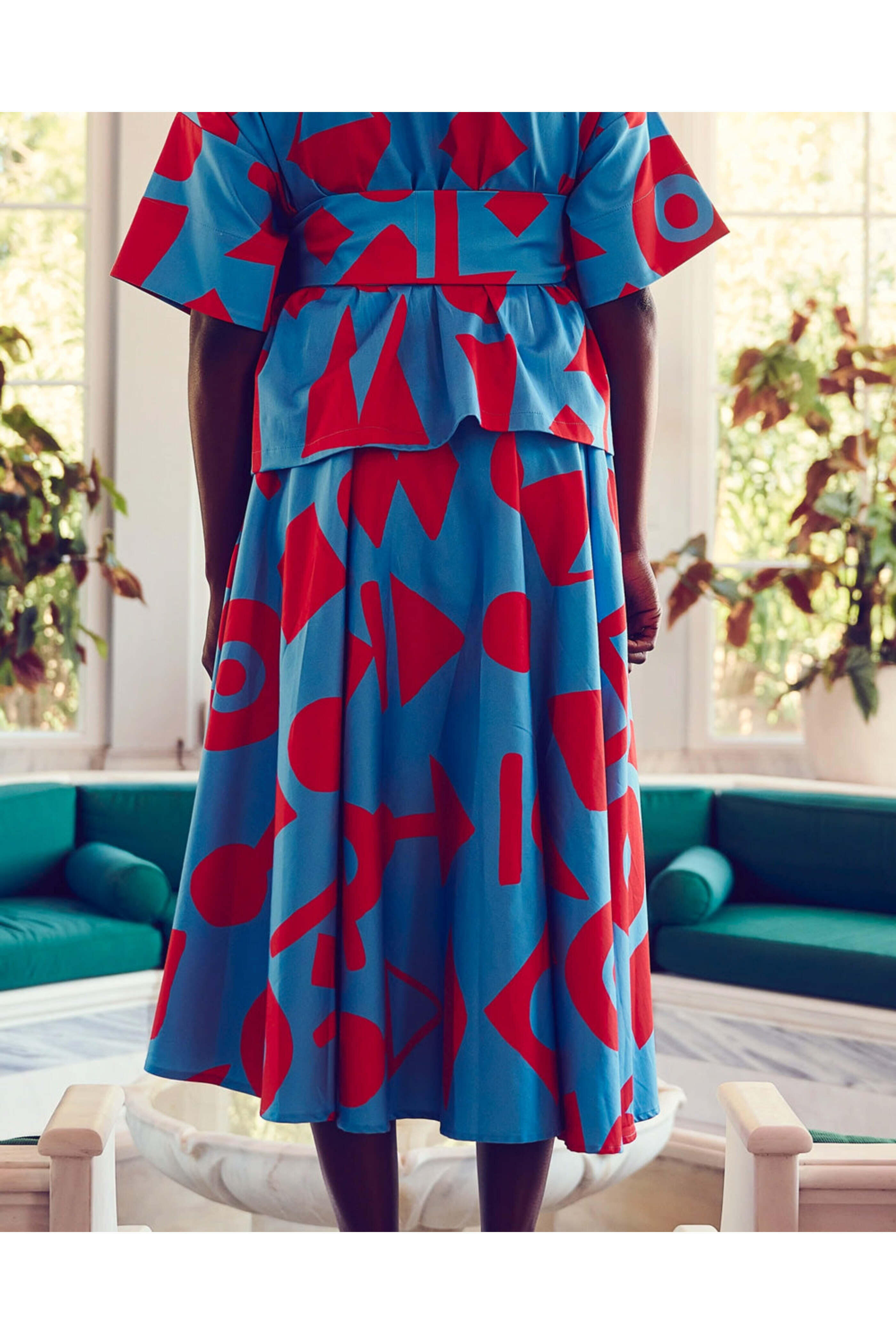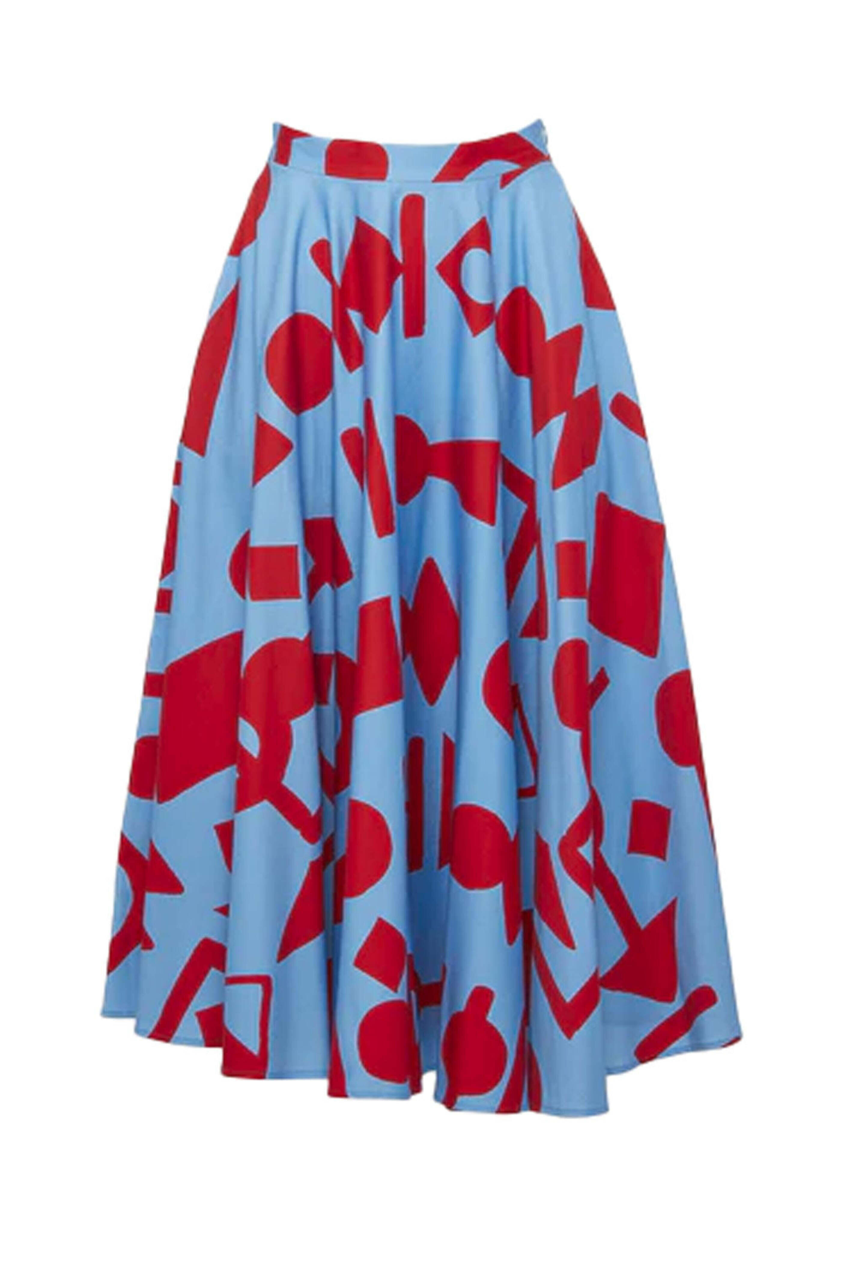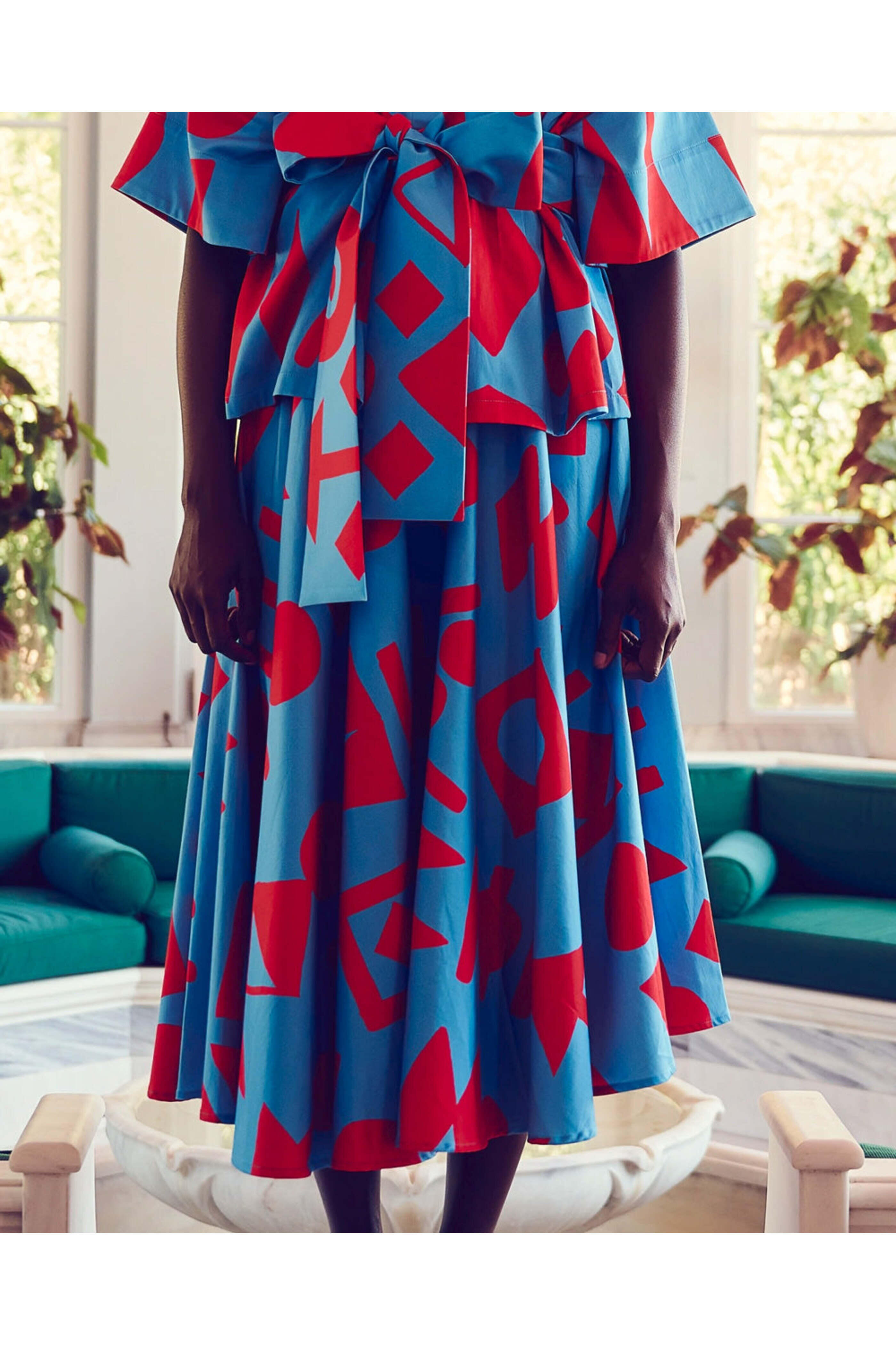 Rianna + Nina Mikado Blue Geometria Circle Skirt Grace. High rise. Zip closure. Midi skirt. Fluid silhouette. Relaxed fit. Unlined. 70% cotton, 3% elastane.