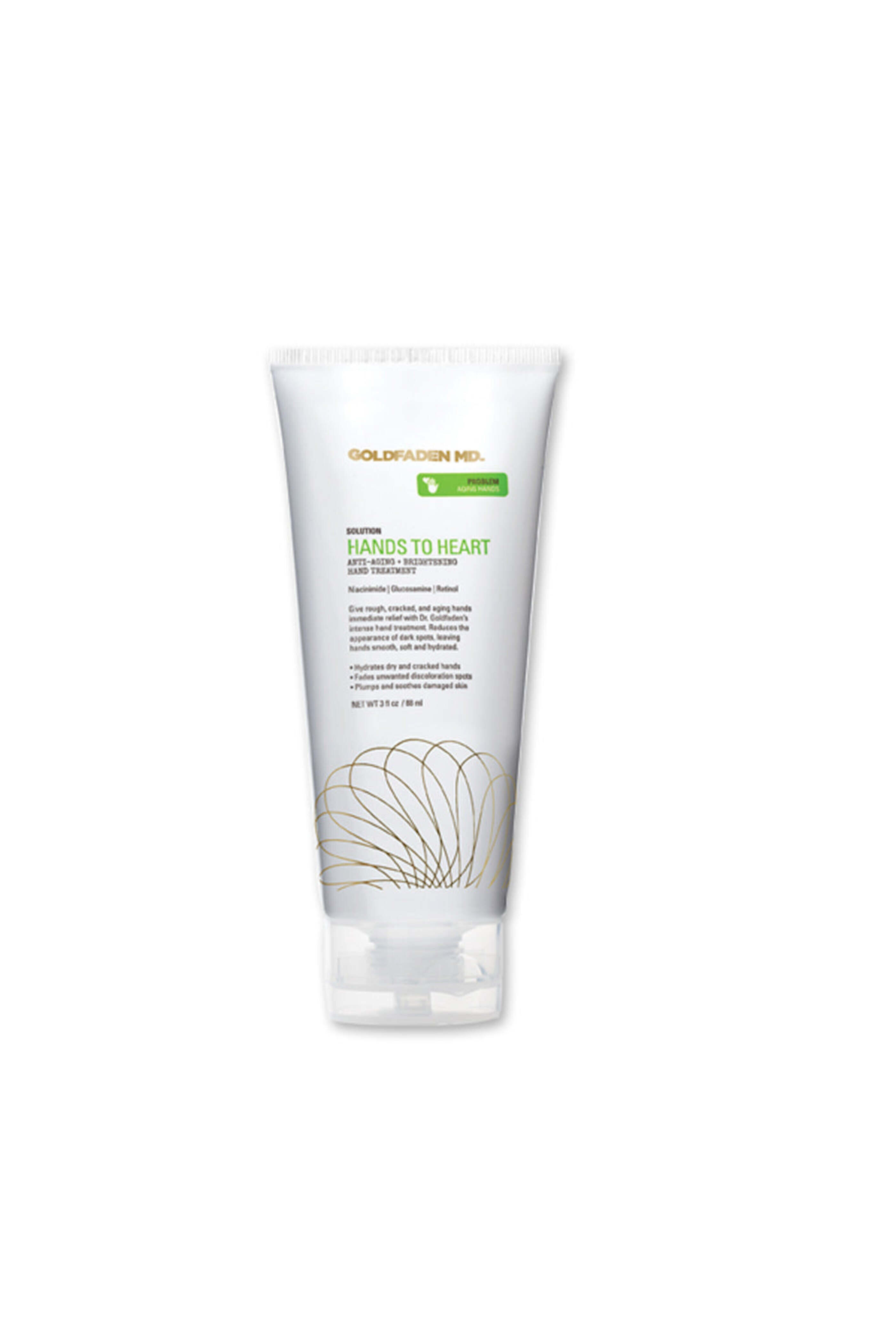 - Goldfaden MD Hands to Heart Treatment Anti-aging and brightening hand treatment that give rough~ cracked and aging hands immediate relief. Hydrates dry and cracked hands Fades unwanted discoloration spots Plumps and soothes damaged skin How to use: Massage a liberal amount onto the hands~ focusing on the top of the hands~ until fully absorbed. 3fl oz~ 88ml