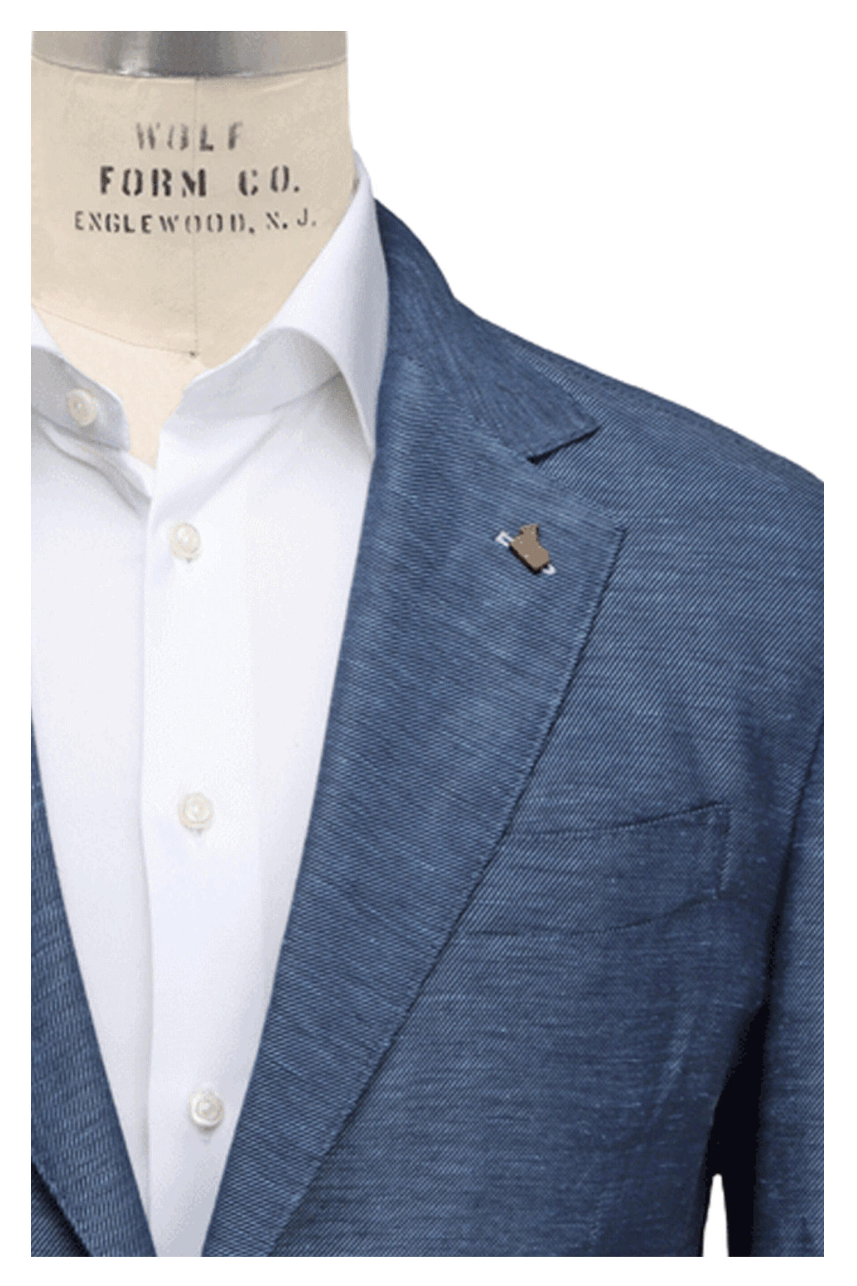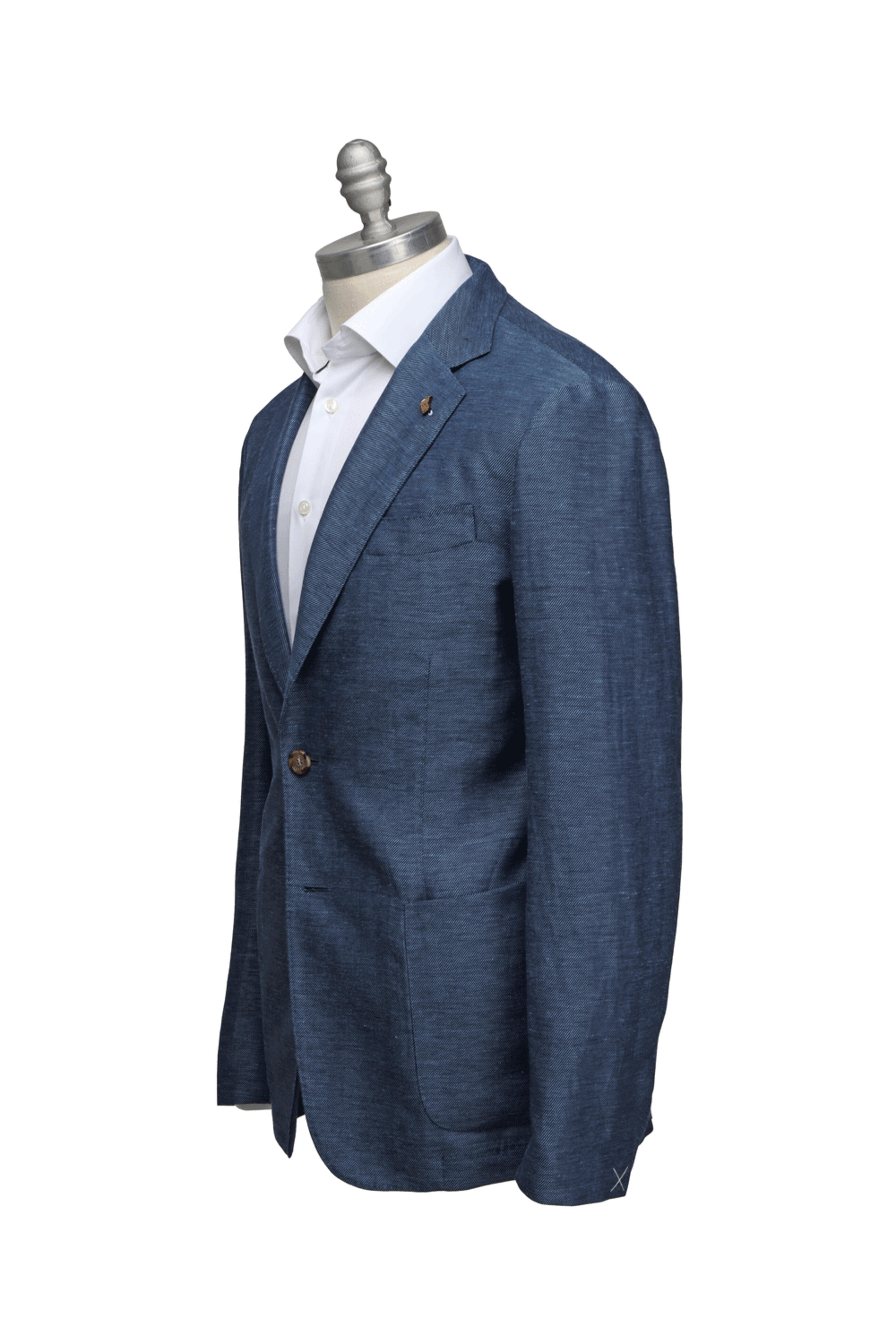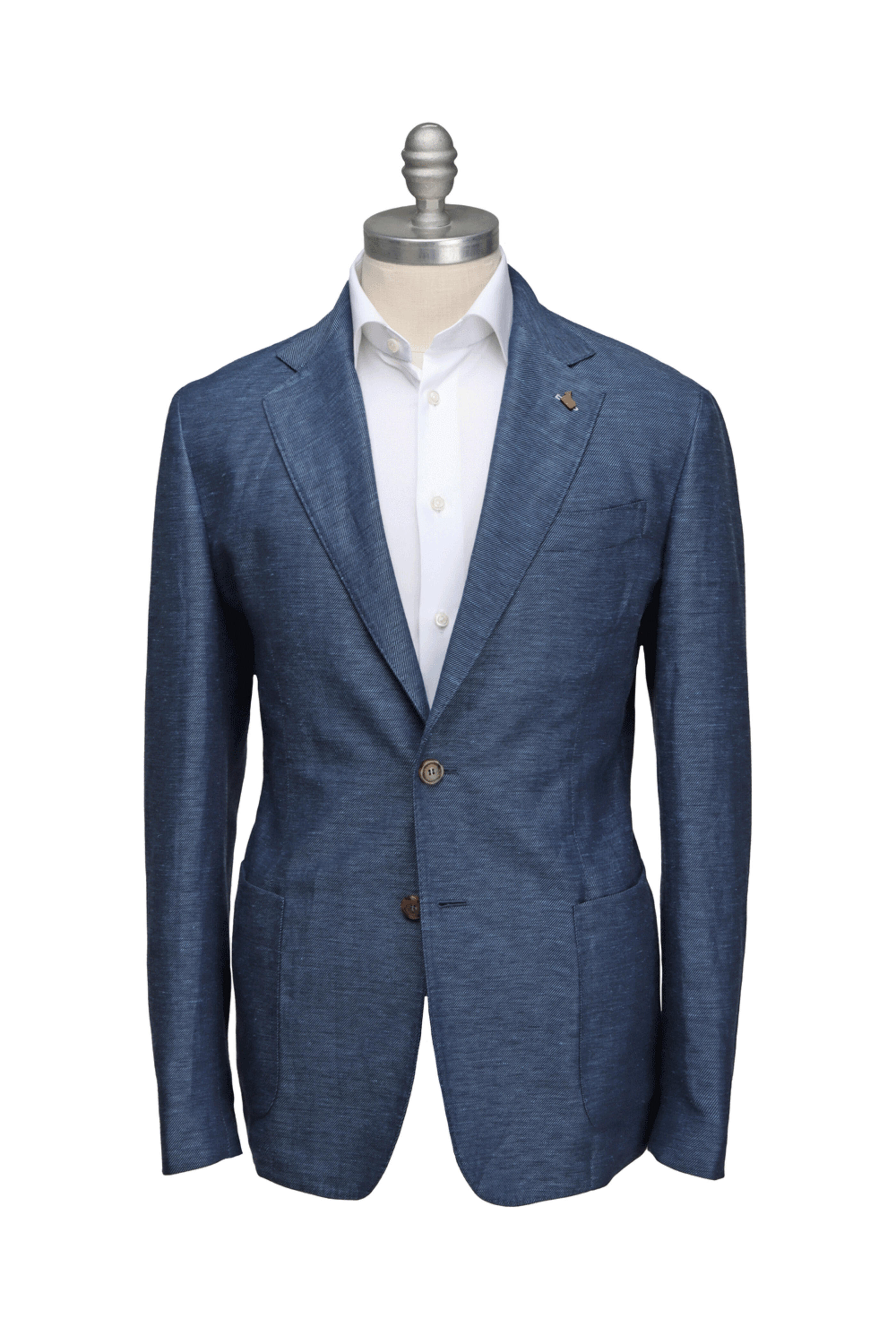 Colombo Bluette Sportcoat. Notch lapels. Left lapel buttonhole. Left chest welt pocket. Button front closure. Waist patch pockets . Interior pockets. Unfinished buttonholes. Double back vents. Lined sleeves. Made in Italy . 66% cashmere, 34% linen .