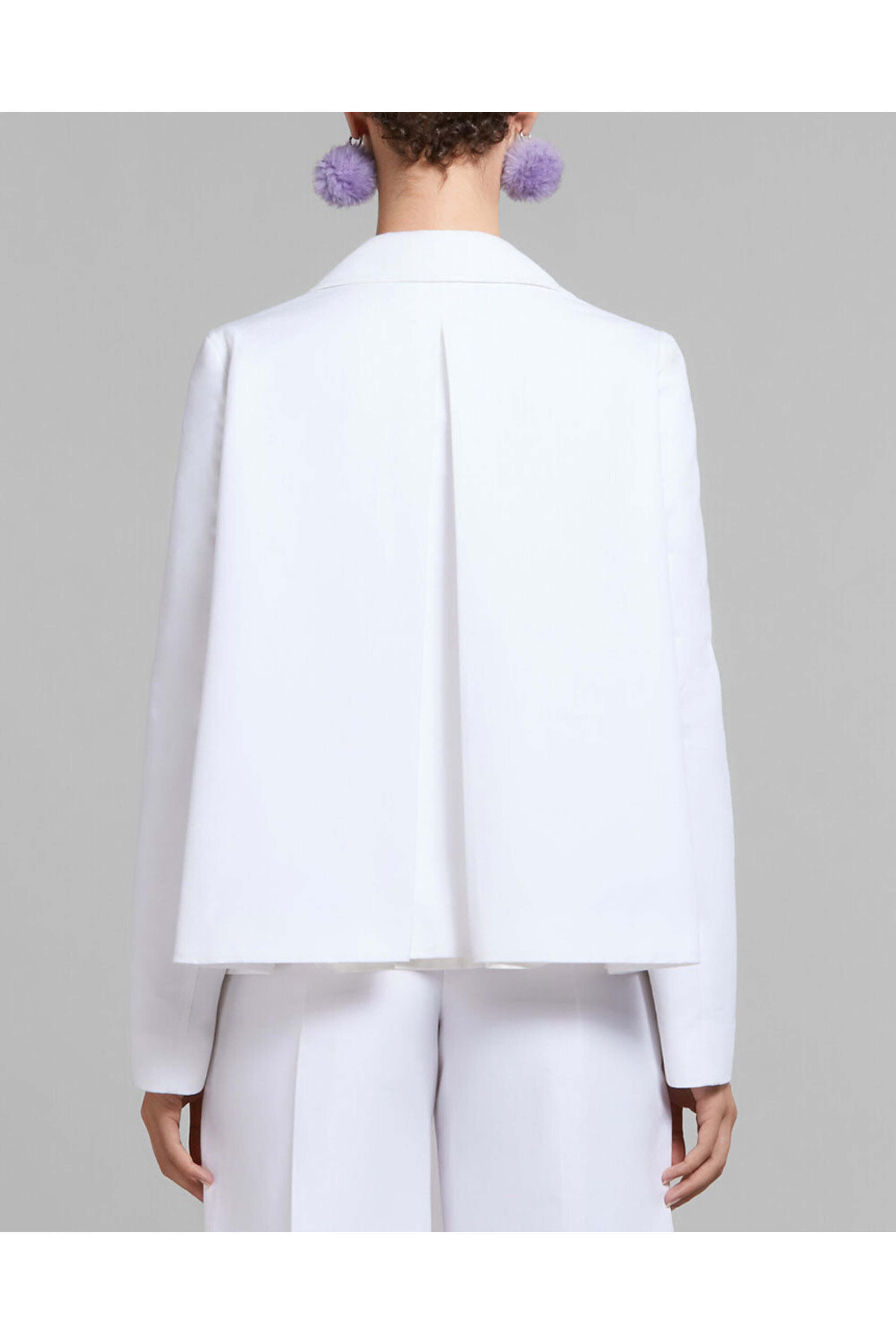 Marni Lily White Aline Cady Jacket. Notch lapel. Long sleeves. Front button closure. Side slip pockets. Pleated back yoke. Aline silhouette. Lined. Made in Italy. 100% cotton outer, 52% viscose, 48% cupro lining.
