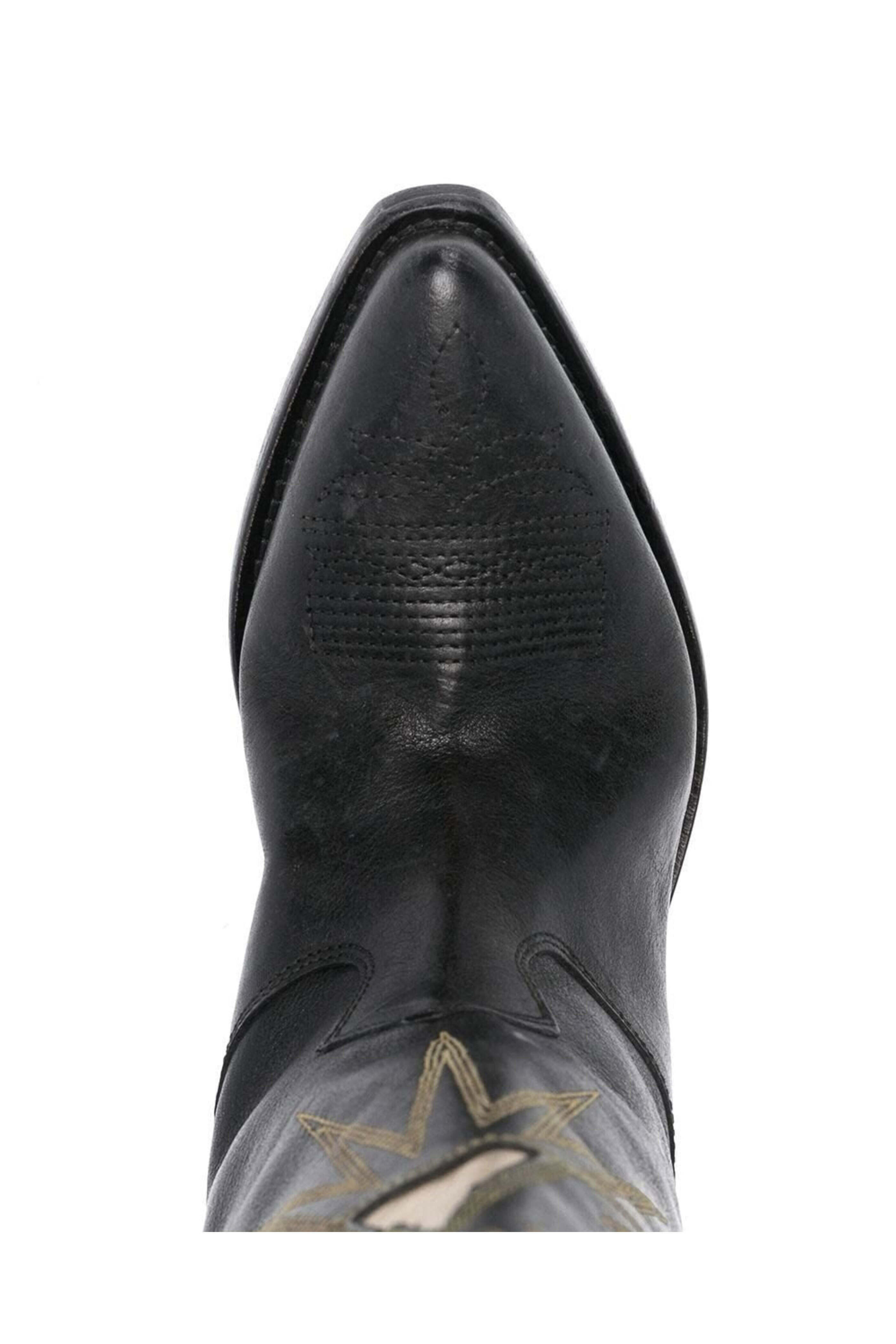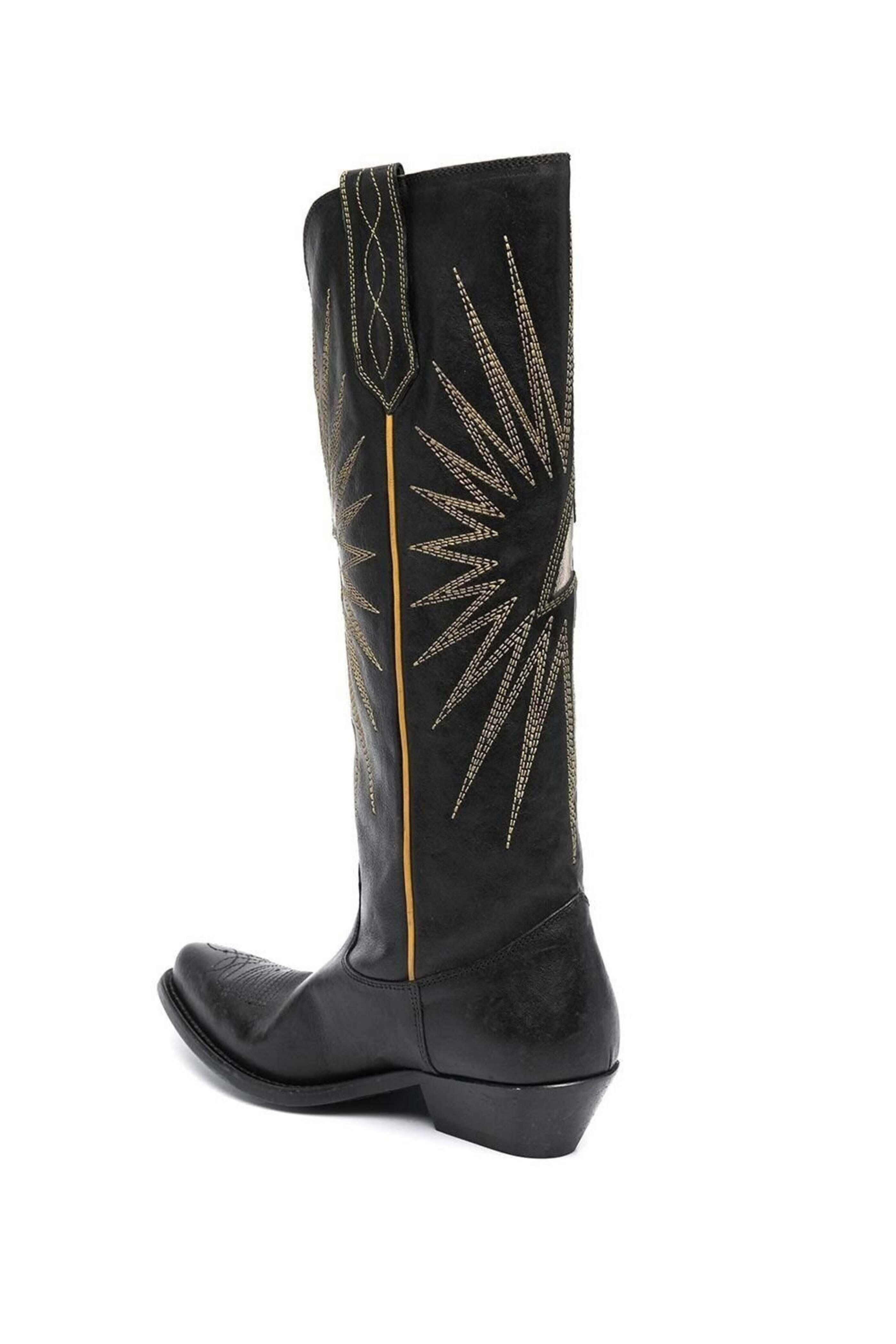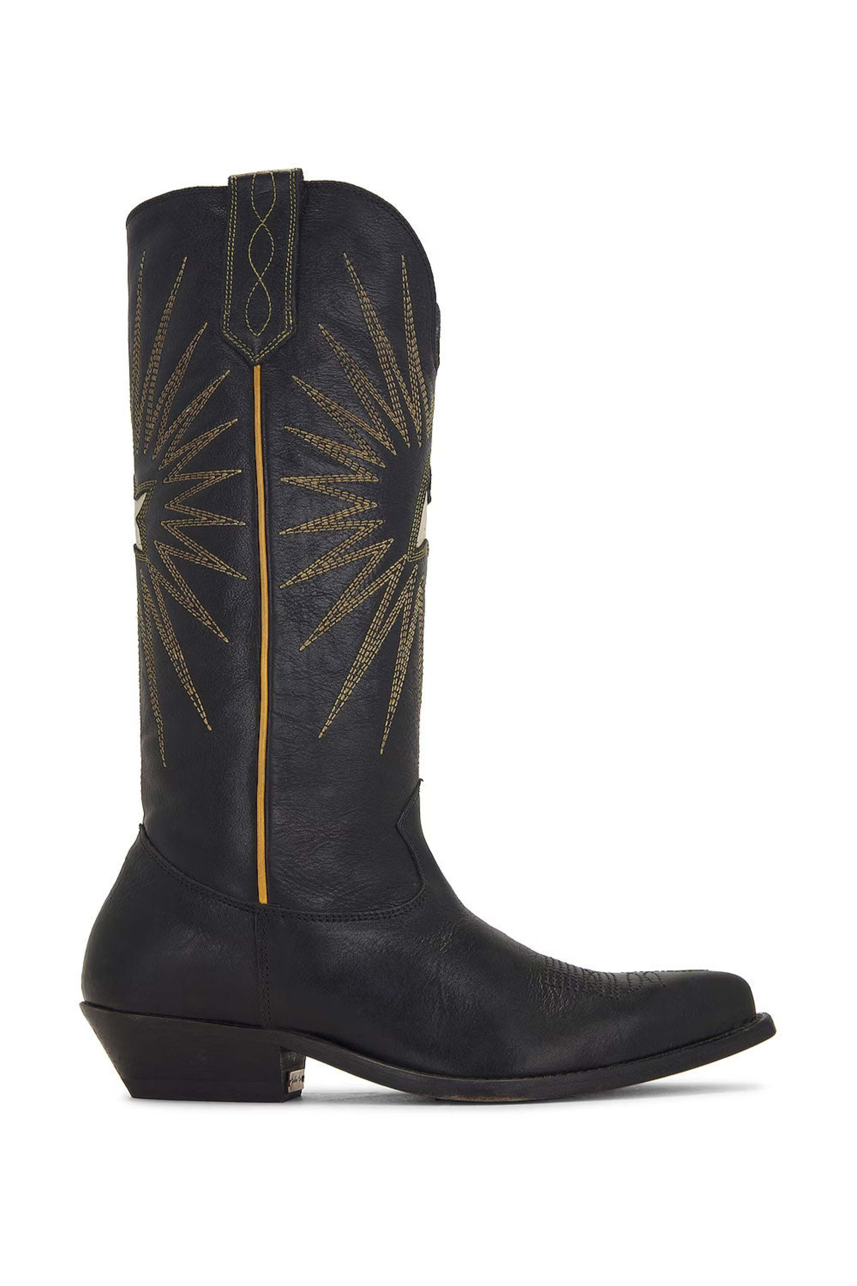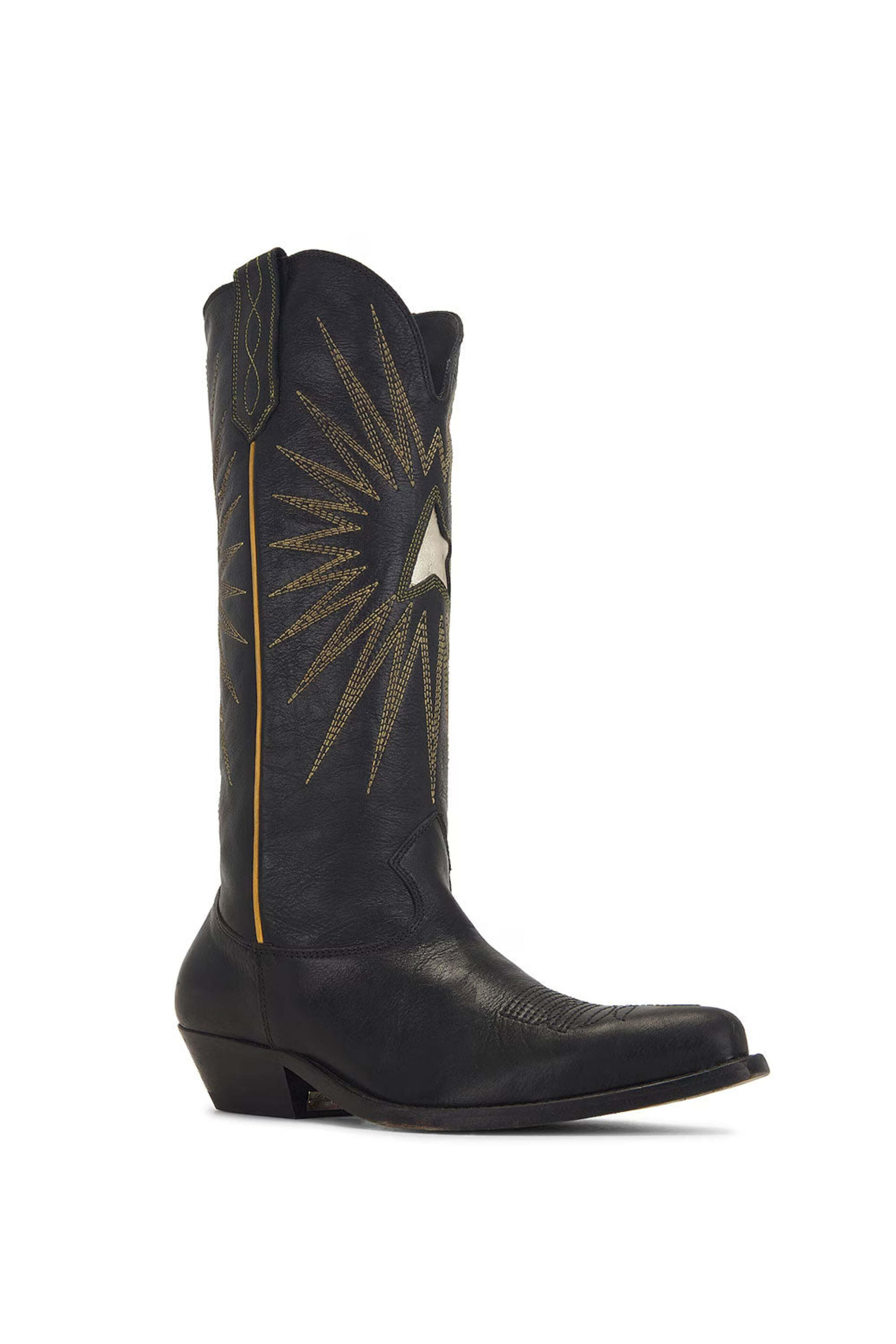 Golden Goose Wish Star Mid-Calf Boots. Pointed toe. Slip on. Heel height: 4 cm. Leg height: 40.5 cm. Platinum-colored laminated leather inlay star. Mustard-colored embroidery on the leg. Black embroidery on the toe. Ocher-colored piping detail. Gold-colored metal plaque engraved with the Golden Goose signature on the heel. Vintage finish. Made in Italy. 100% cow leather upper, lining, sole.