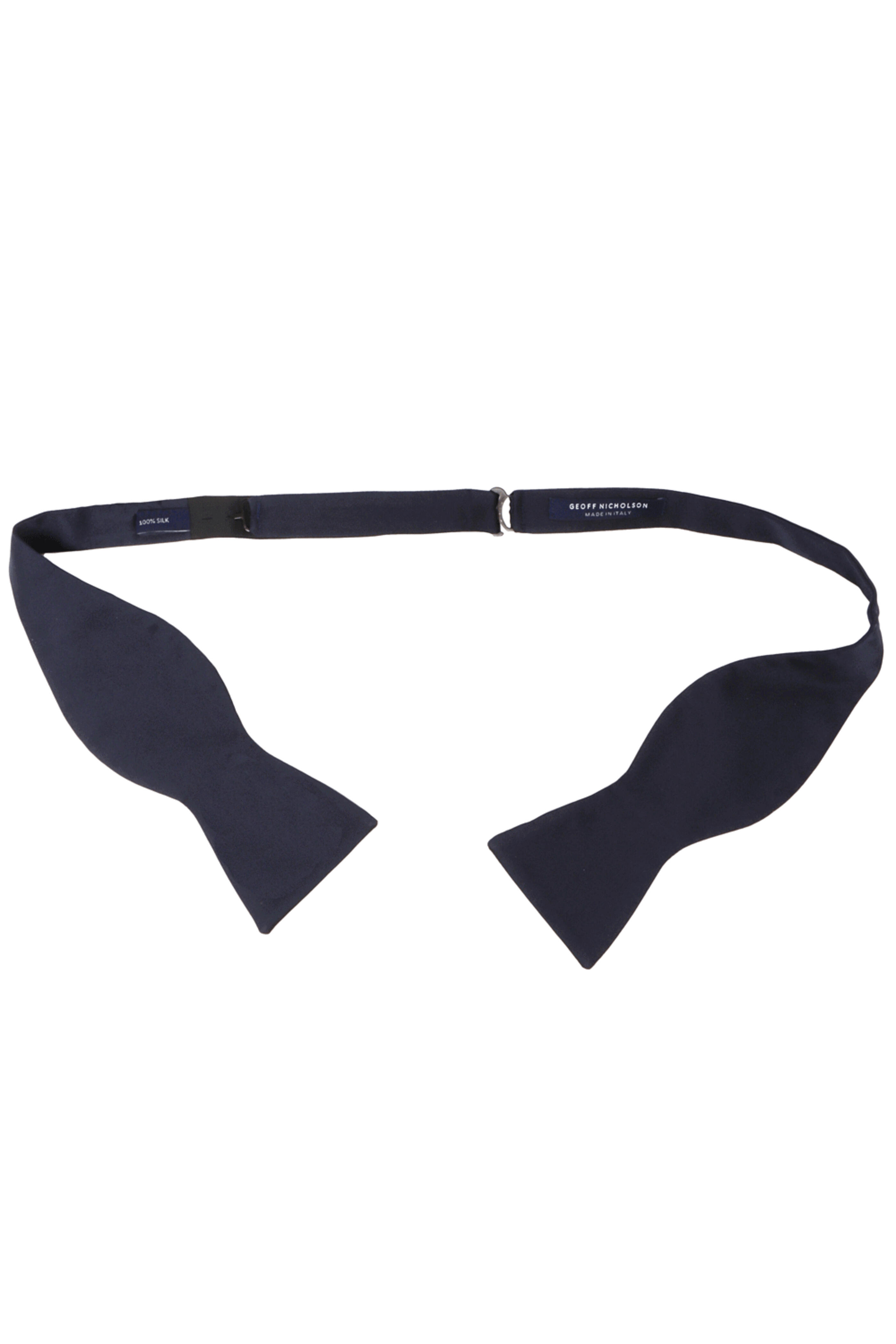 Geoff Nicholson Navy Silk Self Tie Bow Tie. Self-tie; adjustable. Made in Italy. 100% silk.