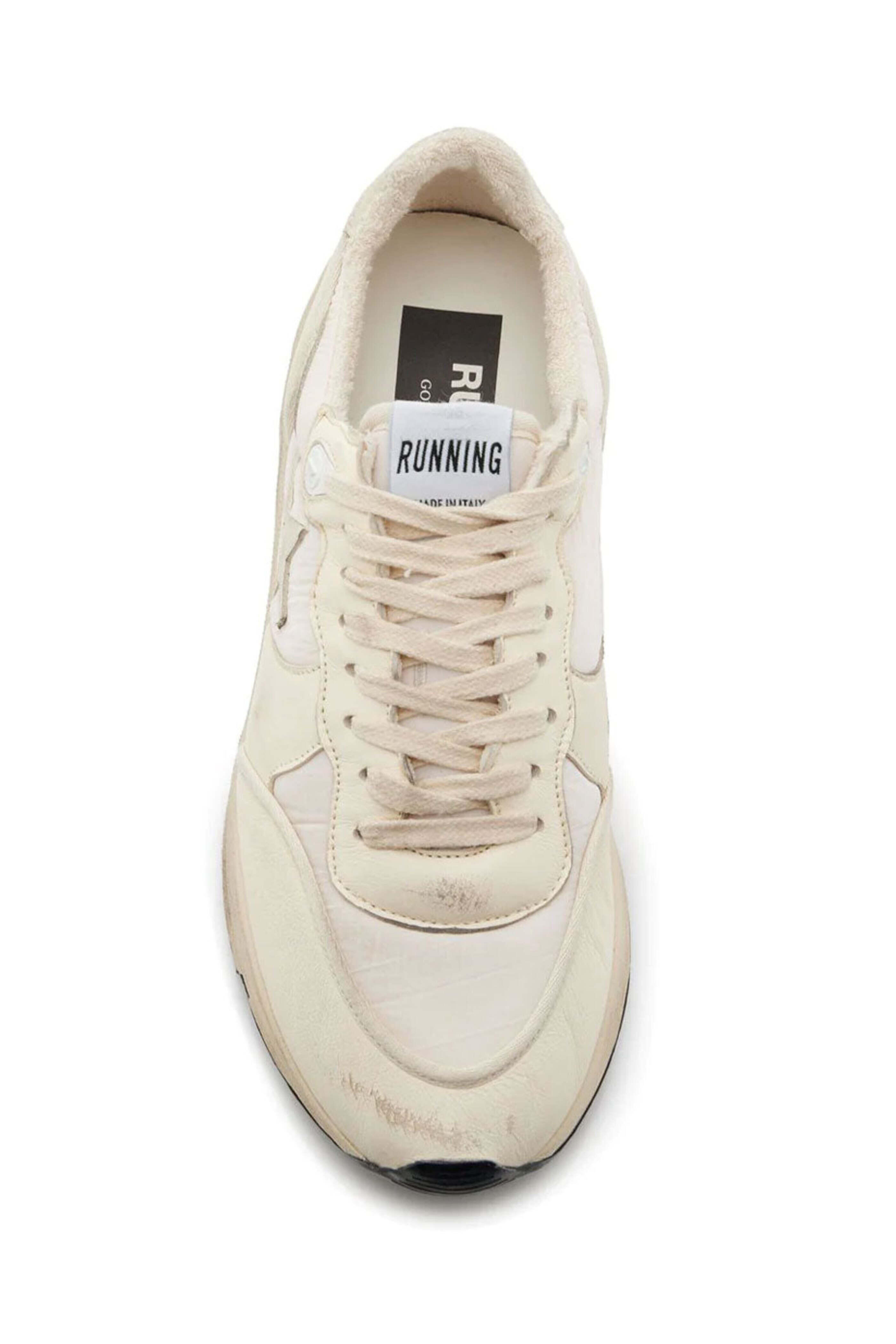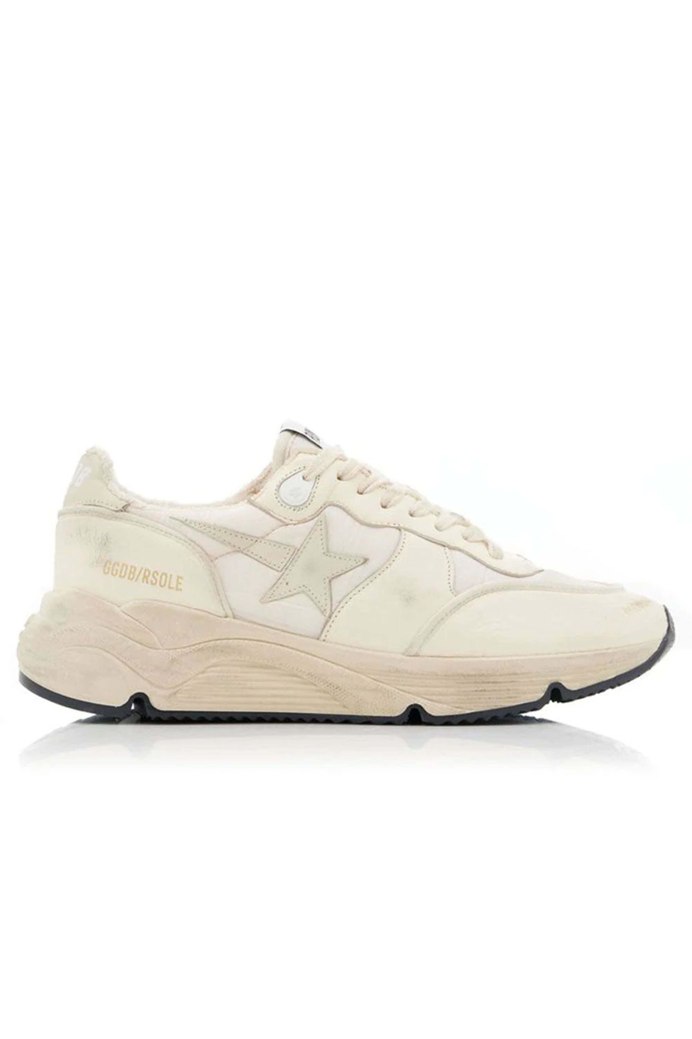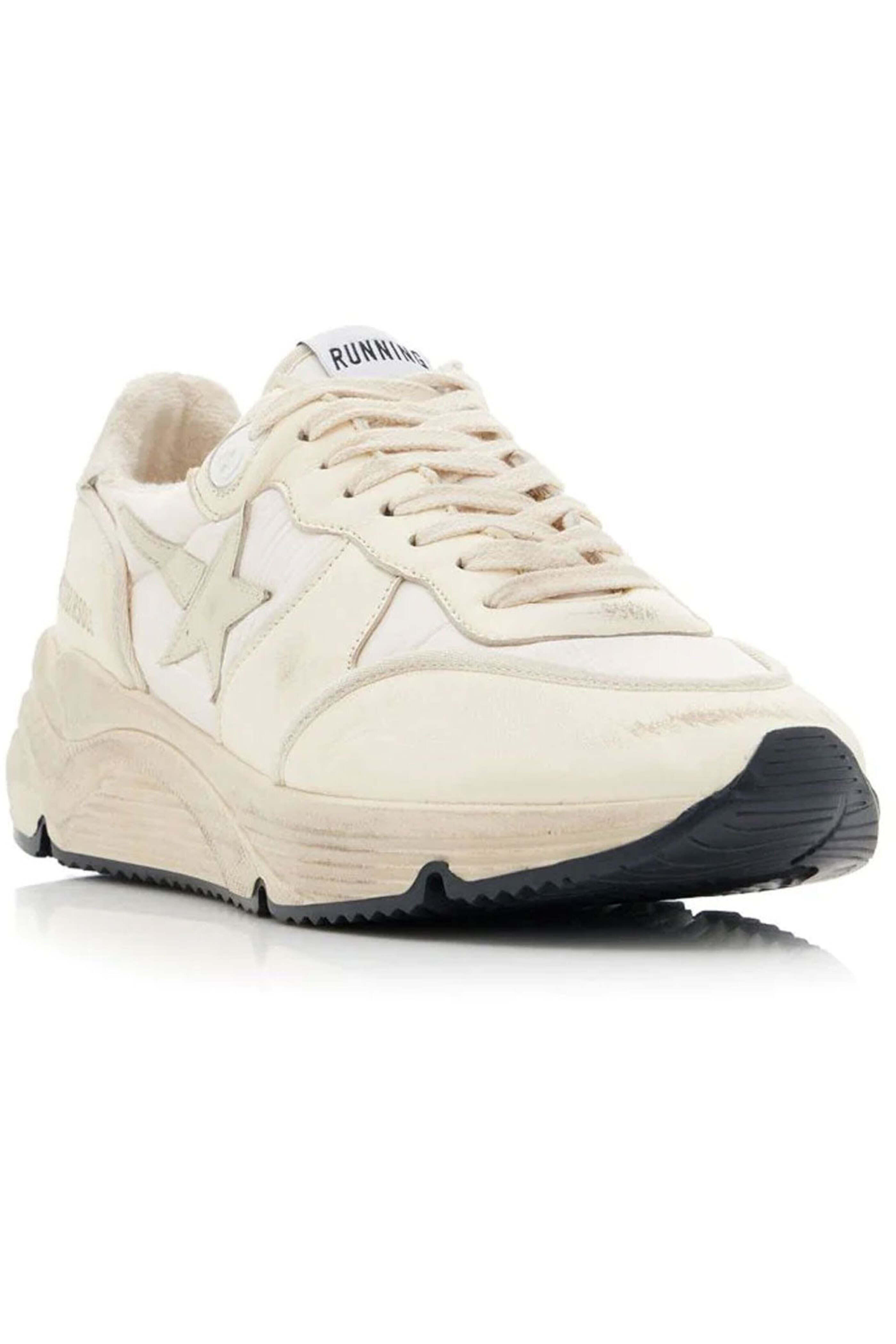 Golden Goose Running Sole Nylon Leather Sneakers in Beige. Round toe. Lace-up vamp. Chunky flat heel. Signature star on side. Leather and net fabric. Signature texture stained rubber outsole. Made in Italy.