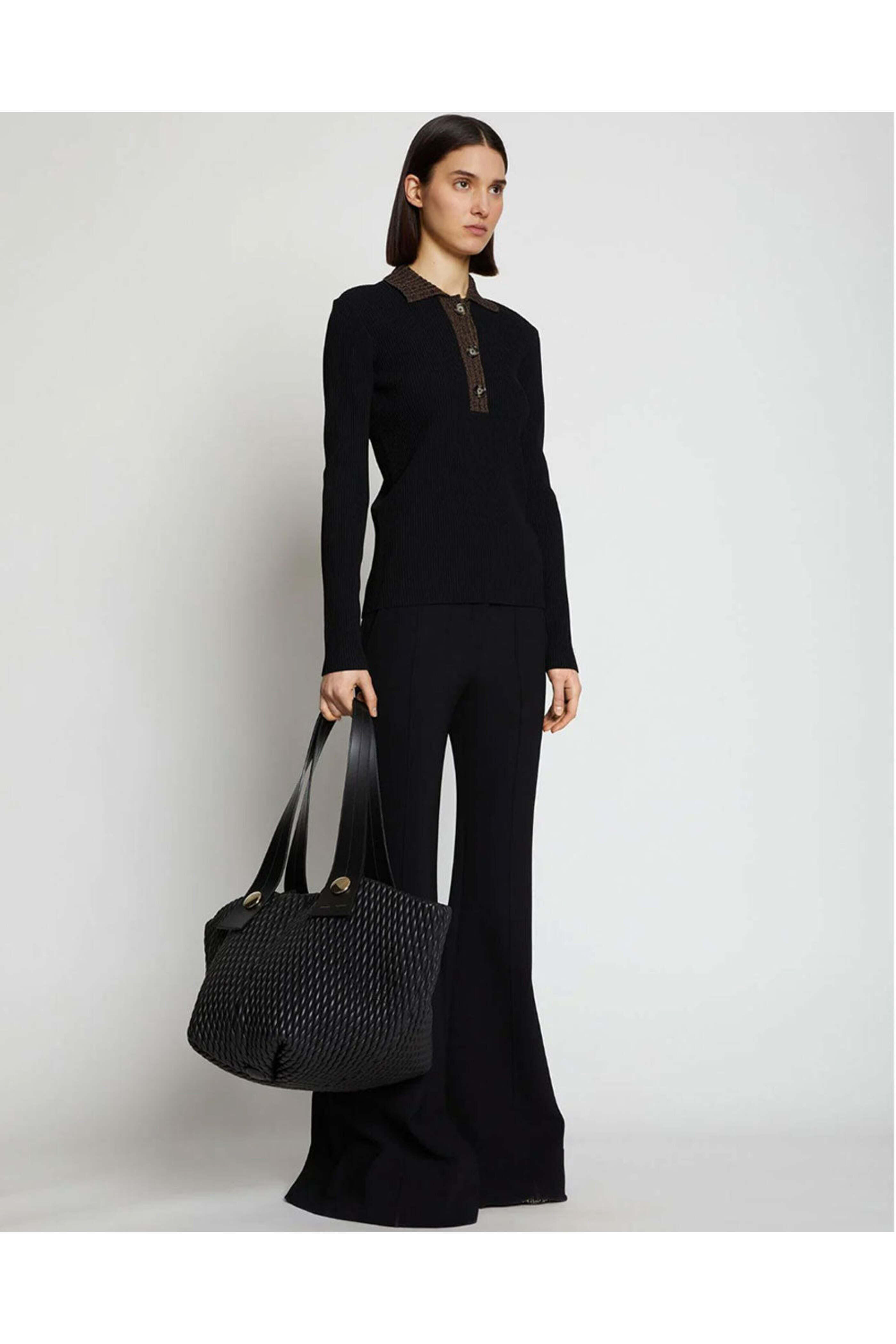 Proenza Schouler Large Quilted Tobo Tote in Black. Open top with tie closure. Double shoulder straps. Interior slip pocket. Gold tone hardware. Quilted design. Calf leather outer. Suede lining. 19 L X 9.5 W. 13 handle drop. Made in Italy.