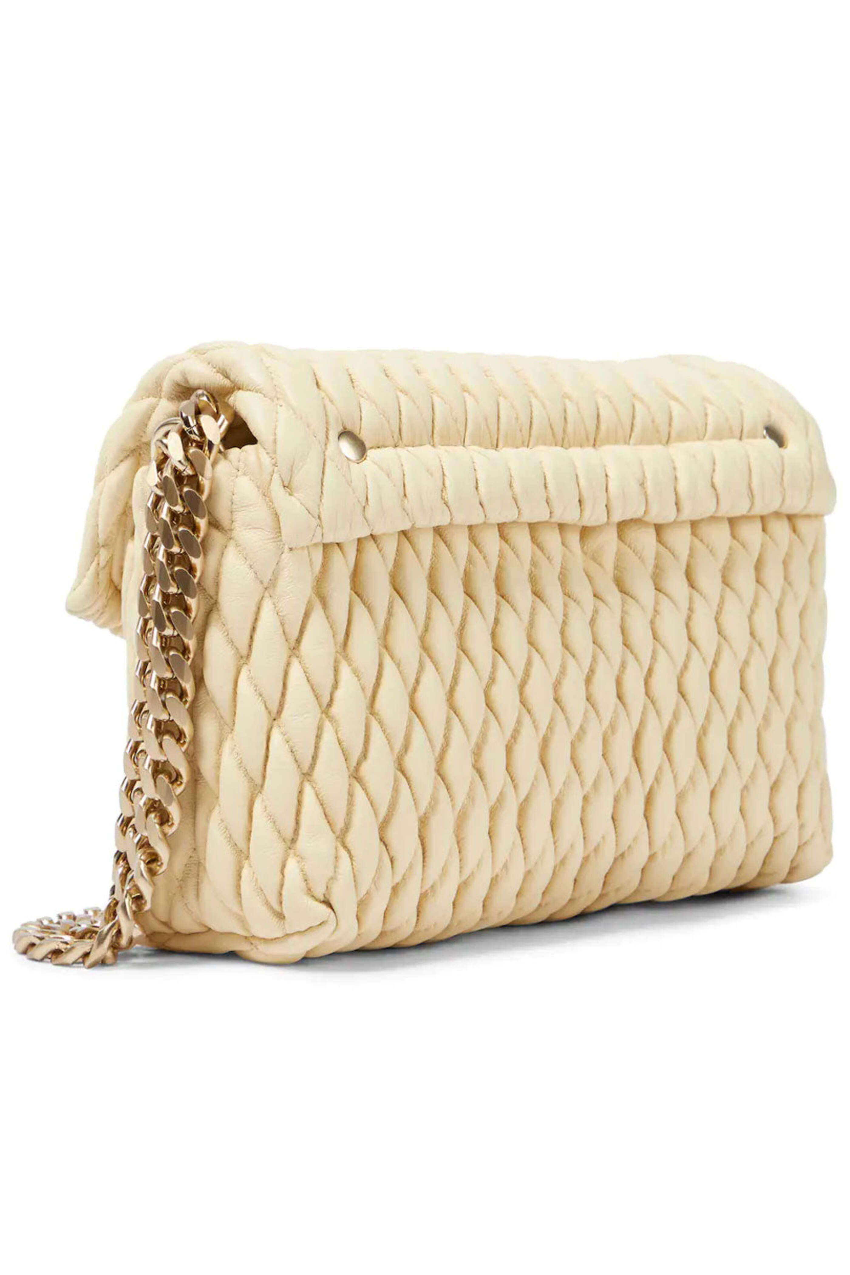 Proenza Schouler Small Harris Shoulder Bag in Pale Sand. Flap top with magnetic closure. Double chain shoulder strap. Two compartments. Interior card slot. Gold tone hardware. Quilted lambskin outer. Leather lining. 8 W X 5 H X 4 D. 40.5 chain strap length. Made in Italy.