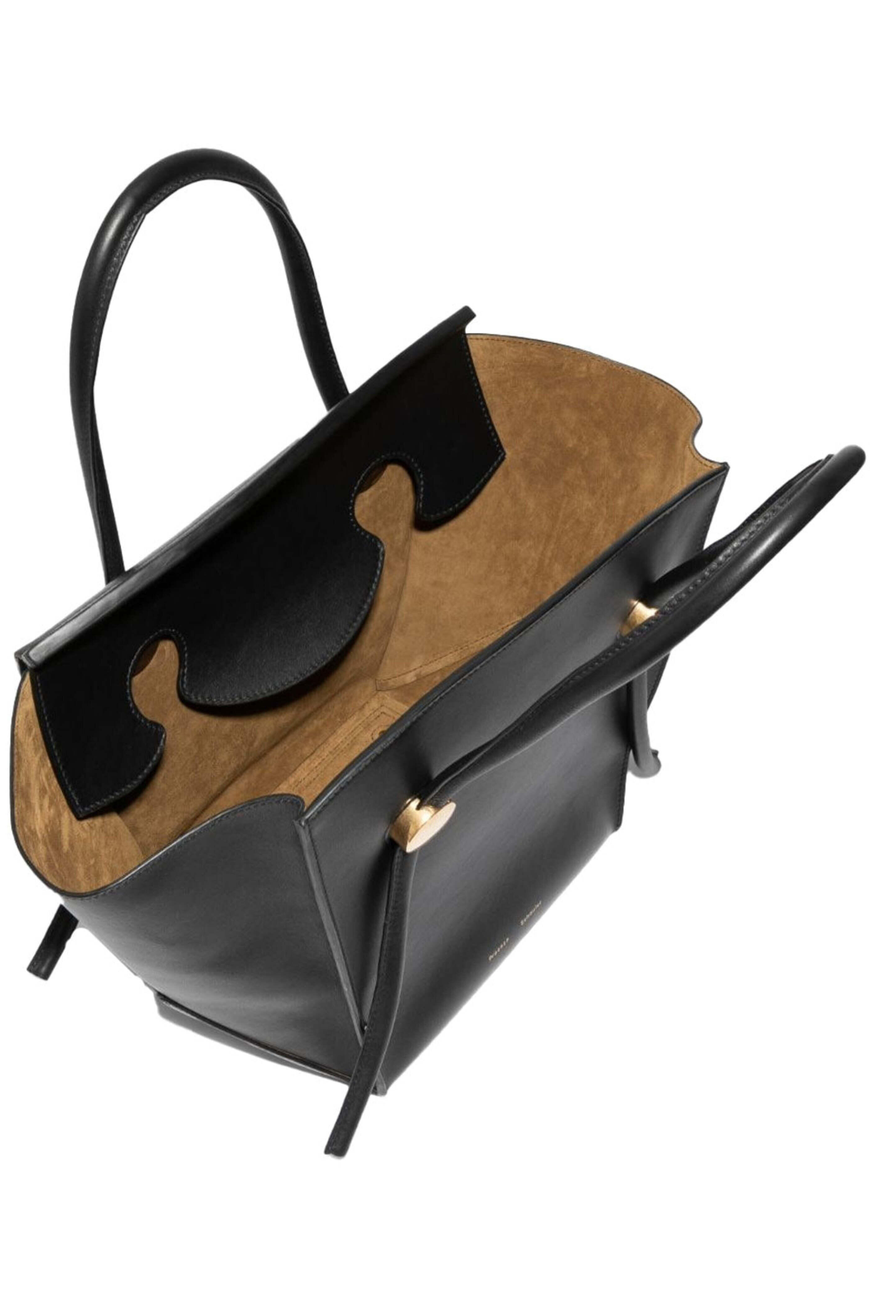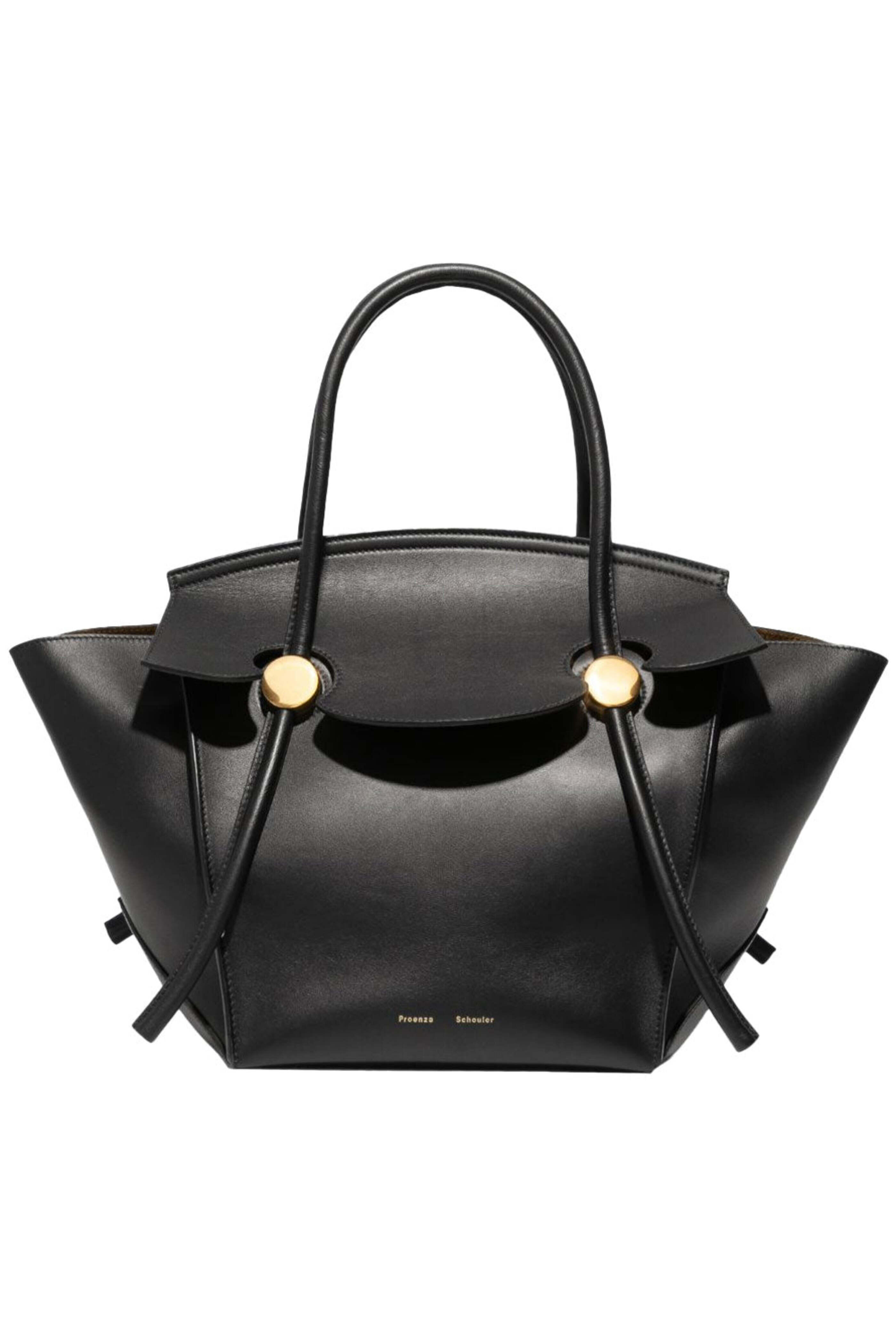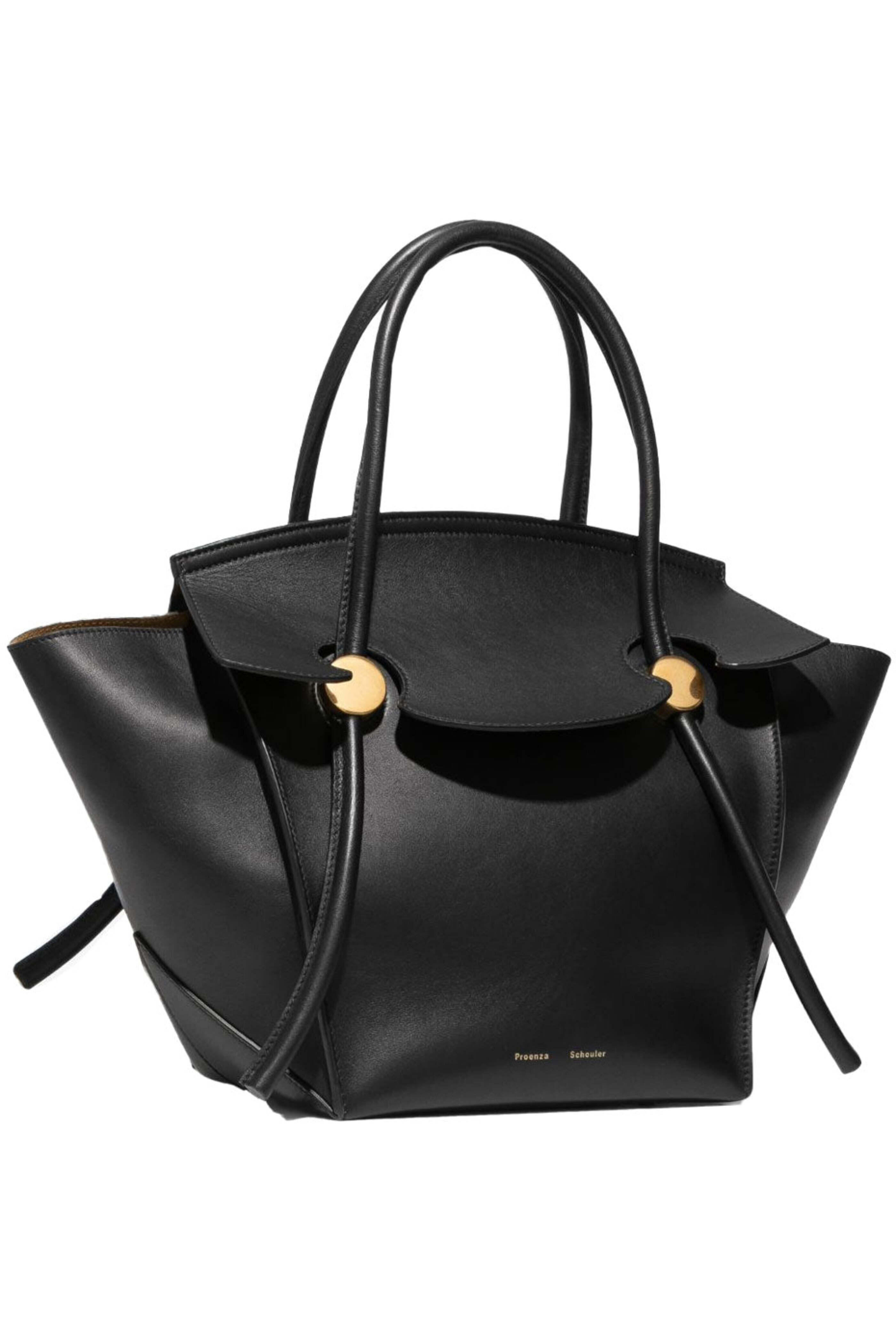 Proenza Schouler Pipe Bag in Black. Fold over top flap. Extended cord top handles. Interior card slot. Gold tone hardware. Hand painted edges. Signature logo stamp. Studs at the base. Calf leather outer. Suede lining. 21.5 W X 12.6 H 8.2 D. 5.1'' handle drop. Made in Italy.