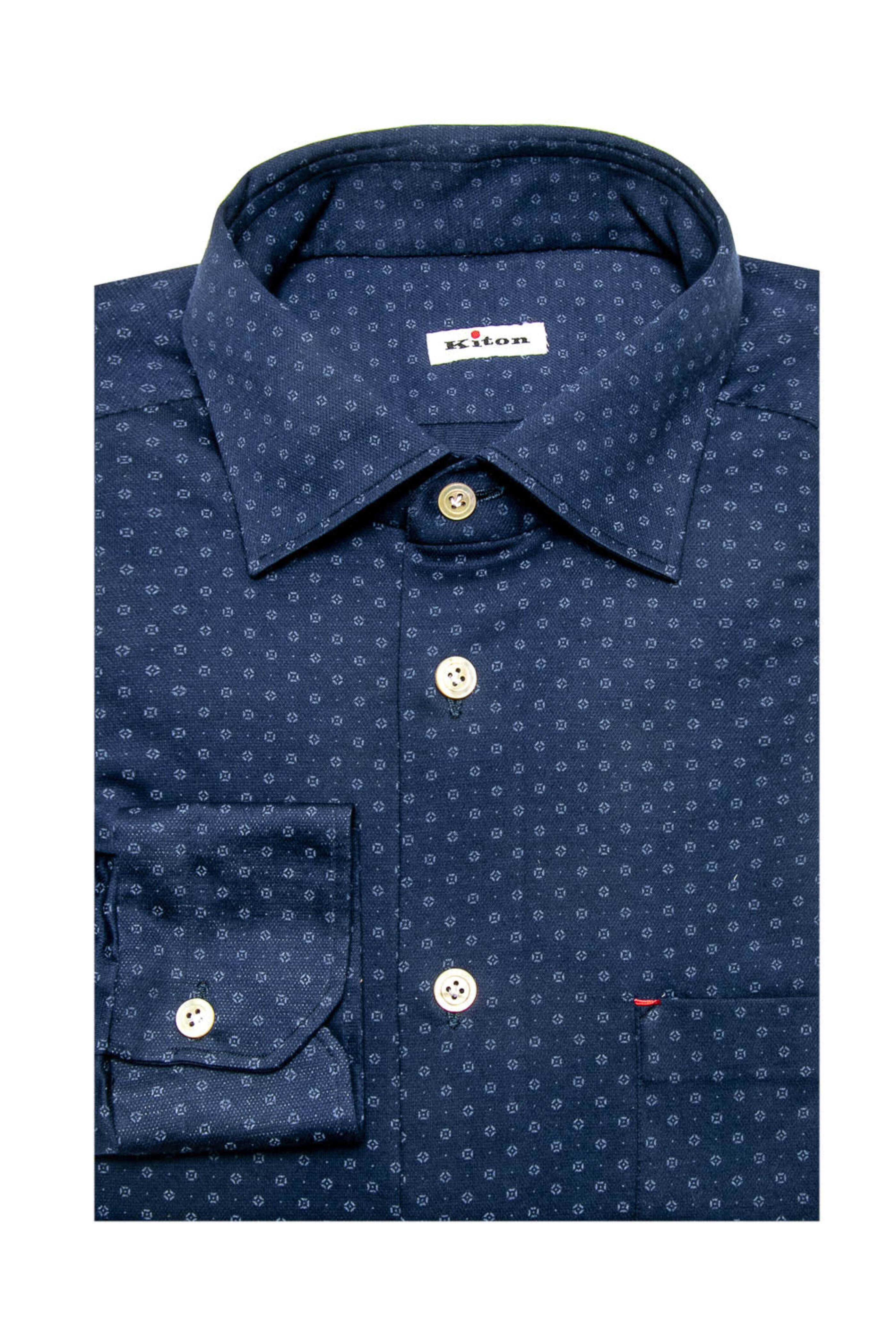 - Kiton Blue Geometric Print Jersey Knit Shirt Point collar Mitered cut cuff Single button cuff Front left chest pocket Pinctada Maxima mother-of-pearl buttons 100% cotton Handmade in Italy