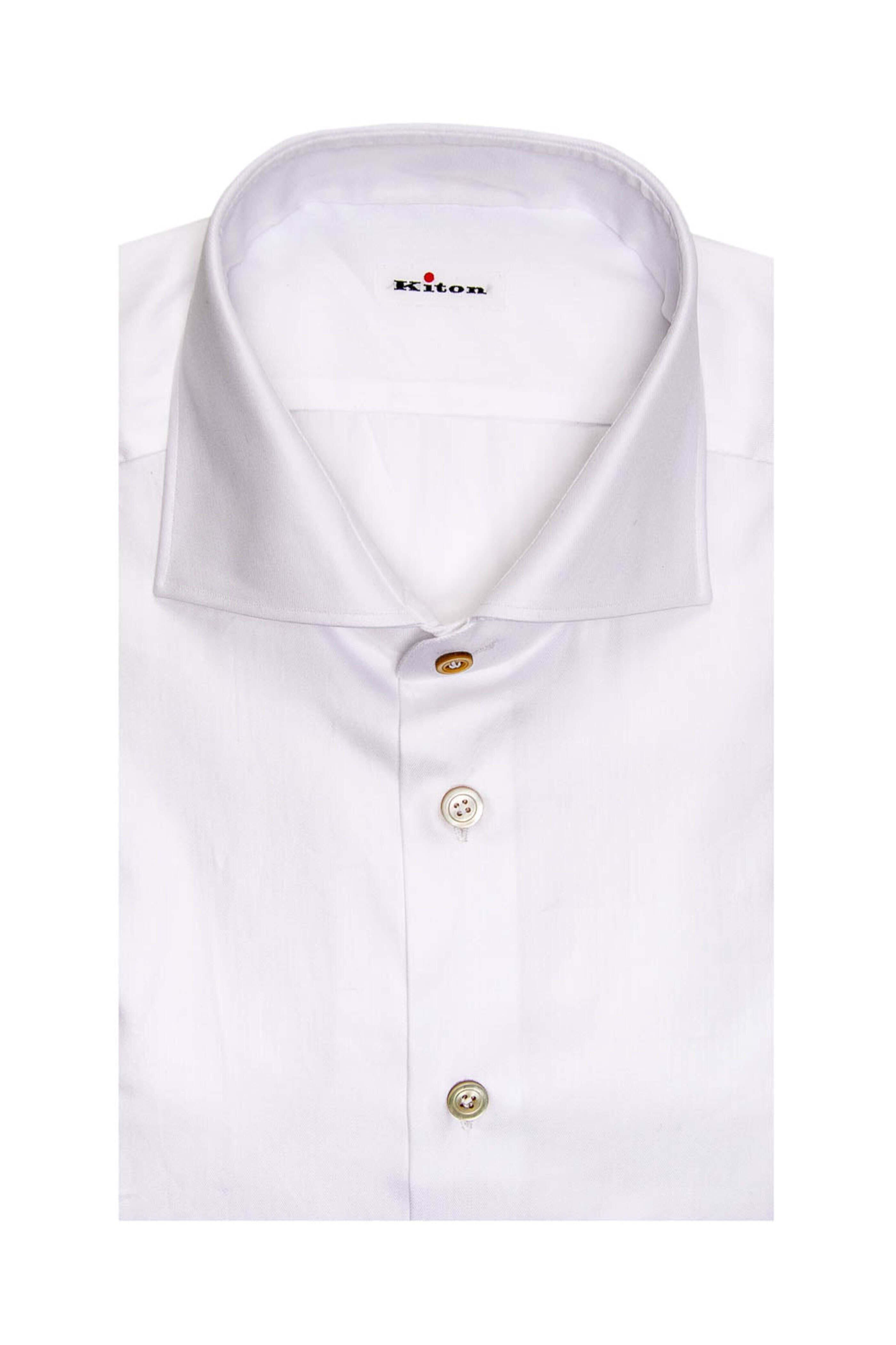 Kiton White Herringbone Dress Shirt Spread collar Rounded barrel cuff Single button cuff Pinctada Maxima mother-of-pearl buttons 100% cotton Handmade in Italy.