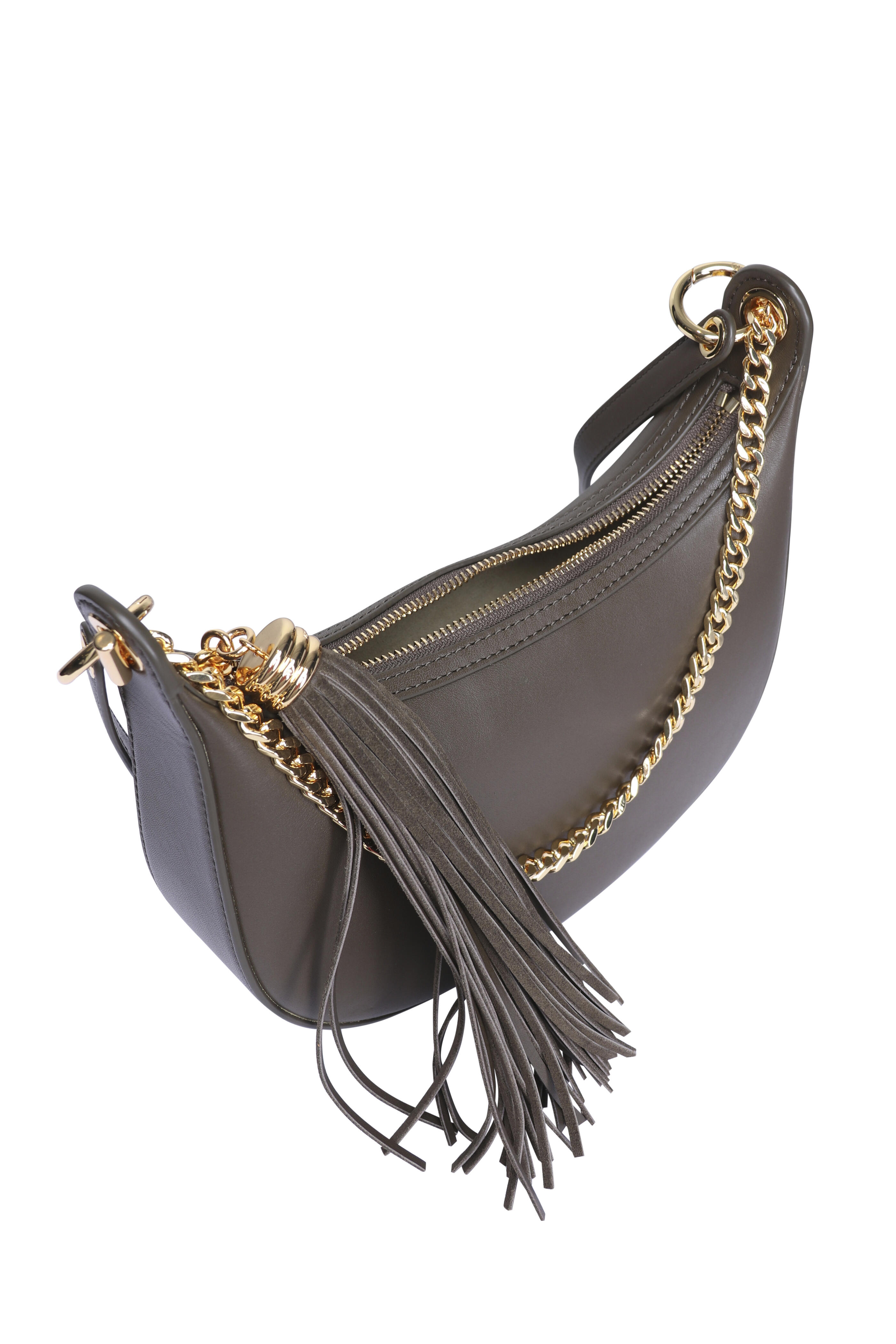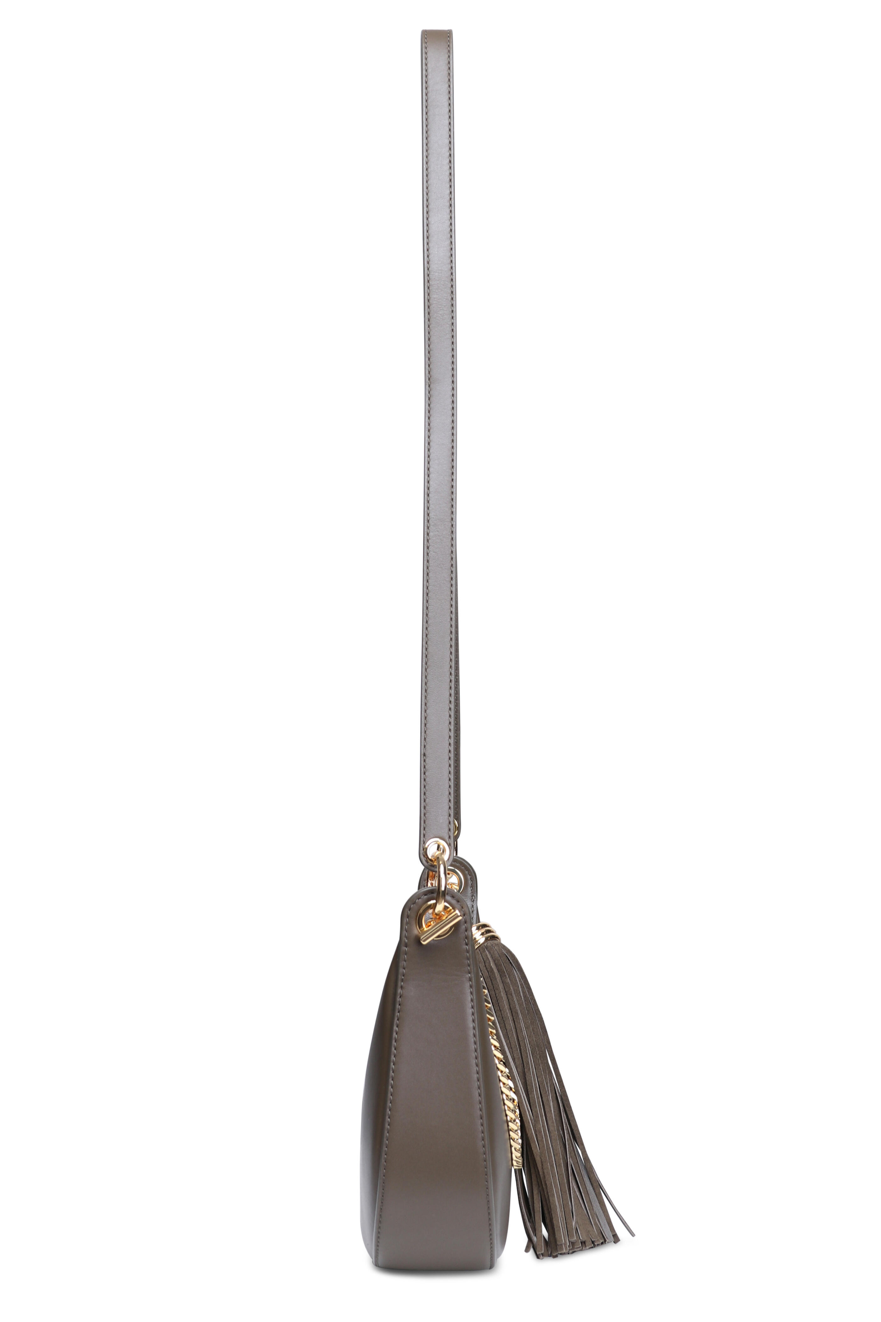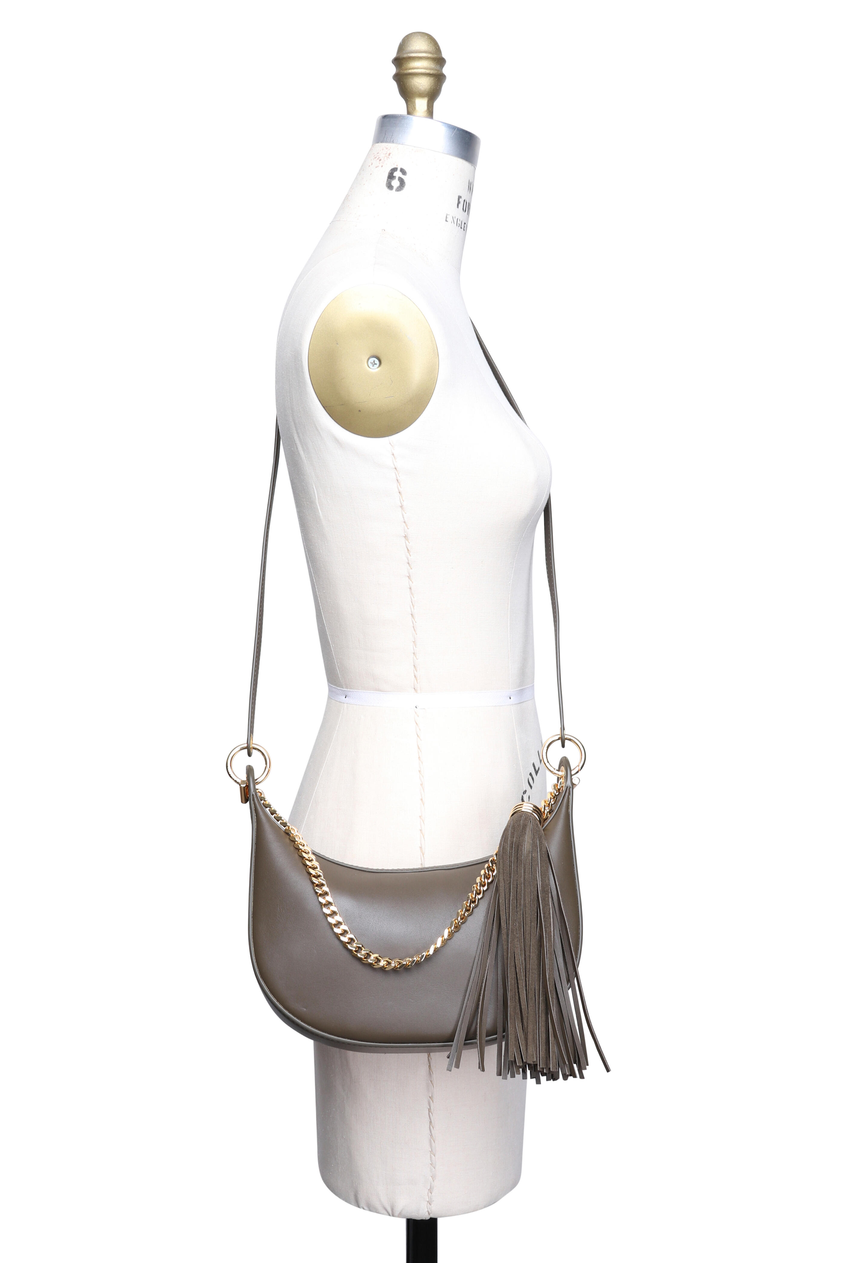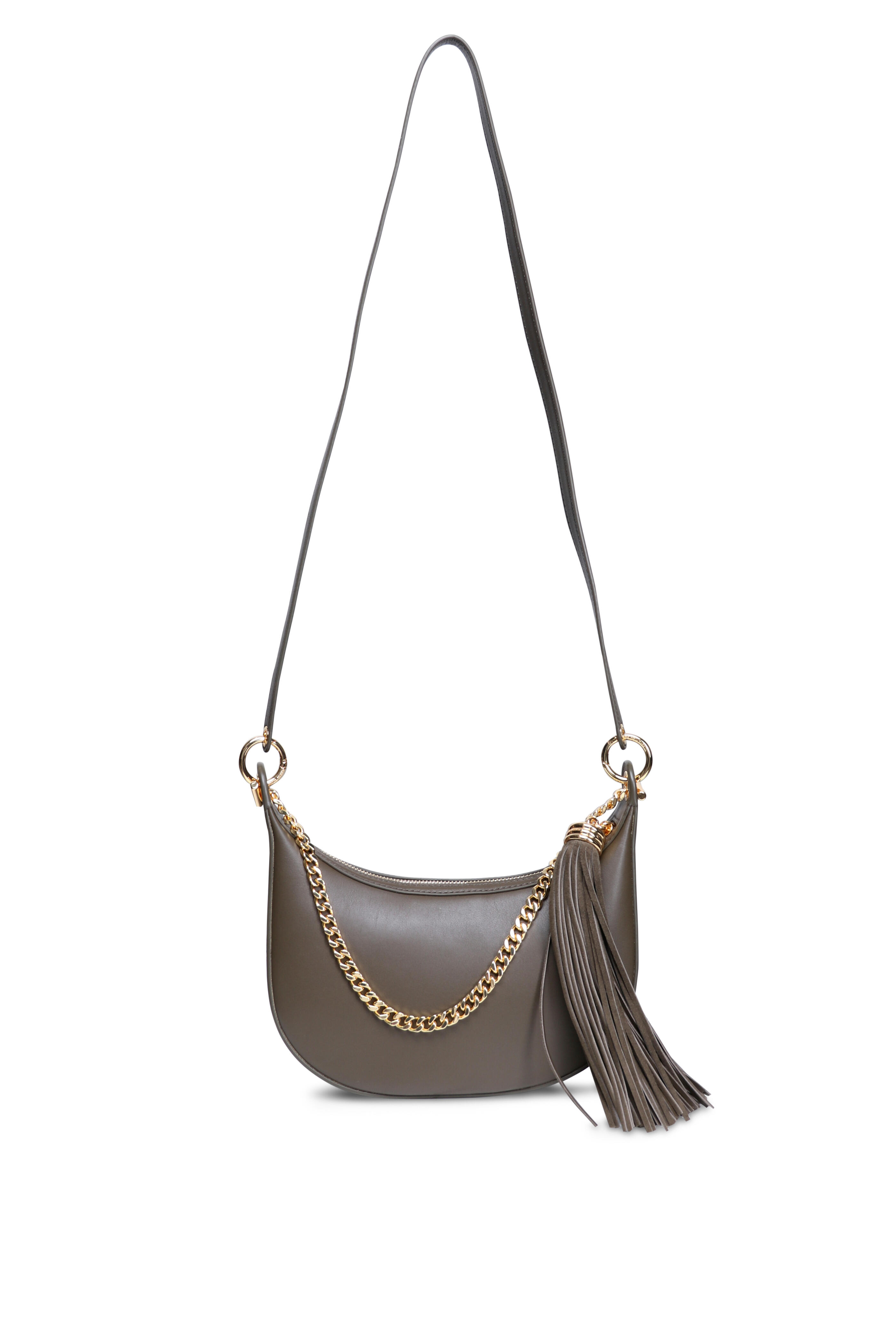 Fine-grained leather outer with polished finish. Suede lining. Zip closure. Chain link strap. Adjustable, detachable leather strap. Oversized tassel zipper. Curved silhouette. Imported. Width: 2.6”. Height: 5.7”. Length: 10”. Handle drop: 4.7”. Strap drop: 20.1”.