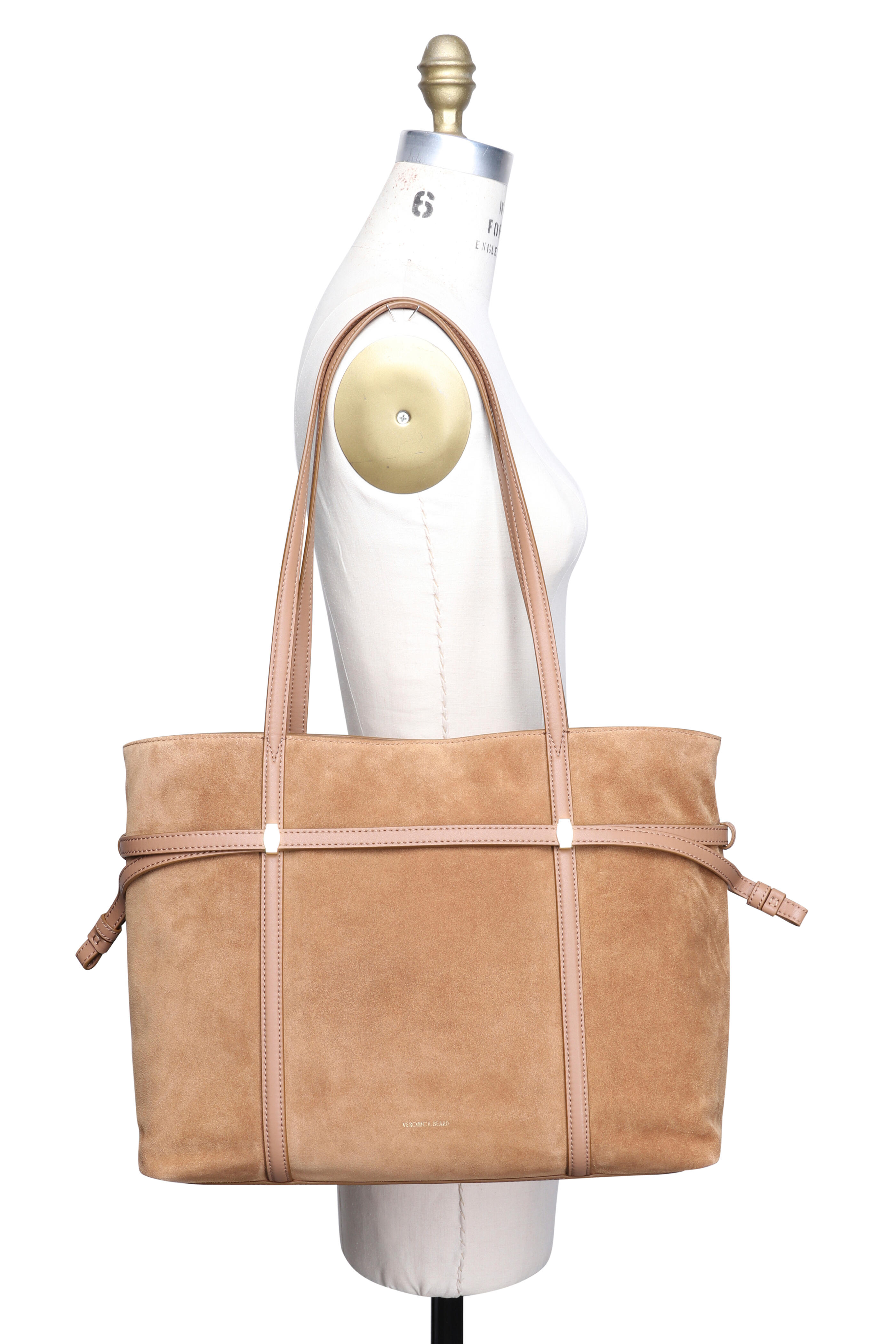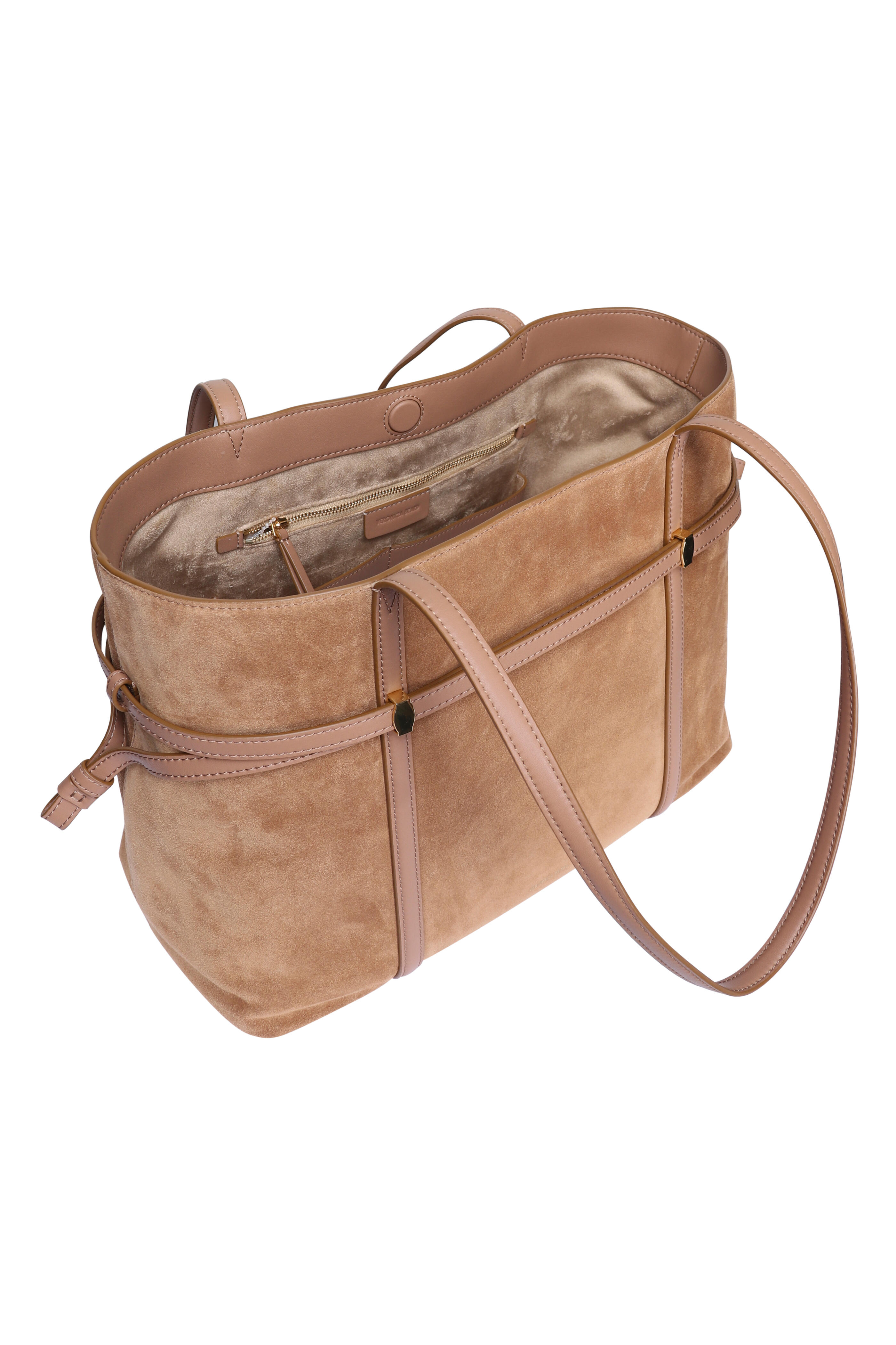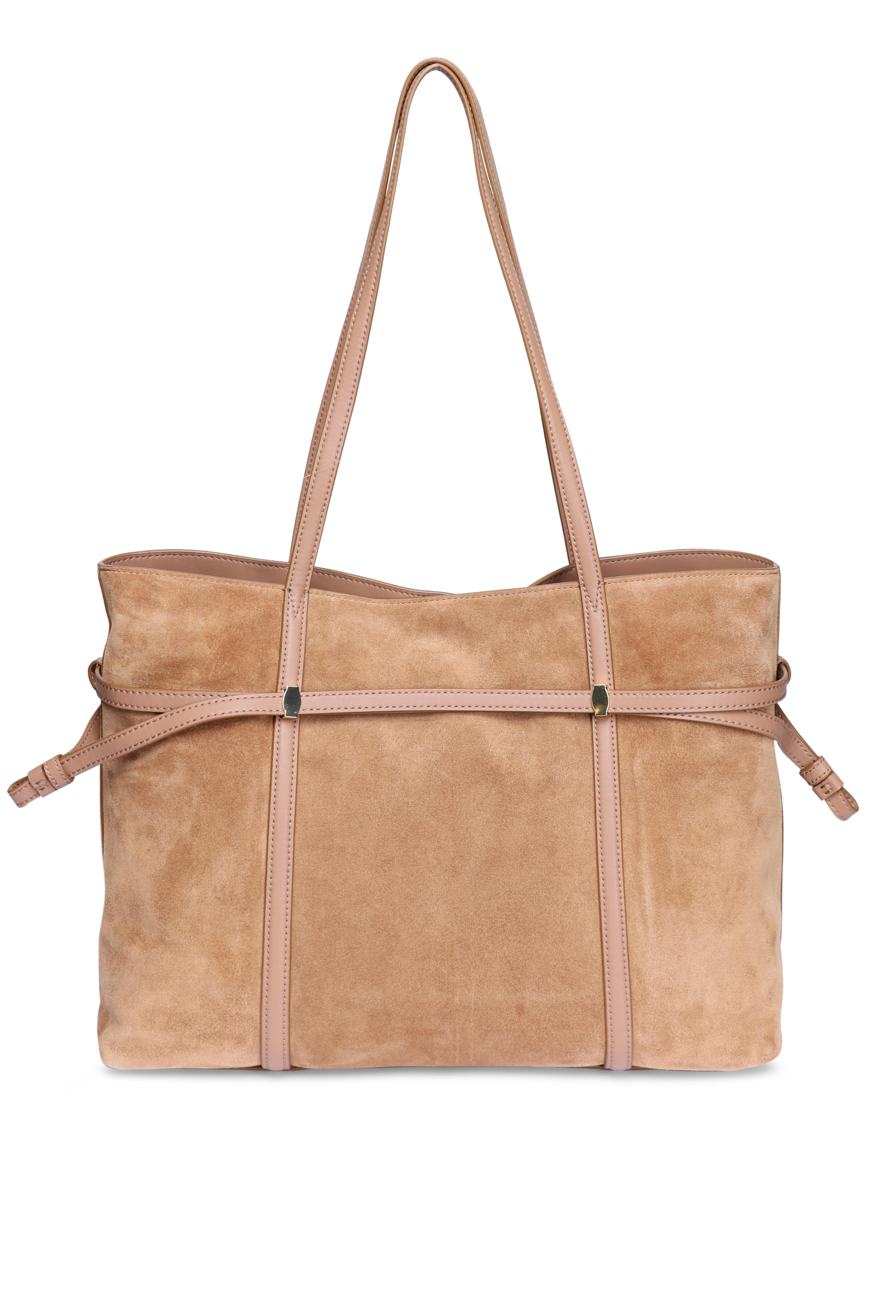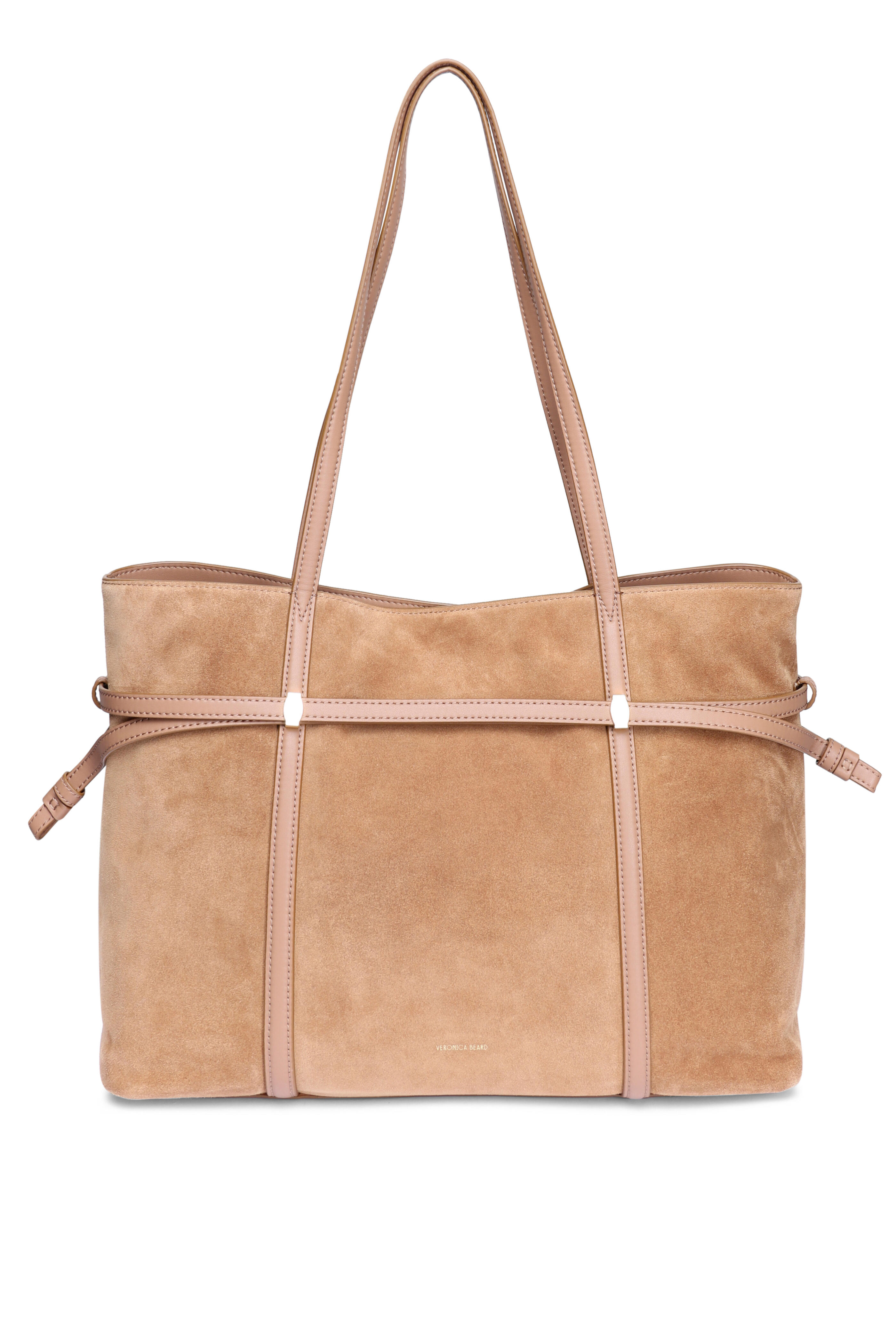 Suede and leather outer. Microsuede polyester lining. Magnetic snap. Drawstring closure. Dual top handles. Leather belt details. Interior wall zip pocket. Two slip pockets. Imported. Width: 18”. Height: 12”. Depth: 6.25”. Handle drop: 12”.