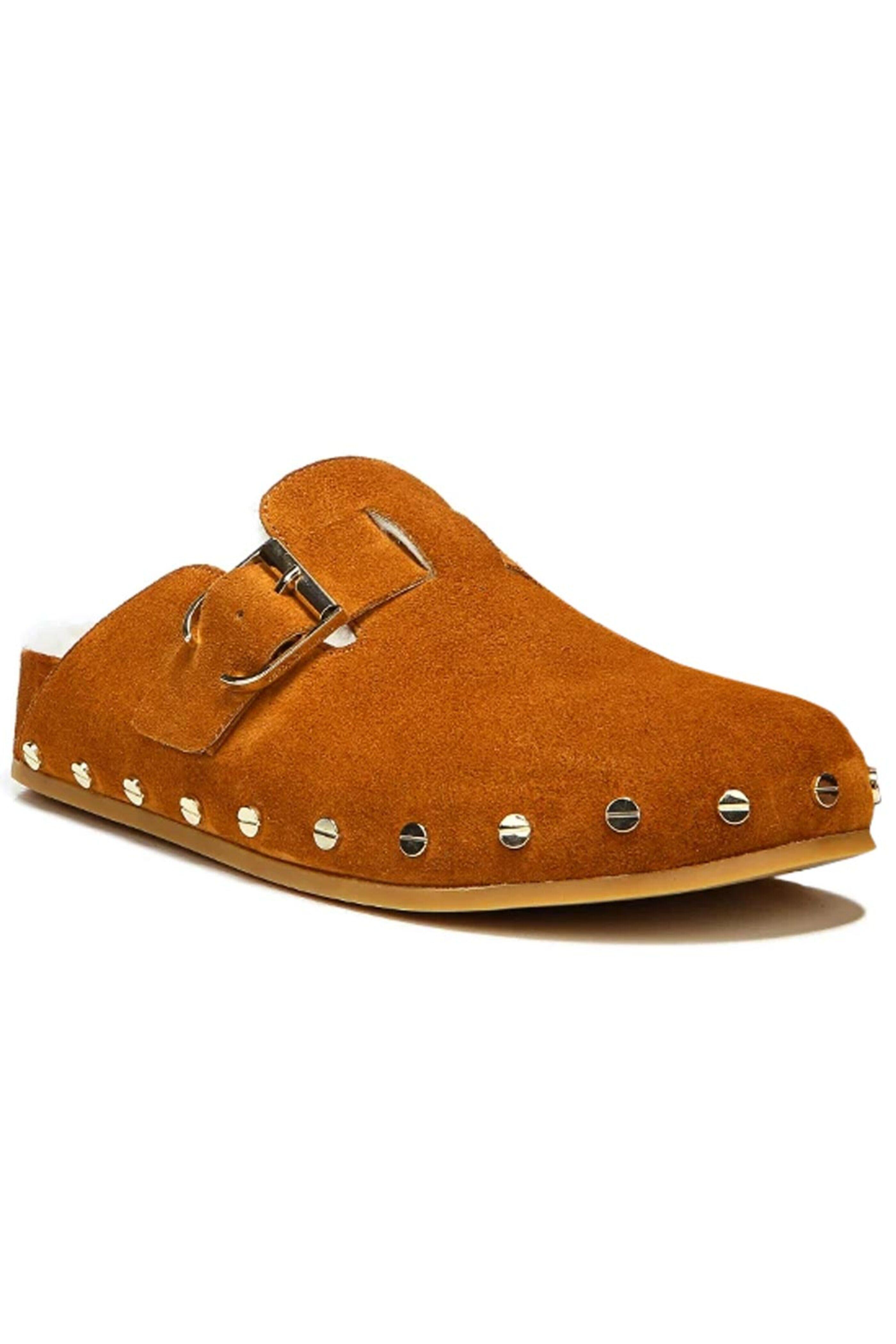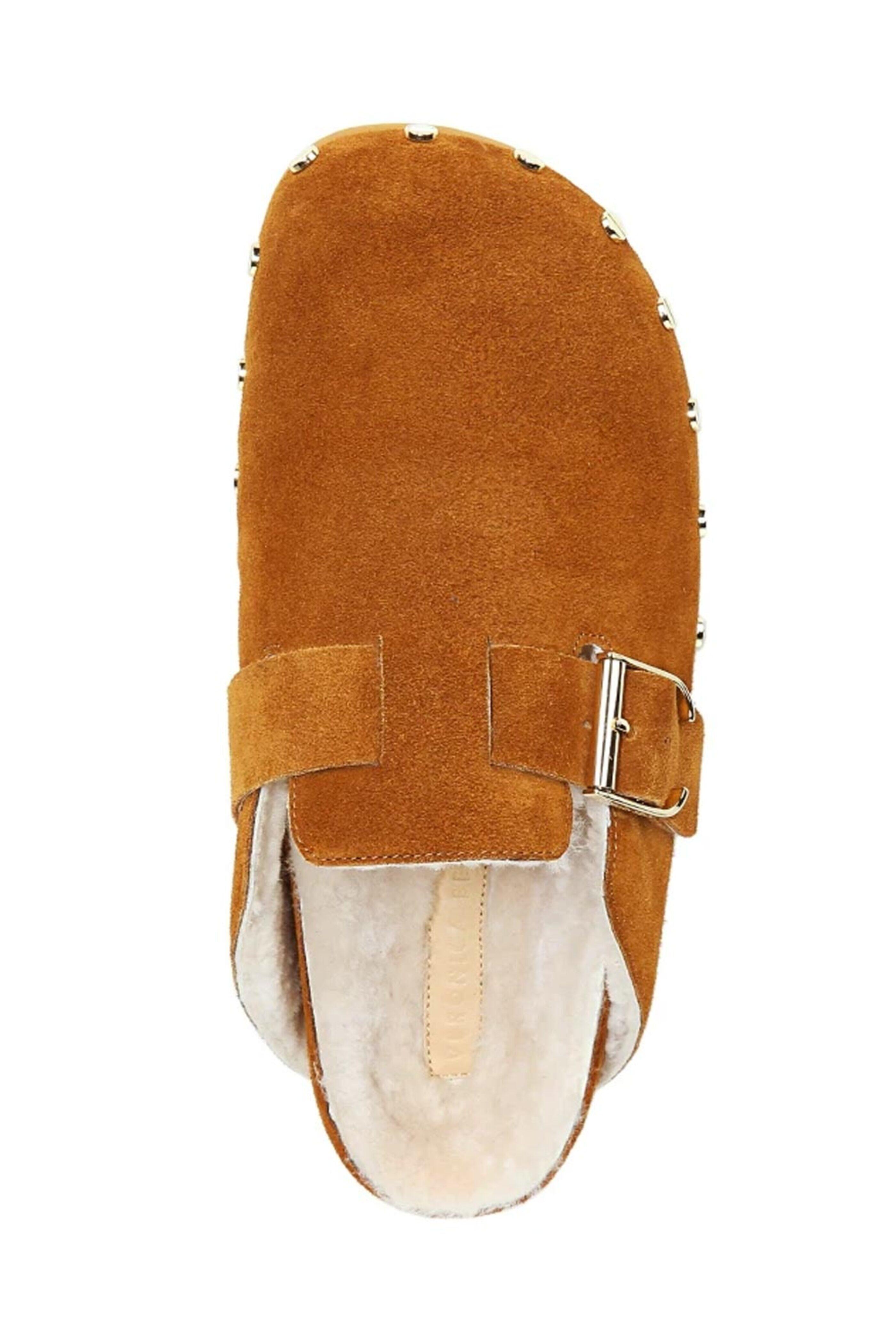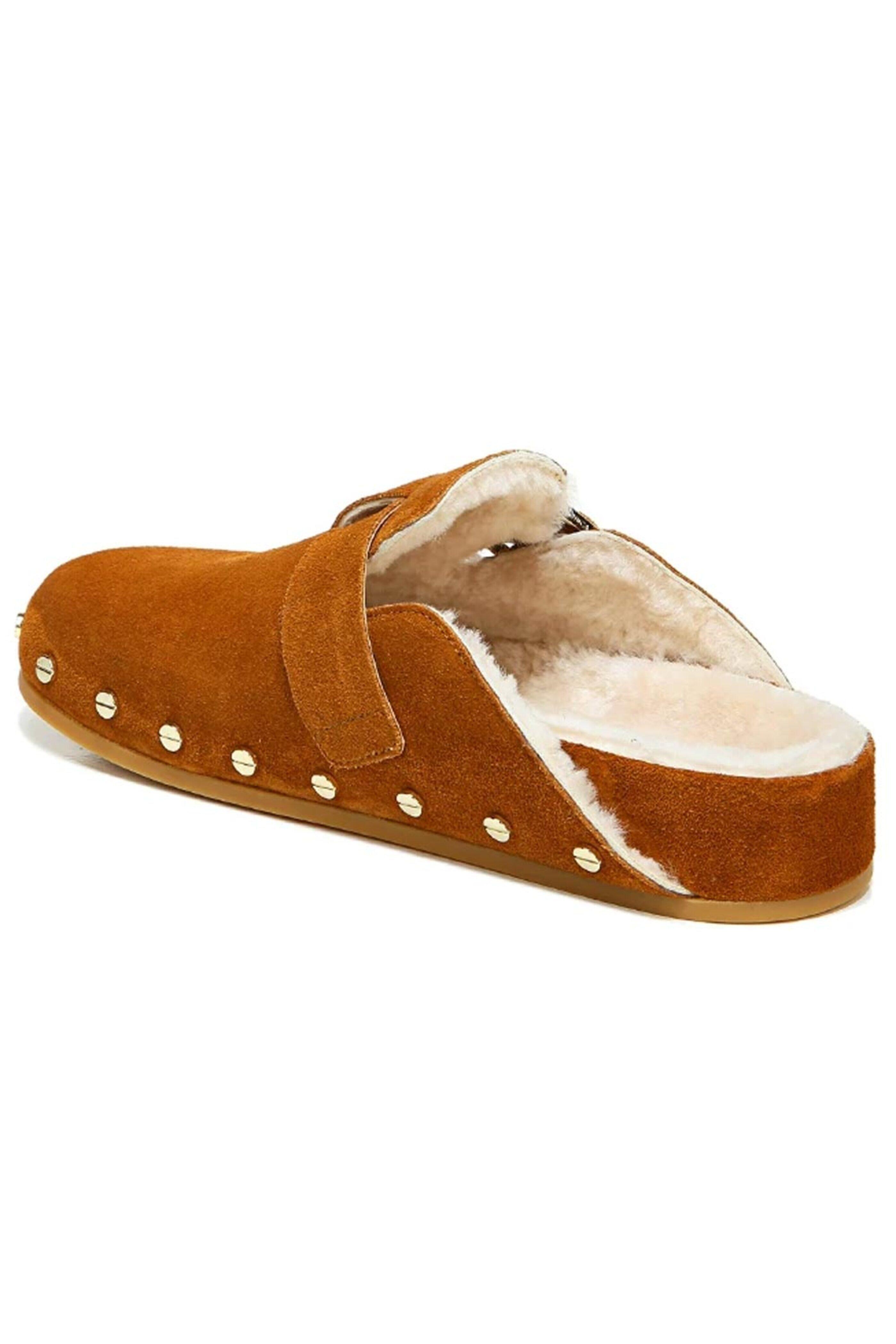Veronica Beard Caramel Shearling Lined Fern Clog Round toe Adjustable strap across foot Buckle closure Molded footbed Shearling lined 22mm heel 100% kidsuede upper Rubber sole.
