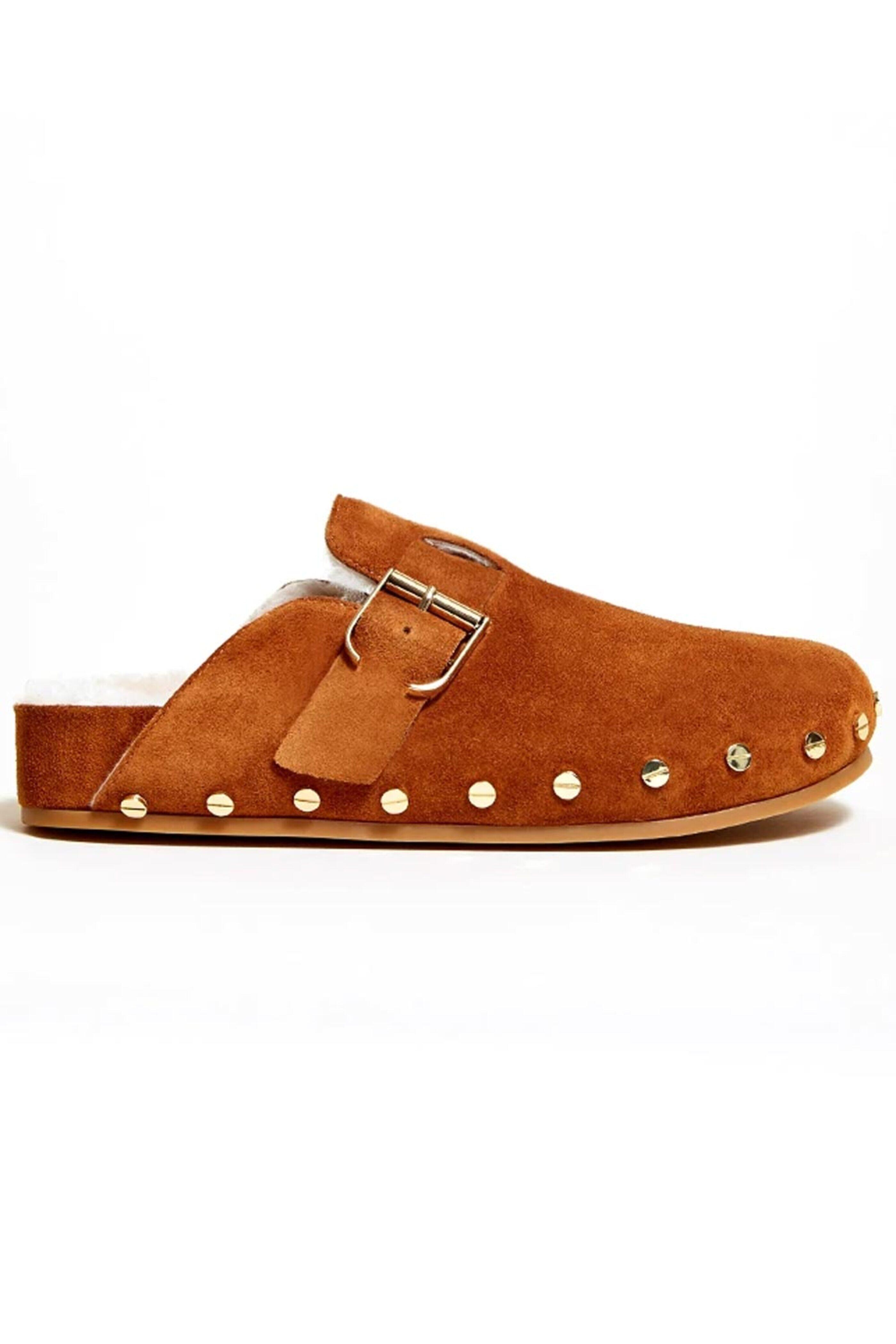- Veronica Beard Caramel Shearling Lined Fern Clog Round toe Adjustable strap across foot Buckle closure Molded footbed Shearling lined 22mm heel 100% kidsuede upper Rubber sole