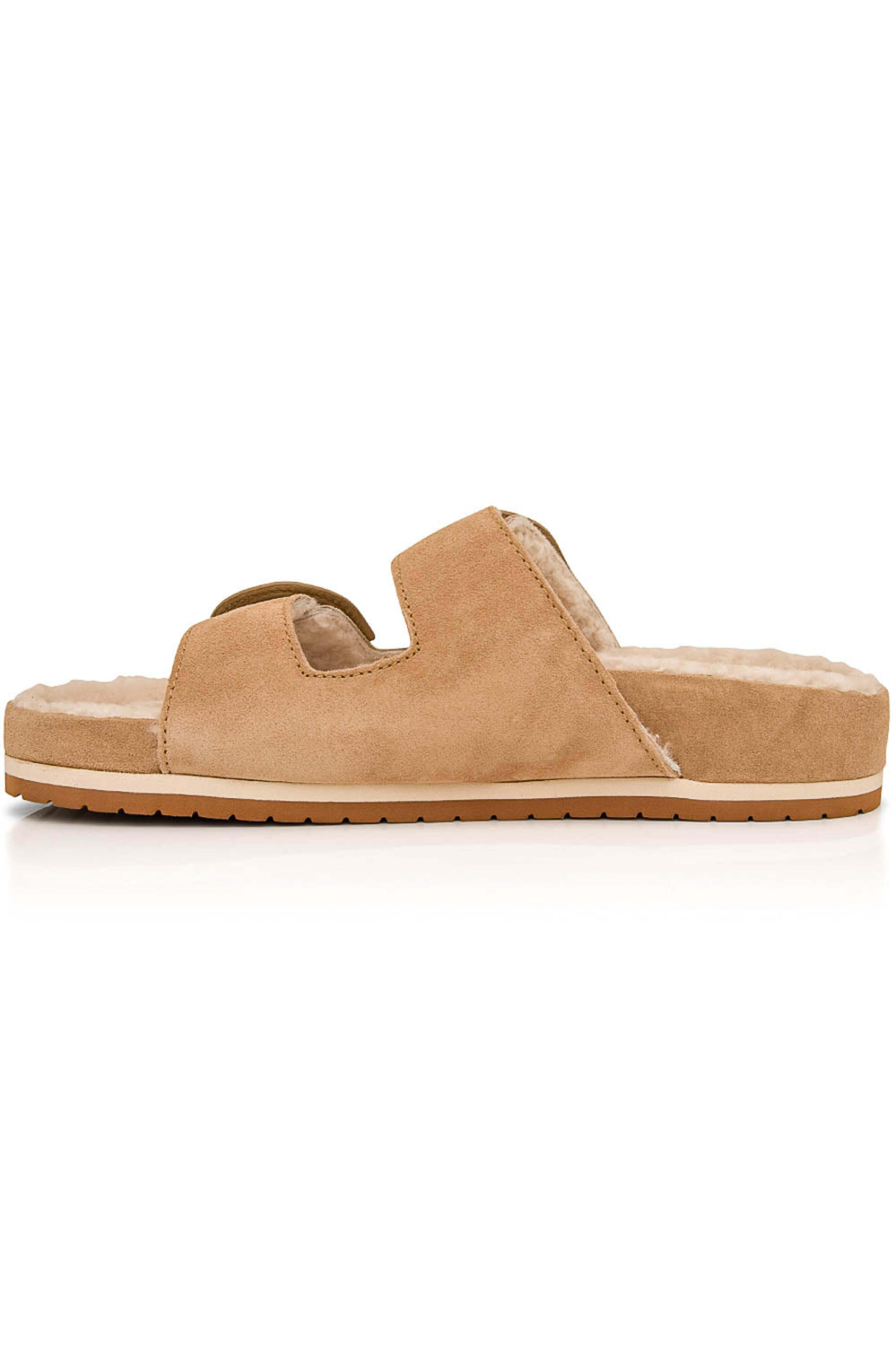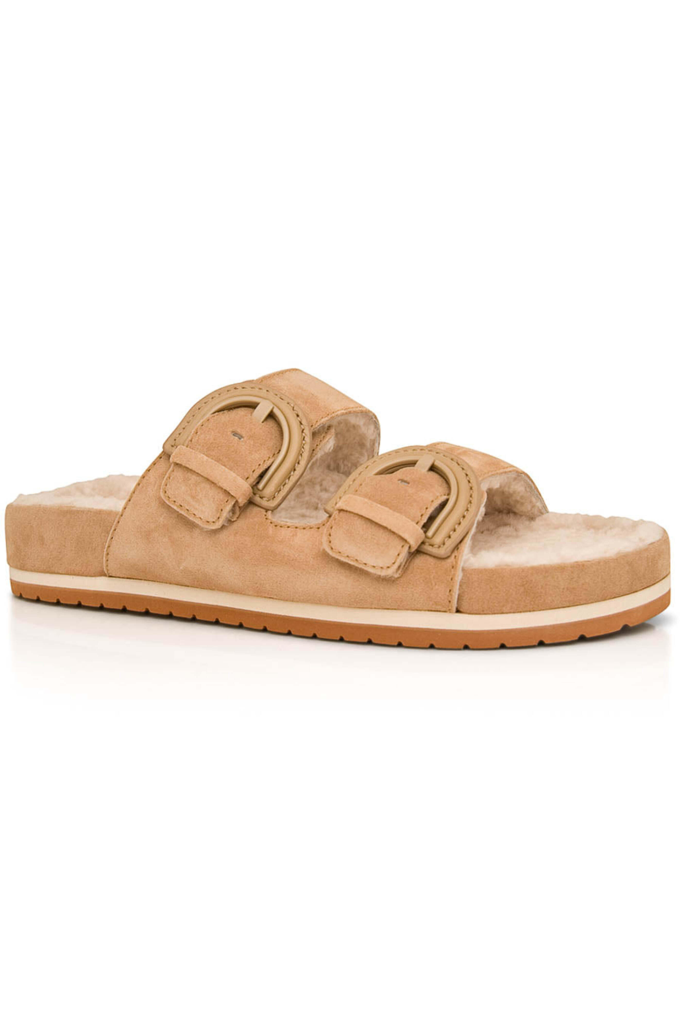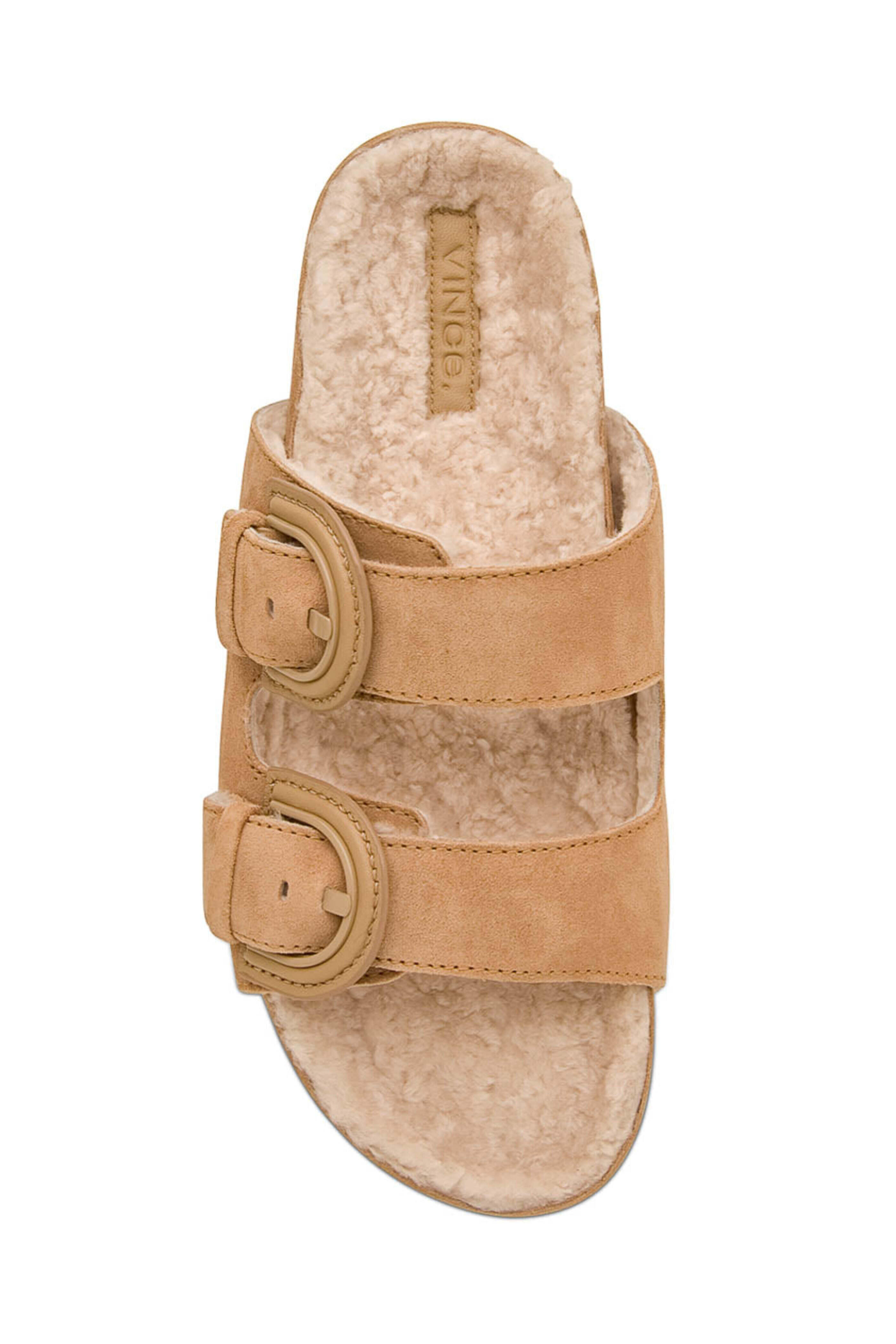 - Vince Glyn Suede Leather Sandal in Dunes Suede leather upper Slip on style Double straps with buckle fastenings Rounded open toe Tonal stitching Shearling lined Padded footbed Rubber sole