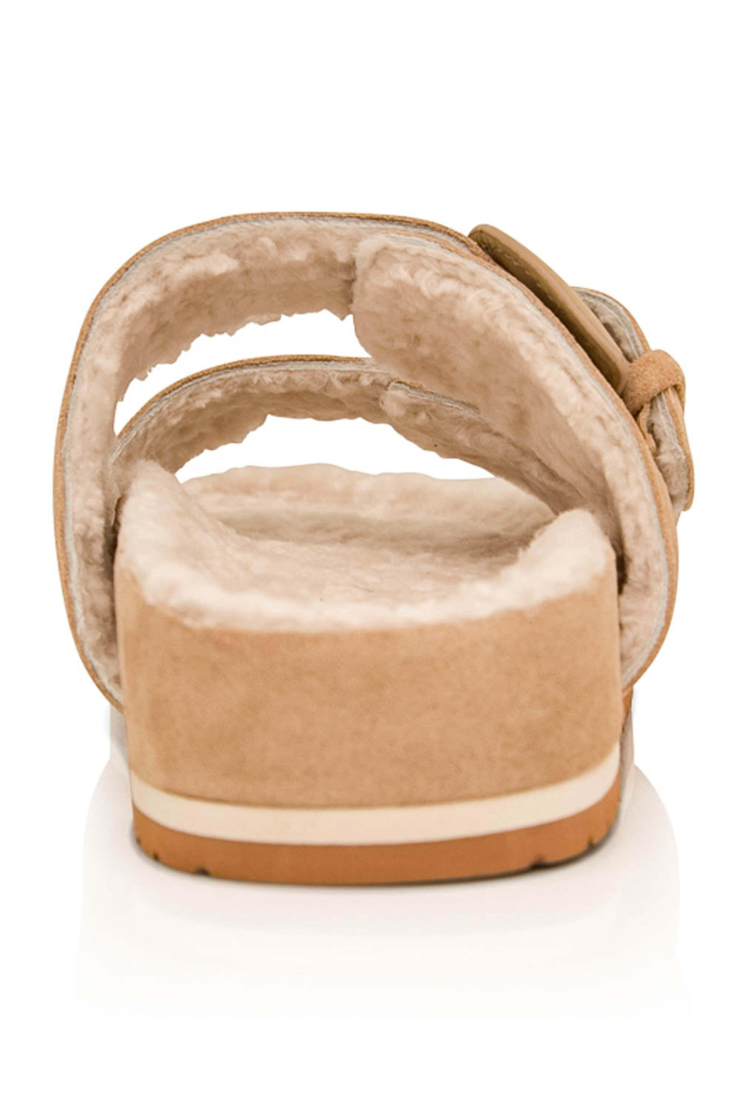 Vince Glyn Suede Leather Sandal in Dunes Suede leather upper Slip on style Double straps with buckle fastenings Rounded open toe Tonal stitching Shearling lined Padded footbed Rubber sole.