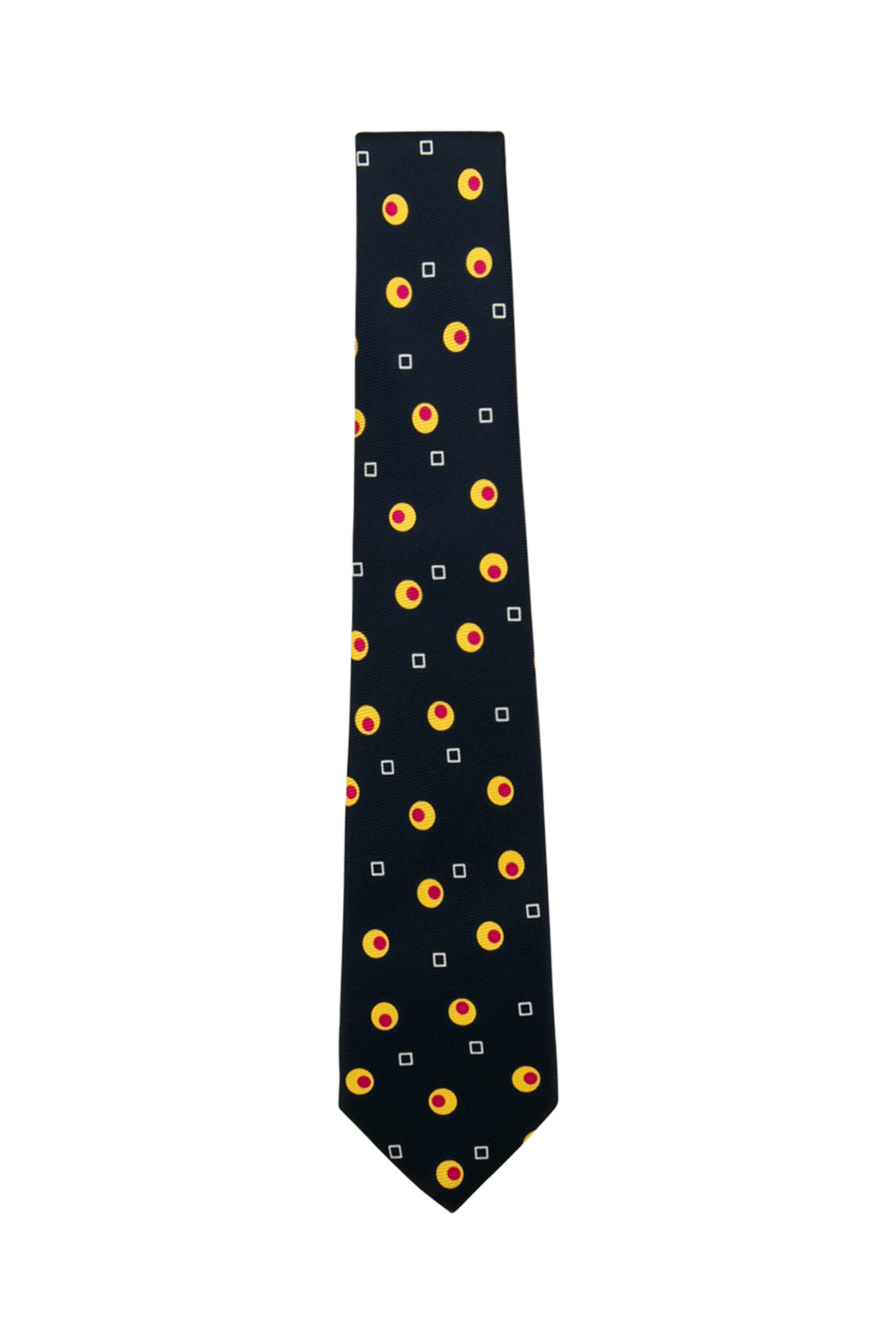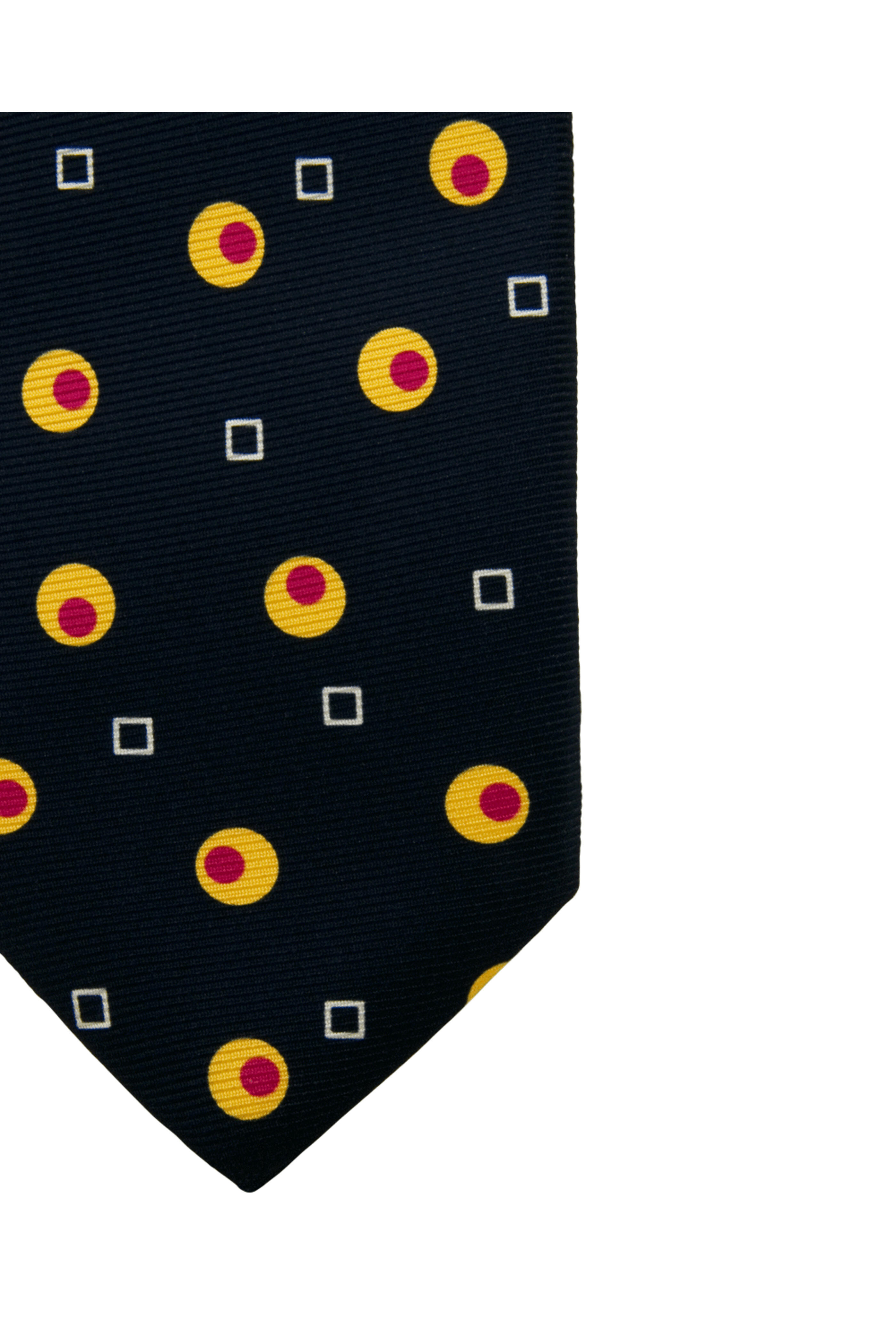 Kiton Navy and Yellow Circles Tie. Seven-fold tie. 58 long. 3.25 wide. Made in Italy. Dry clean only. 100% silk.