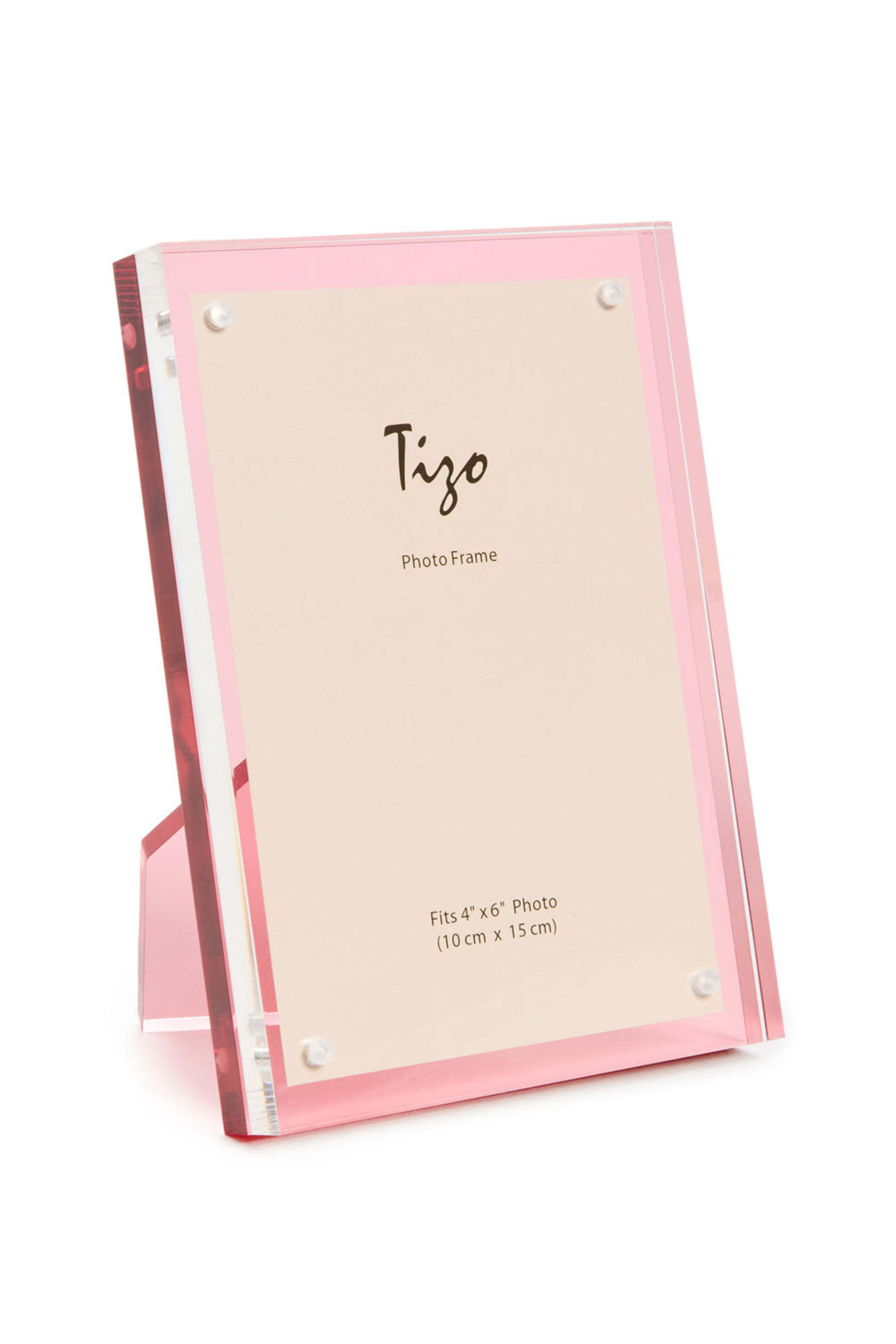 Tizo Lucite Frame with Pink Back 4x6. 5.25 L x 7.25 W x 1.25 H. Displays one 4 x 6 photo. Modern, to-the-edge design with clear easel.