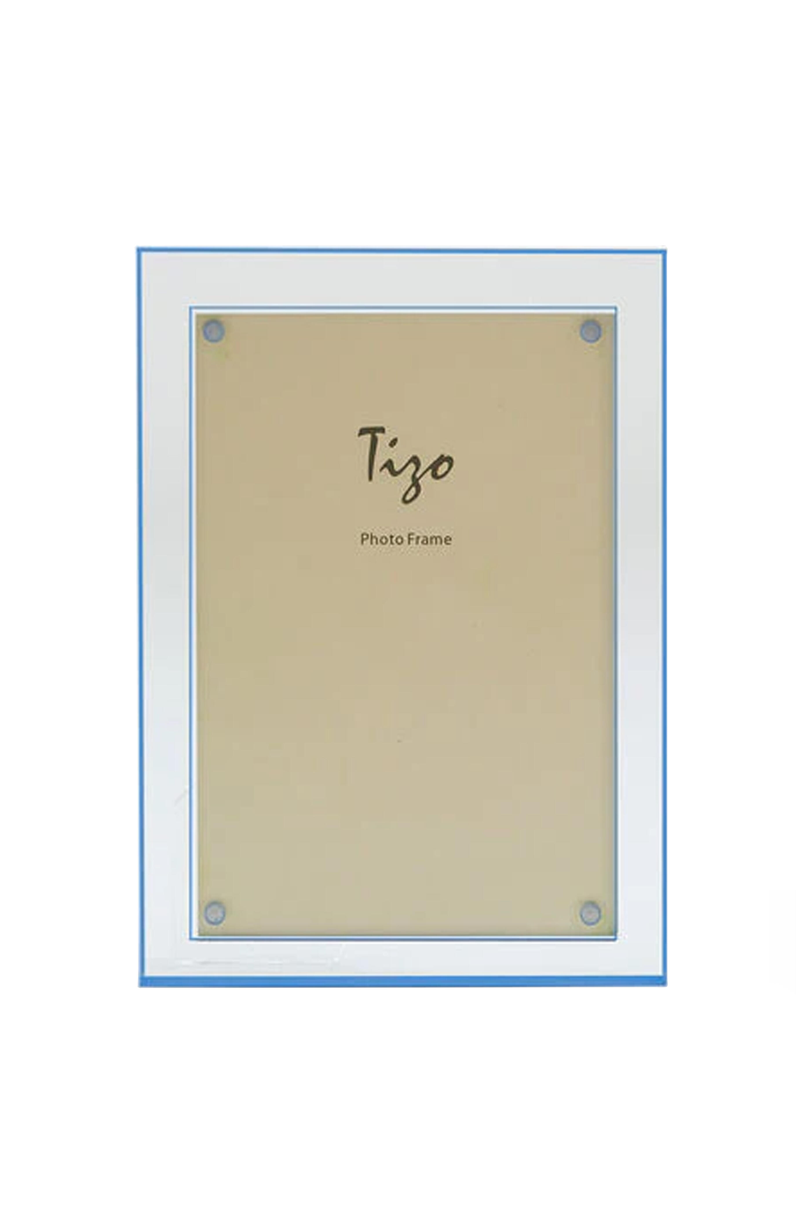 Lucite. Blue boarder. Holds a 4x6 photo. Made in Italy.