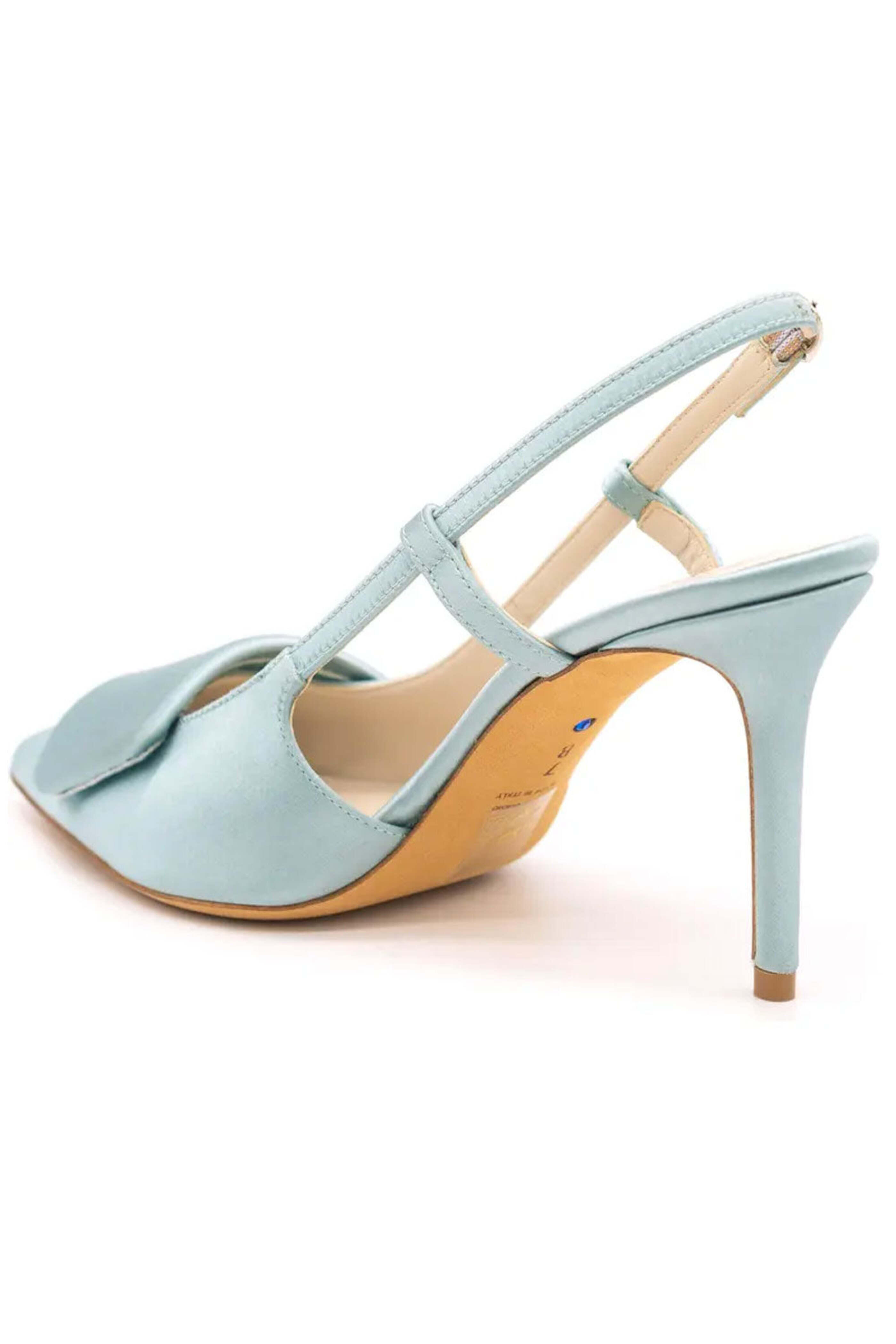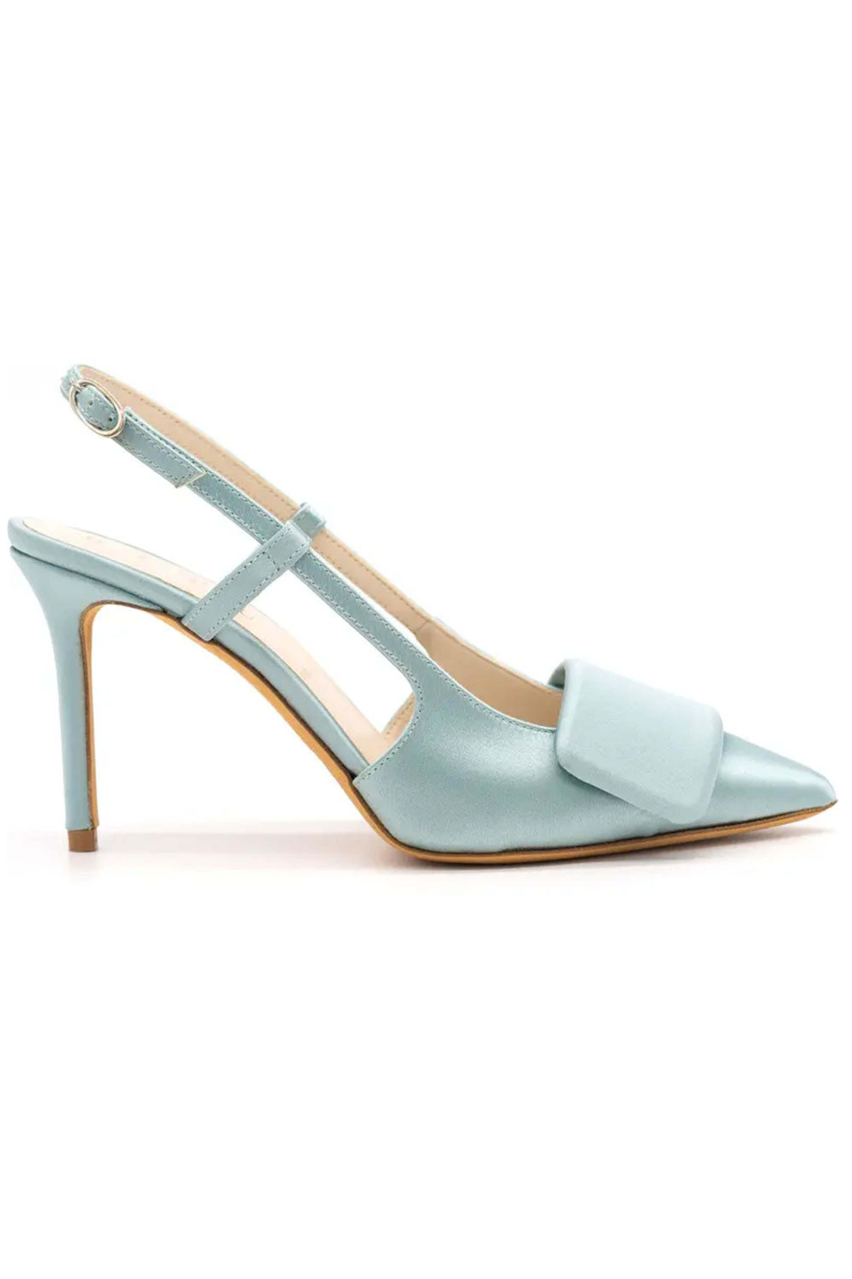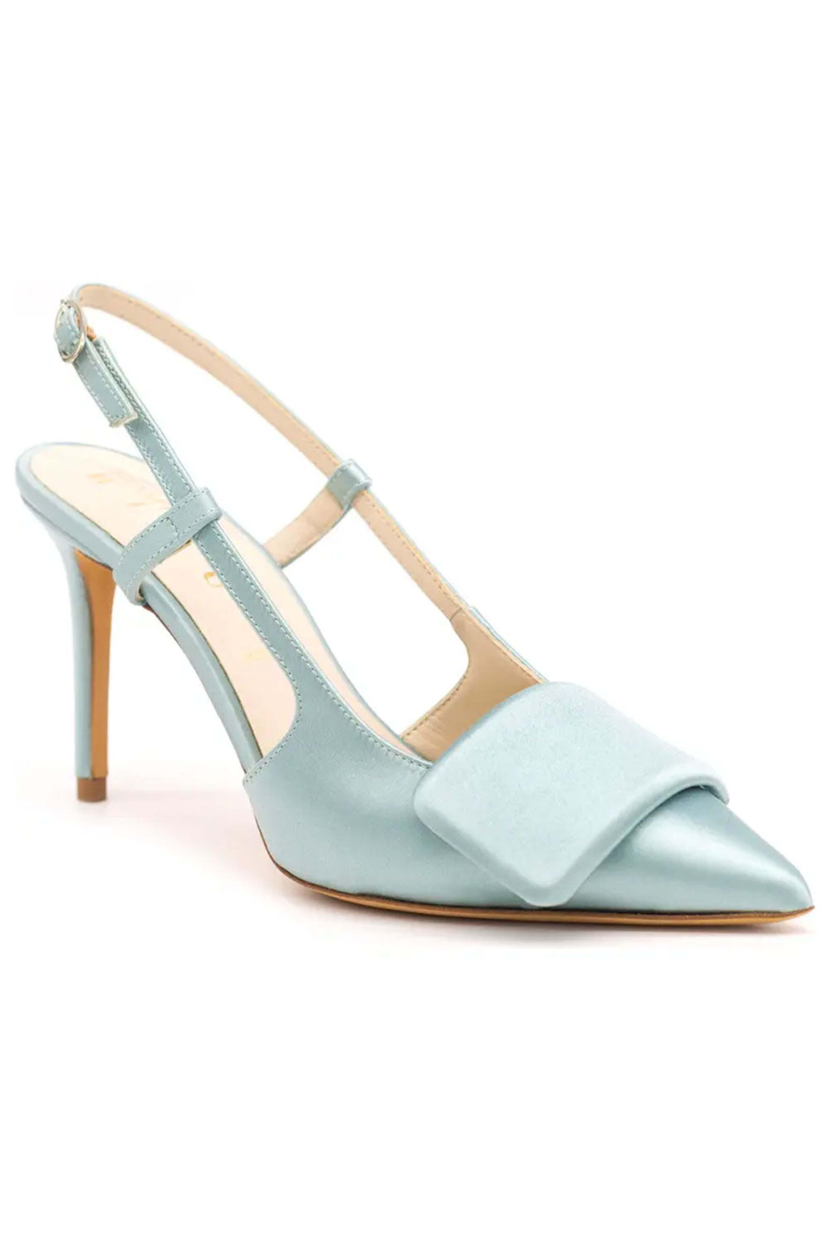 Something Bleu Halen Slingback Pump in Blue. Pointed toe with geometric ornament. Slingback strap with adjustable buckle closure. 3.25 stiletto heel. Satin upper. Leather lining and sole. Made in Italy.