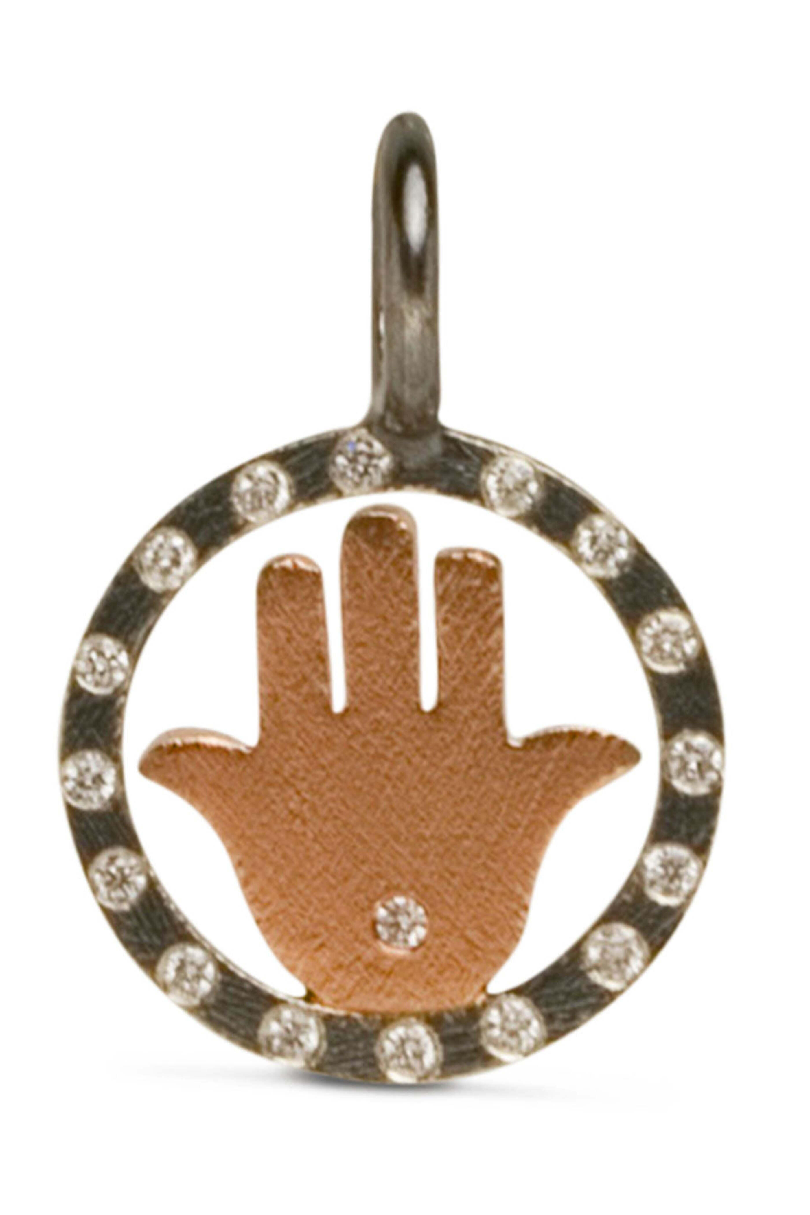 Rose gold. Sterling silver. 0.10 ct. diamonds. Hamsa design. Slip bail. Diameter: 0.5.