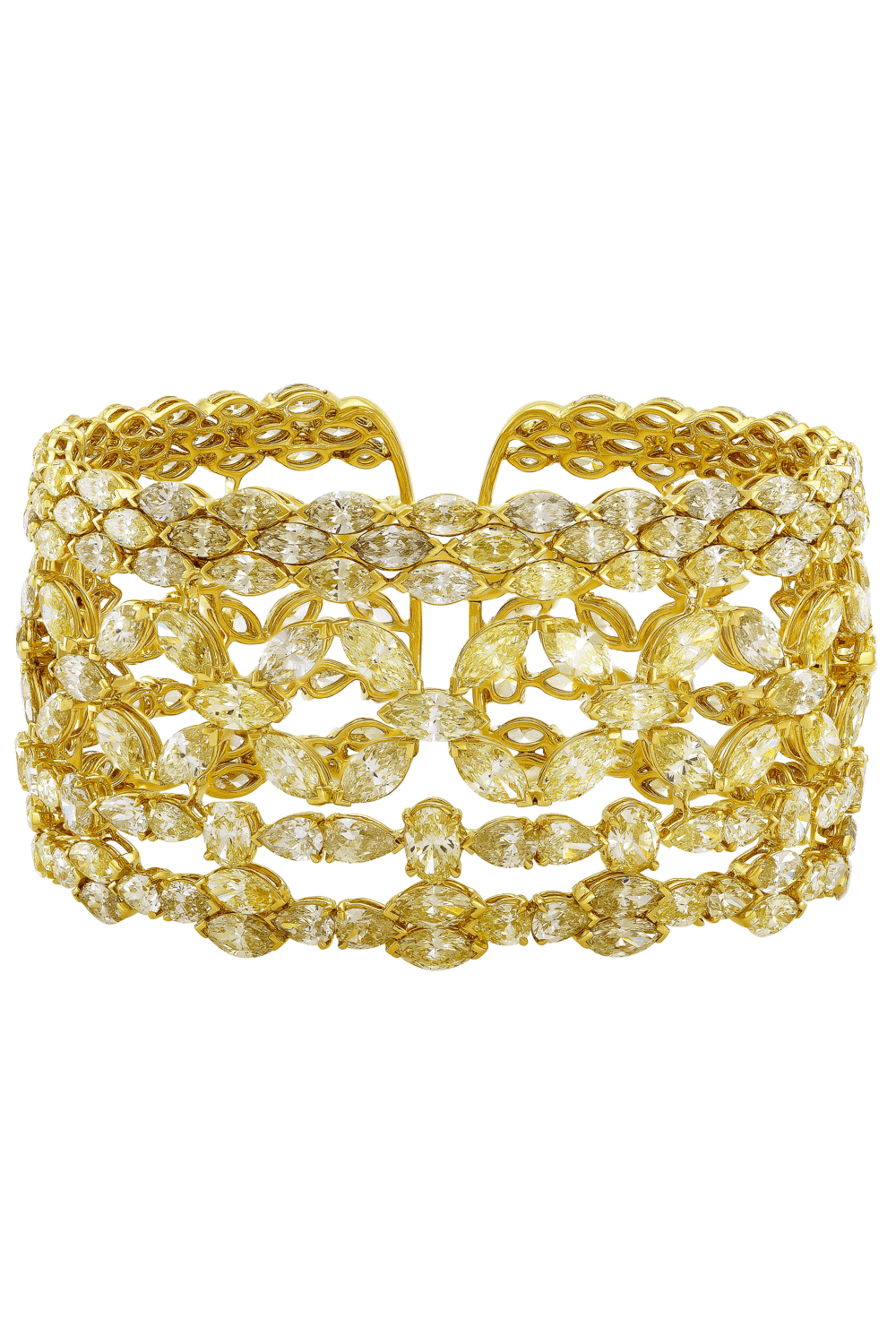 Etho Maria Multi Shape Diamond Cuff. 18k gold. Diamond 44.66 total carat weight. Marquise cut diamond. Pear cut diamond. Oval cut diamond. Mix shape design. Cage design. Cuff style. Prong setting. Made in Greece.