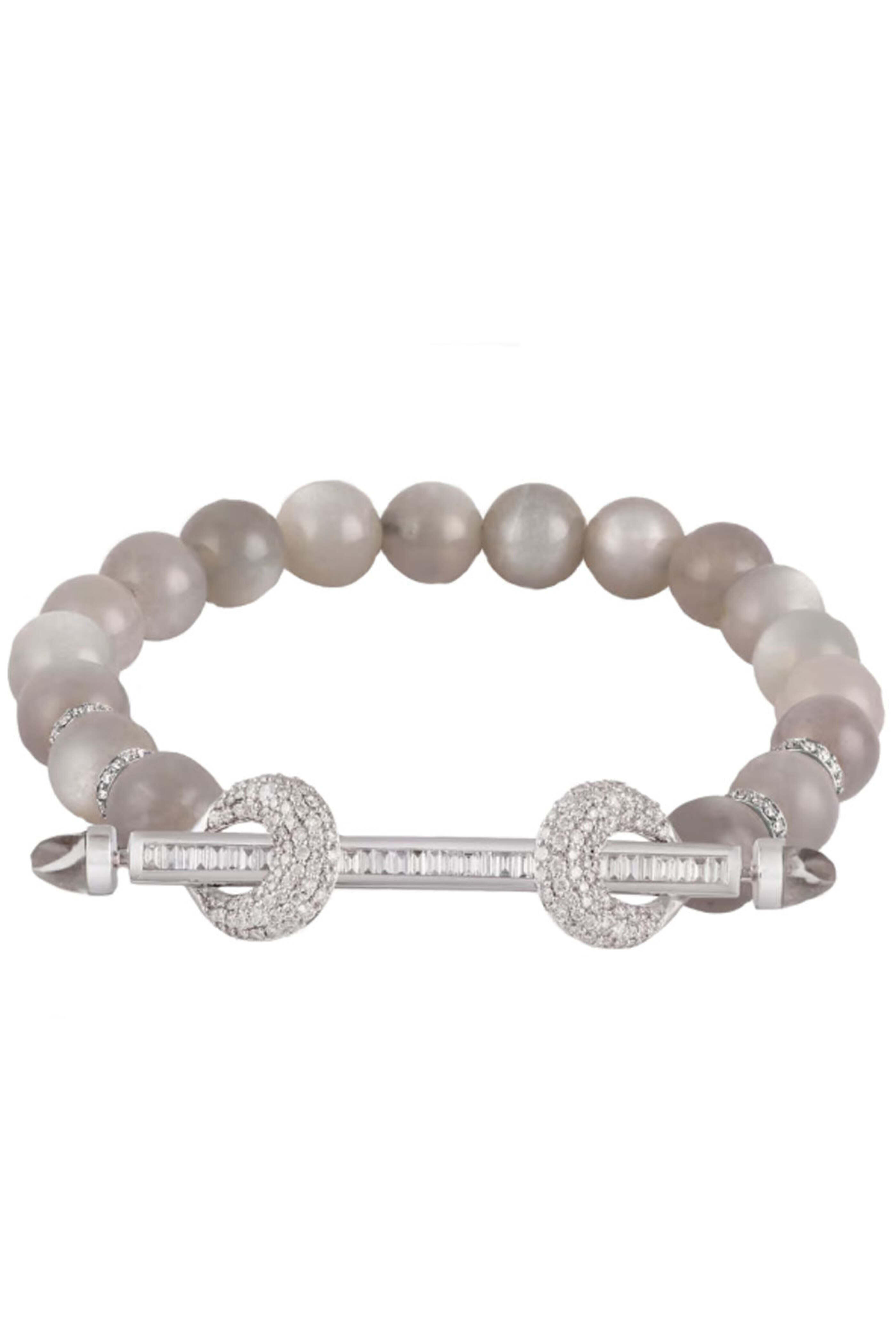 Ananya Moonstone Chakra Bracelet. 18k white gold. Diamonds 1.8 total carat weight. Moontstone 63.91 total carat weight. Moonstone beads. Quartz crystal. White gold baguette diamond bar anchors. Signature chakra design. 2.2 W. Slip on style. Imported.
