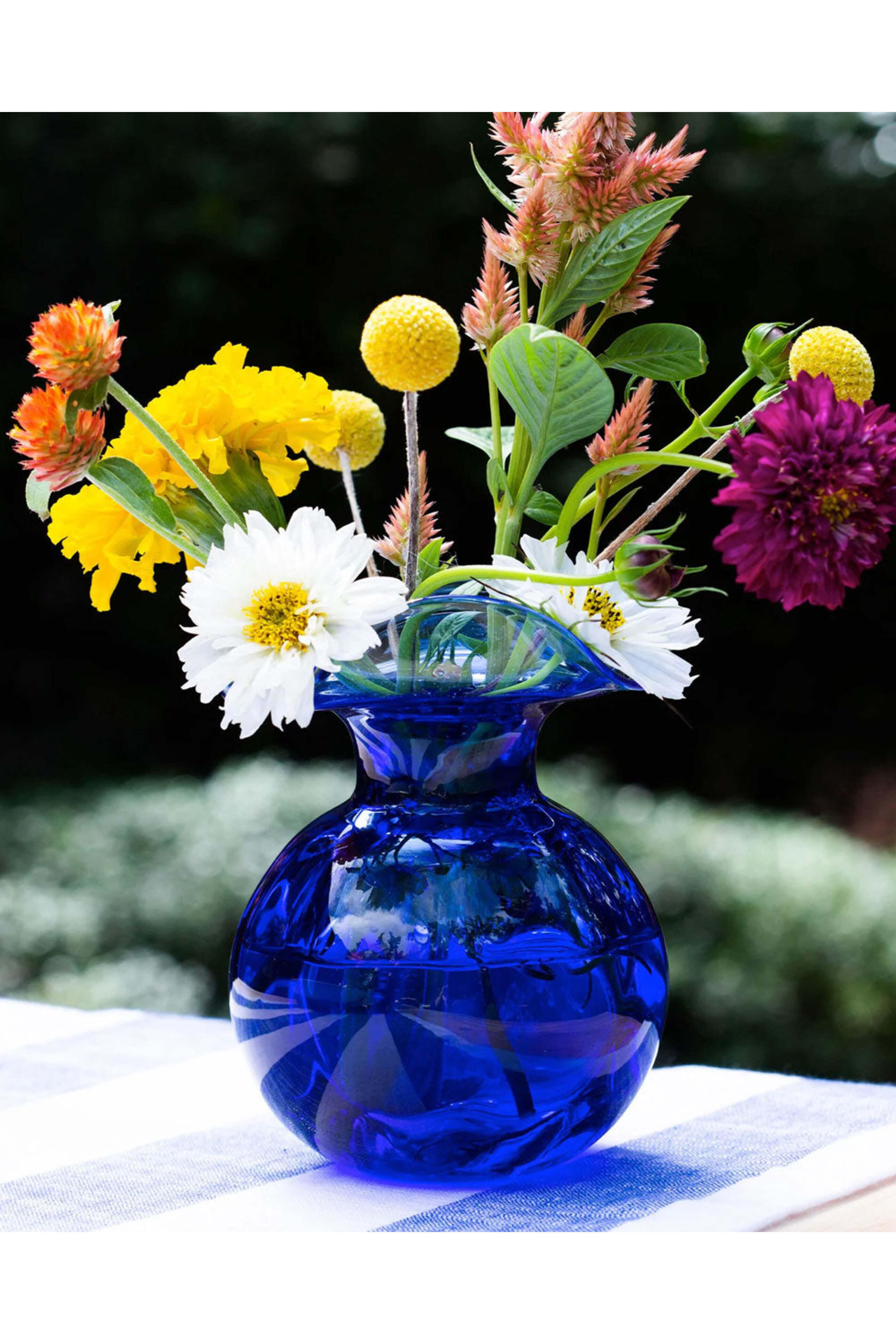 Vietri Hibiscus Bud Vase in Cobalt. Handblown hibiscus glass. 5 W x 5.5 H. 12 oz. Made in Italy. Dishwasher safe.