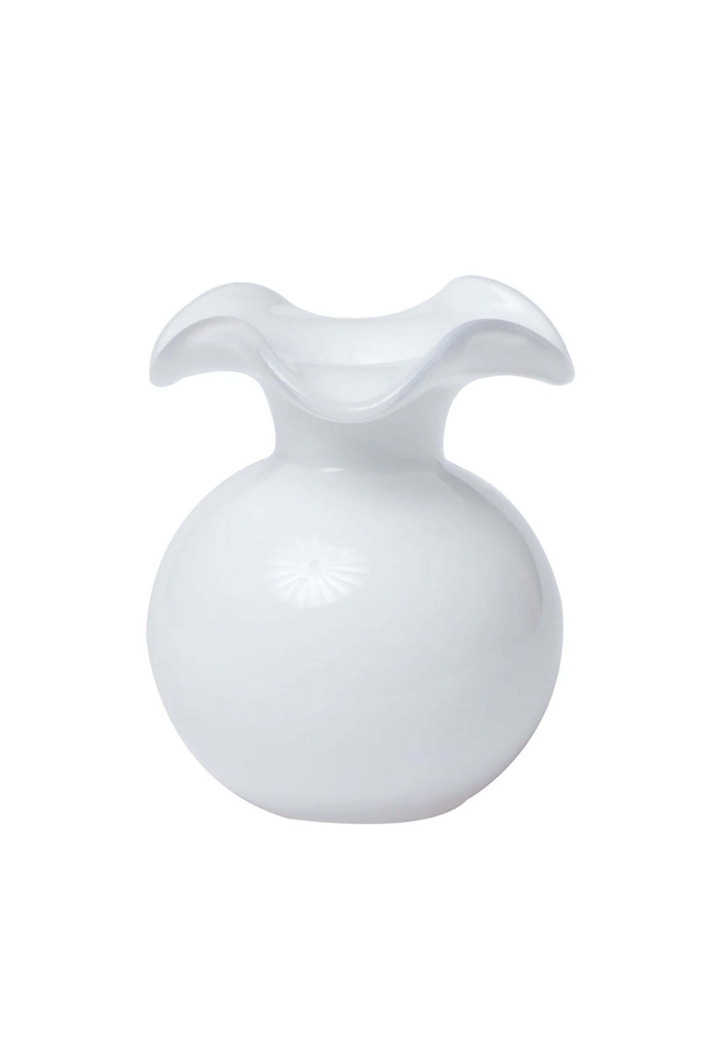 Vietri Hibiscus Bud Vase in White. Handblown hibiscus glass. 5€ W x 5.5€ H. 12 oz. Made in Italy. Dishwasher safe.