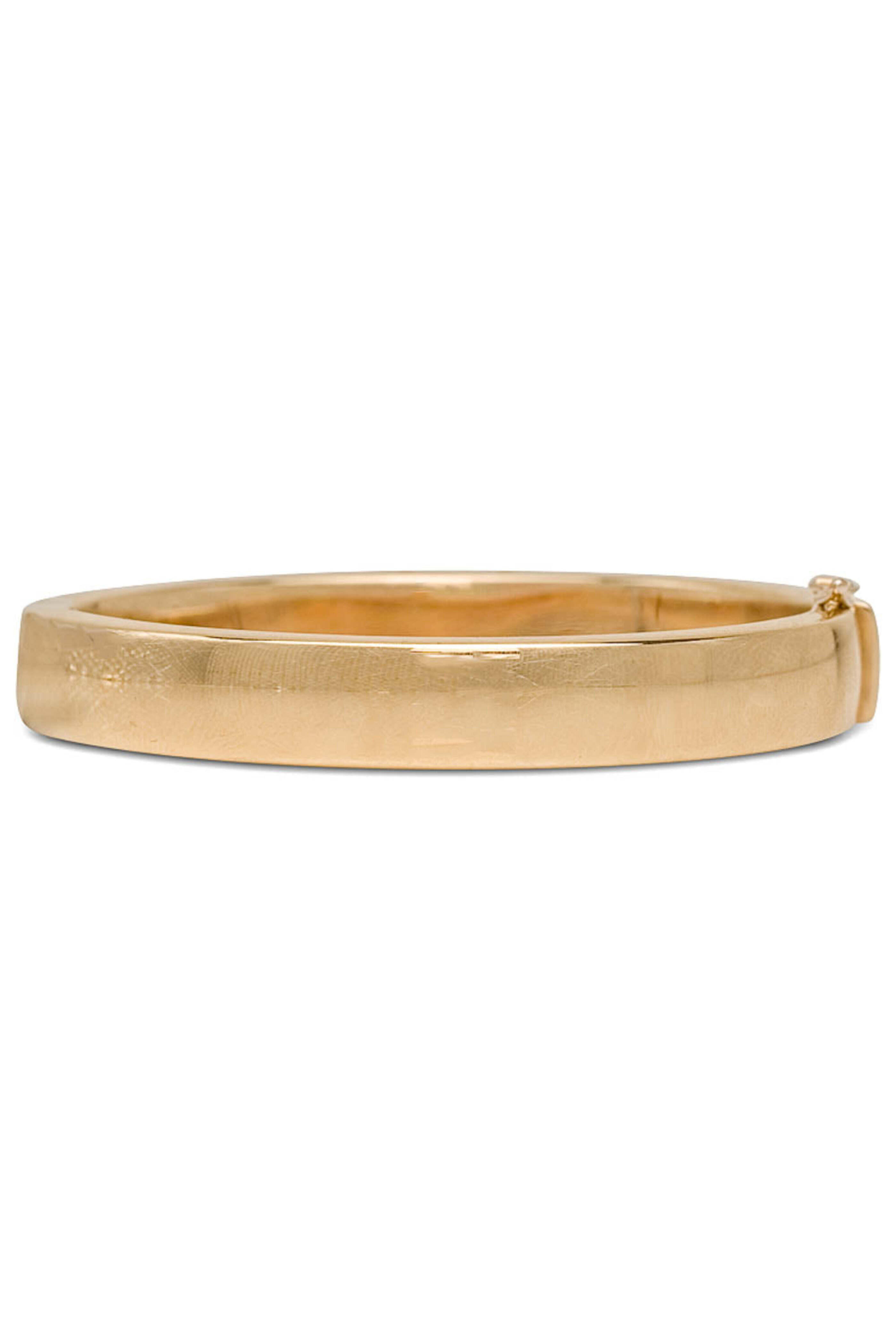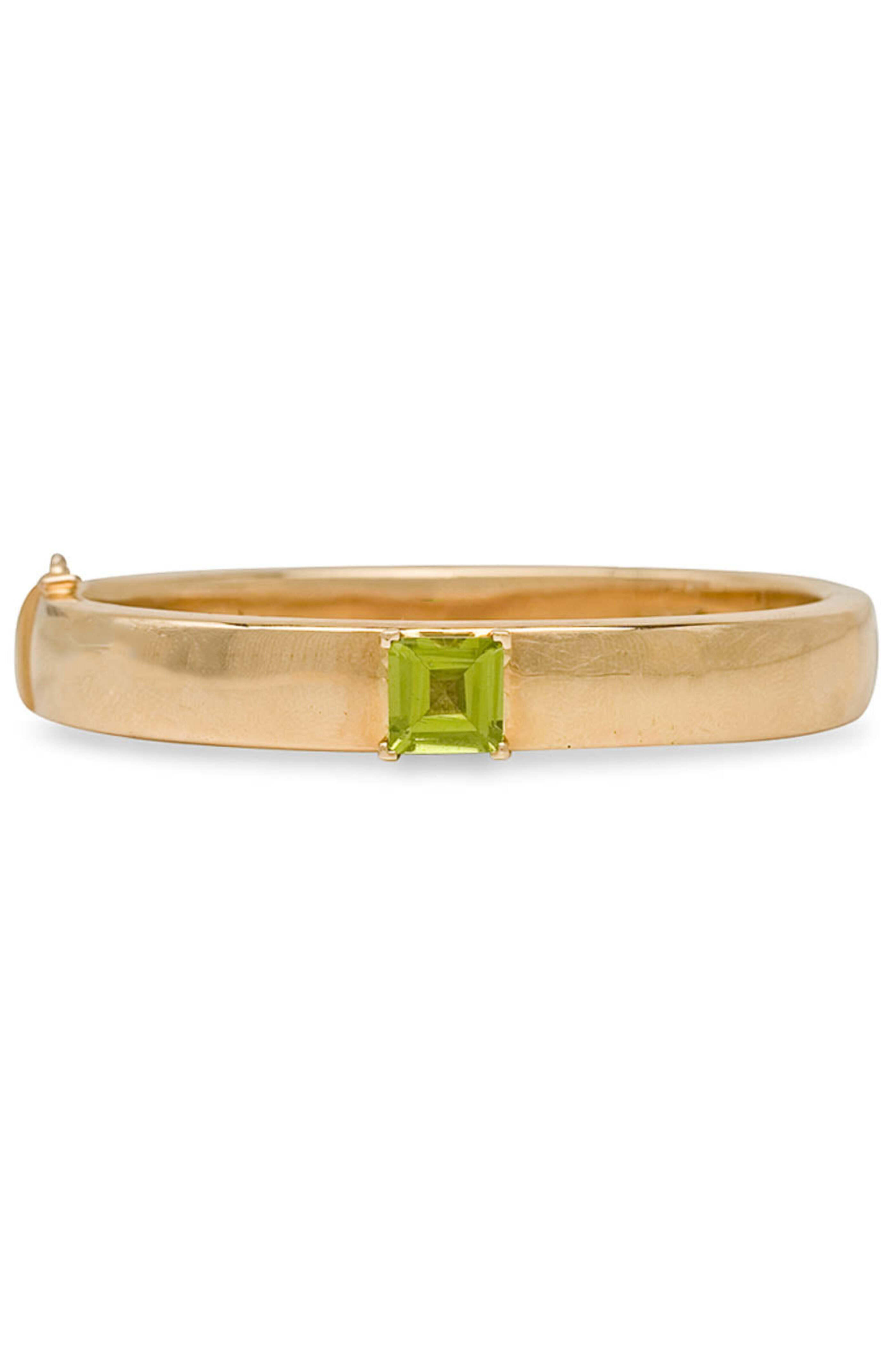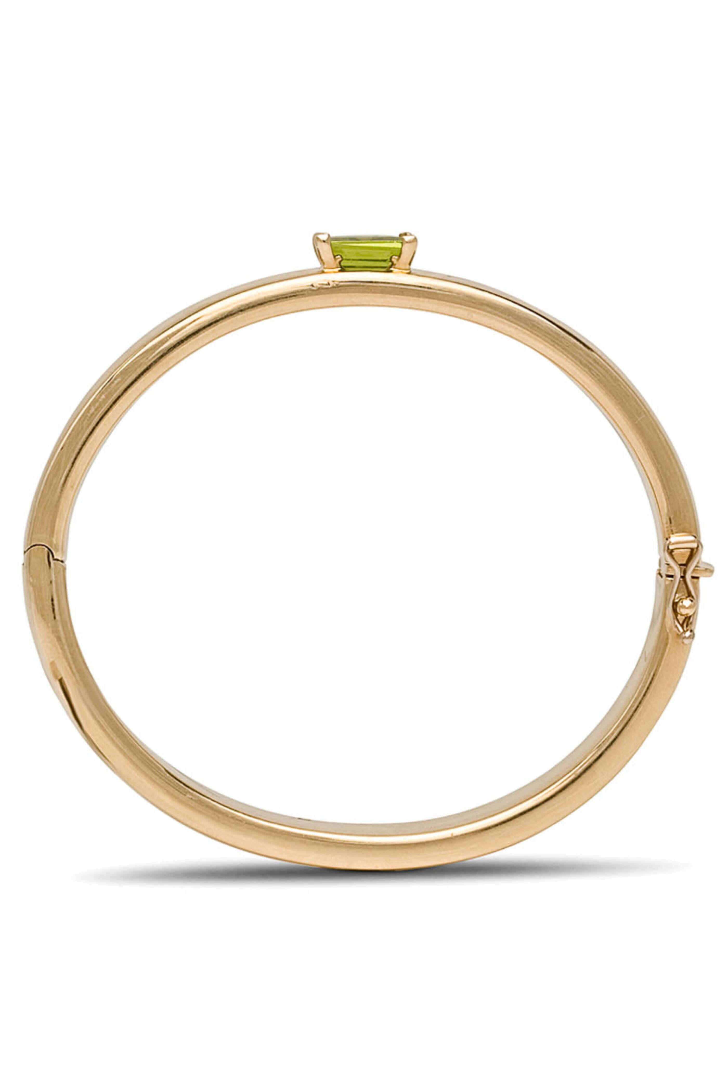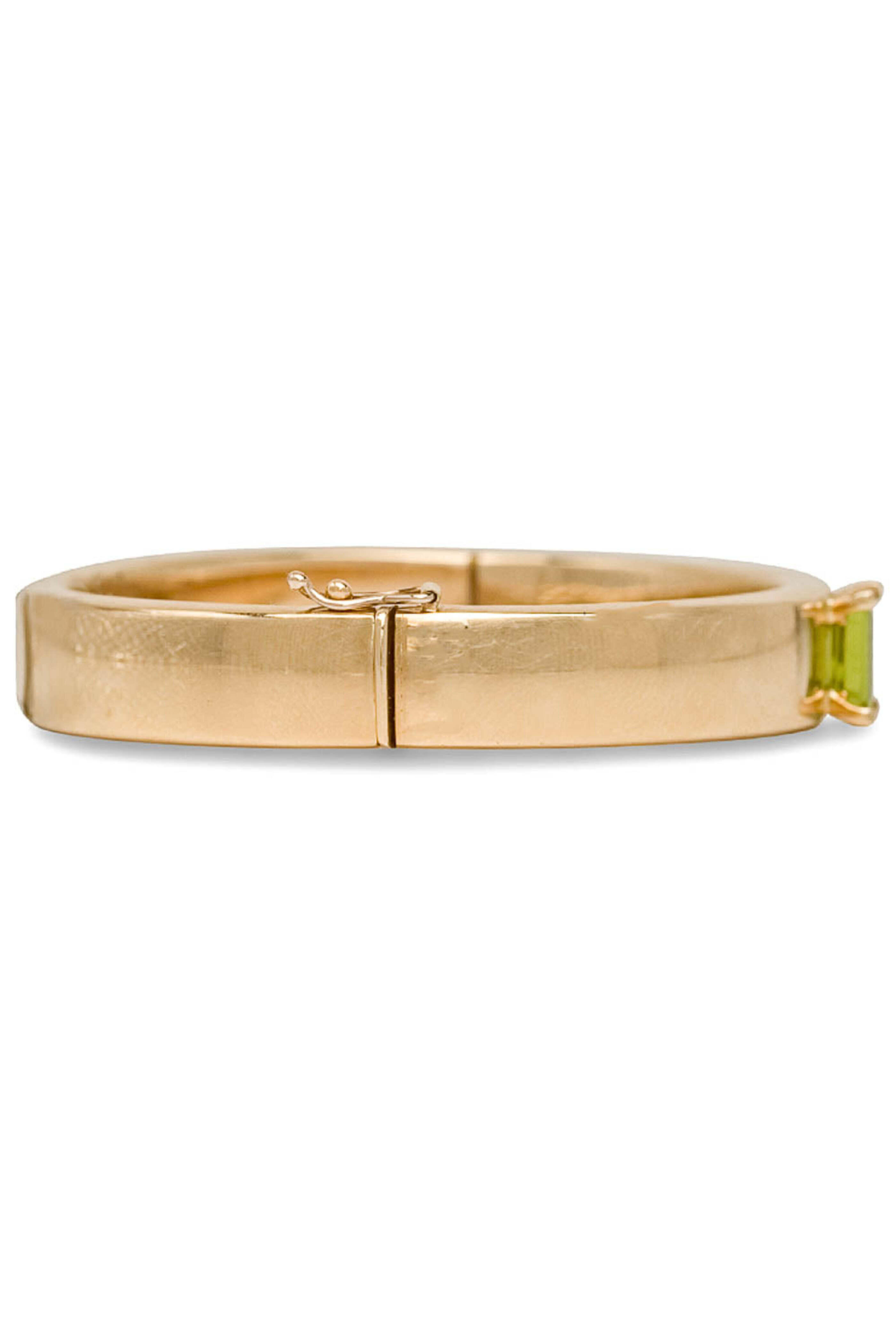 - Hannah Ferguson Yellow Gold Emerald Cut Peridot Bangle Bracelet 14k yellow gold Emerald cut peridot center stone Interior dimensions: 2.375 W x 2 W 0.425 wide Side hinge opening Push lock clasp with safety latch