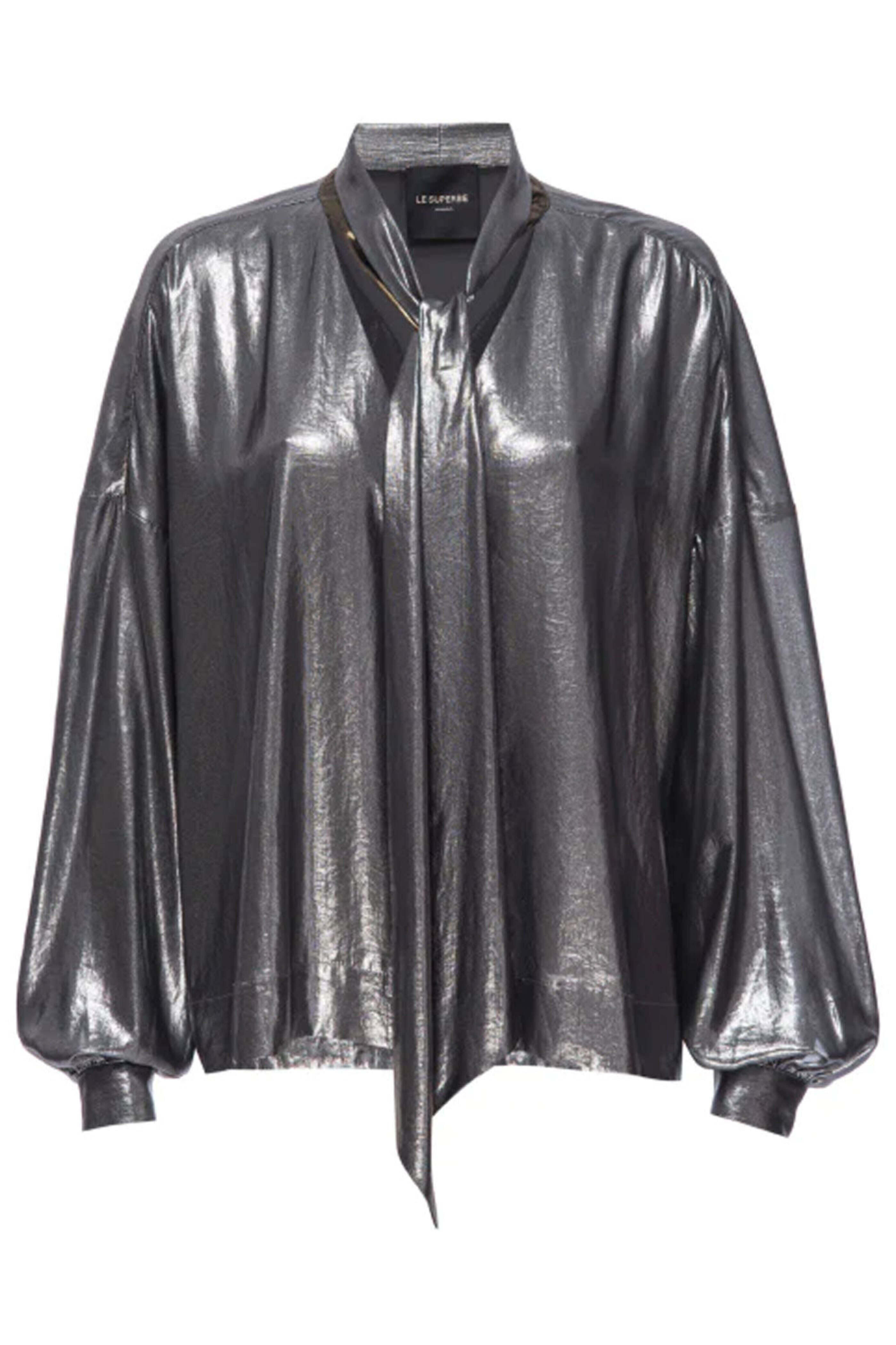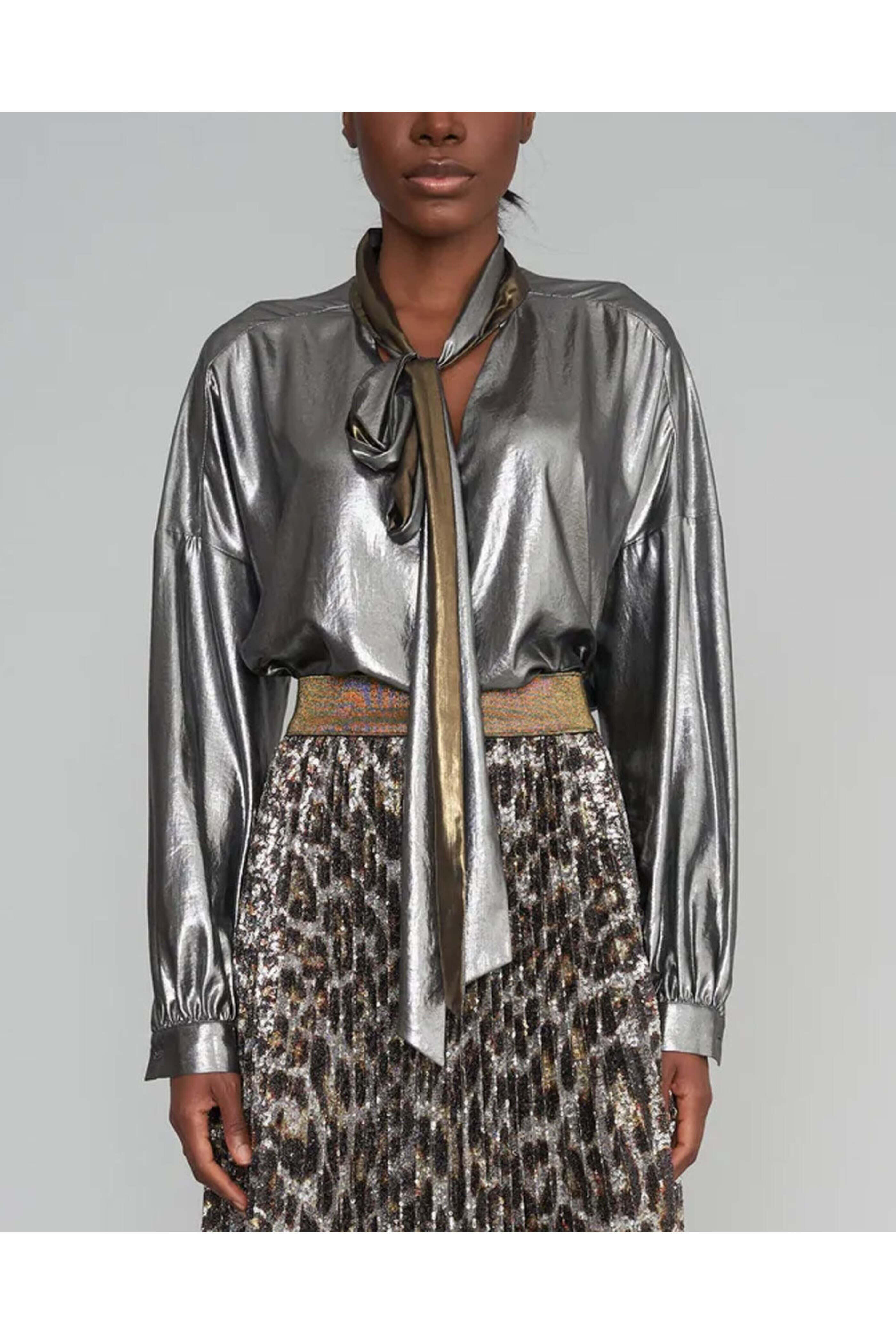Le Superbe Vintage Gold Pewter Costes Tie Front Blouse. V neck. Self-tie detail at neck. Drop shoulders. Long sleeves; button cuffs. Oversized fit. Bicolor fabrication. 100% polyester.