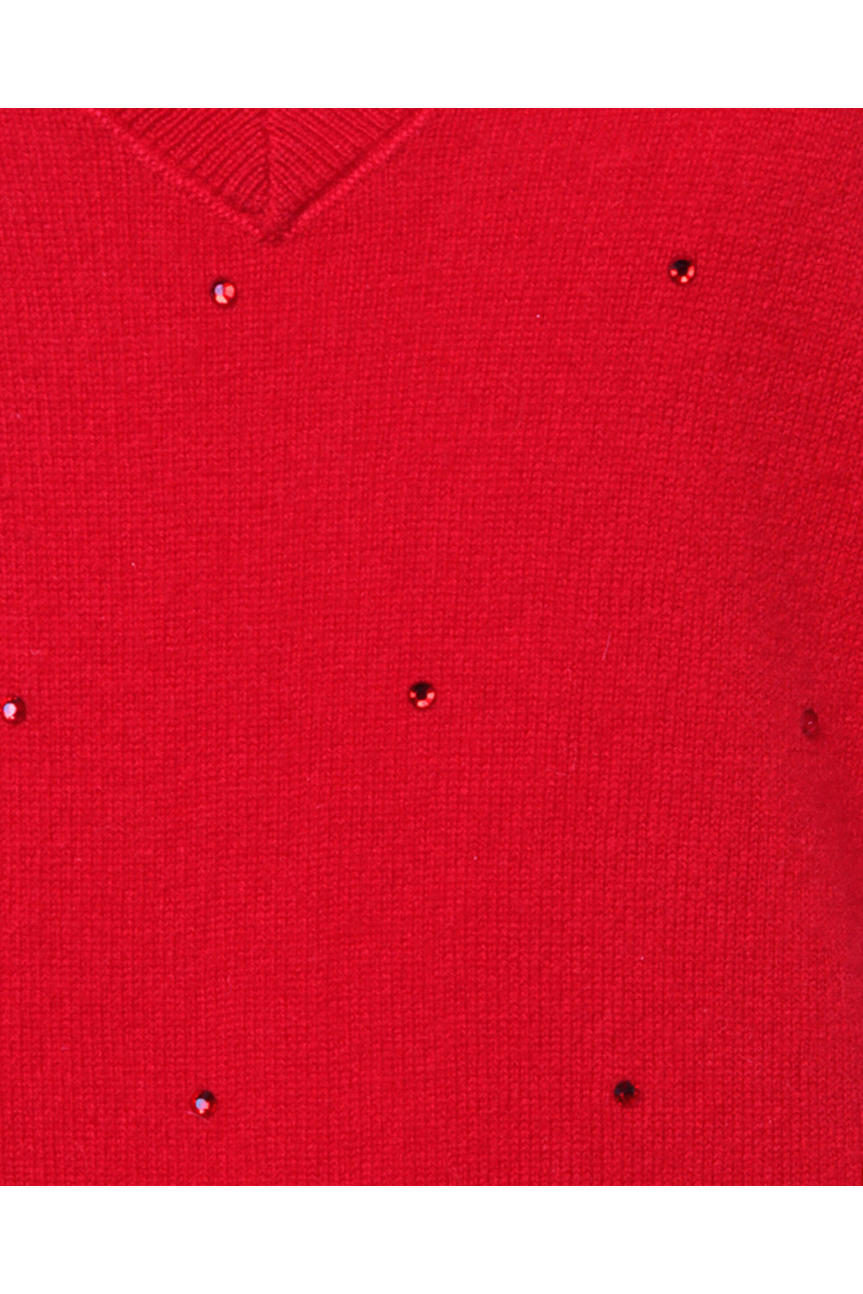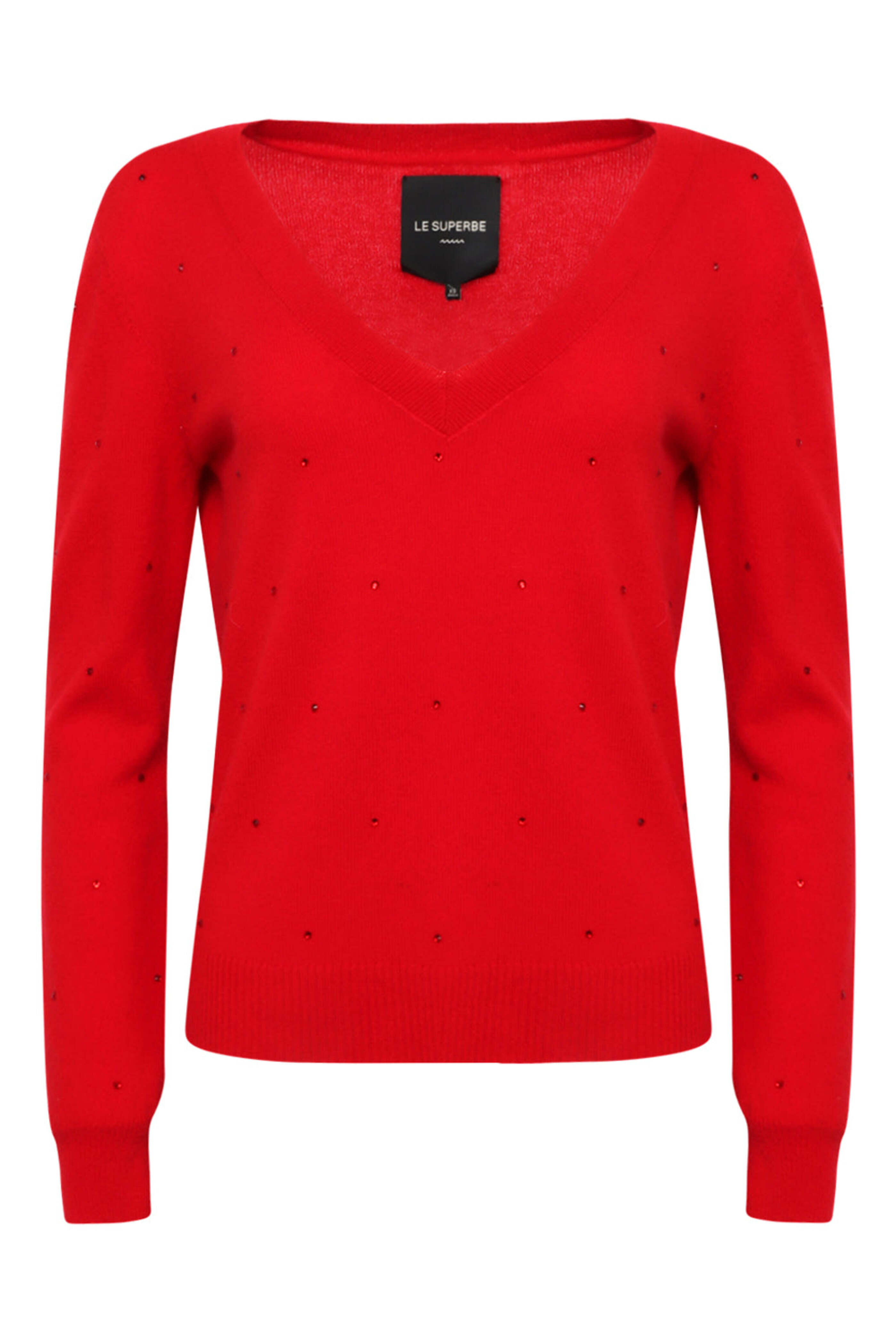 Le Superbe Rouge Be Mine Disco Knit Sweater. V neck. Drop shoulders. Long sleeves. Relaxed fit. Ribbed neck, cuffs, and hem. Rhinestone detail throughout. 100% cashmere.