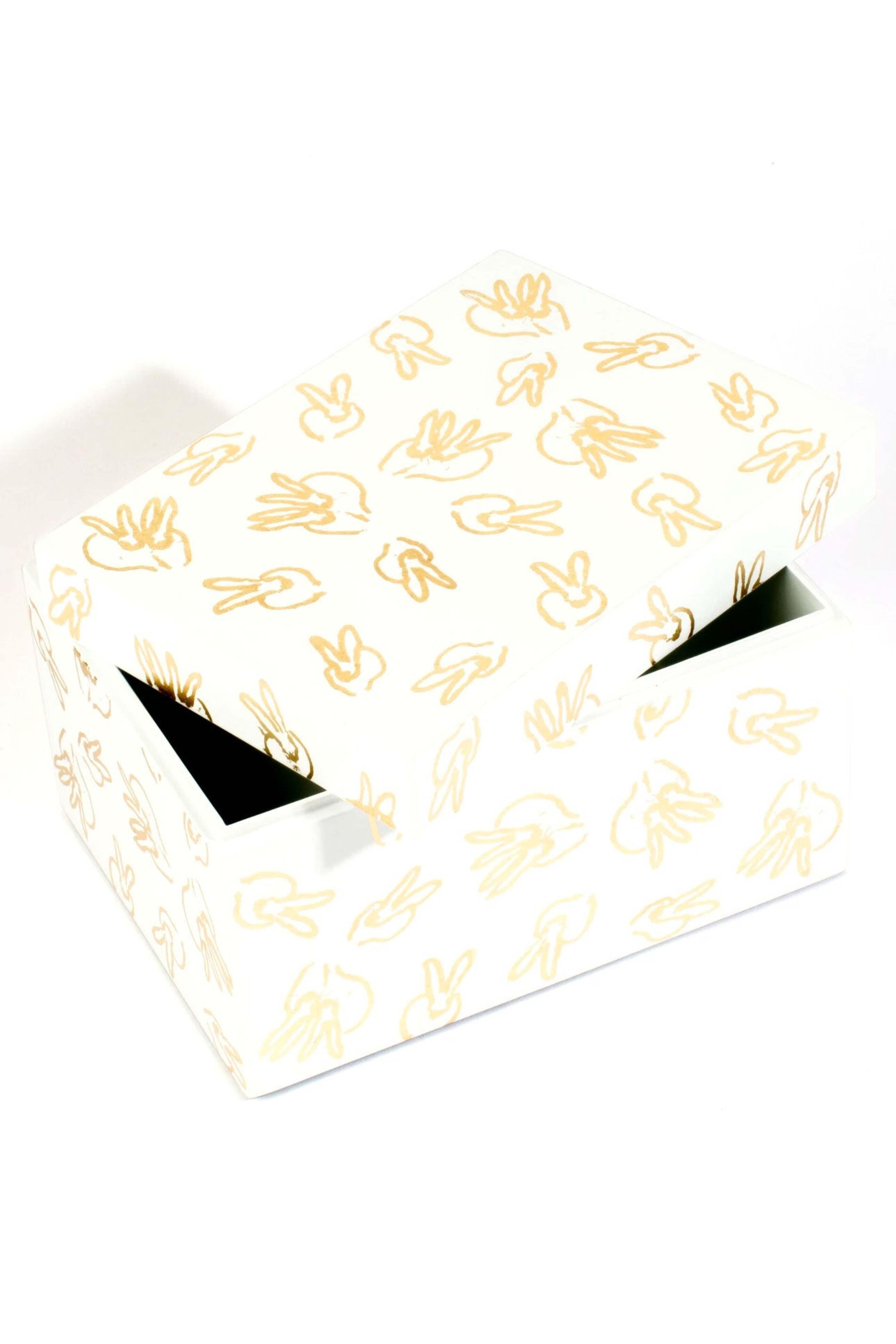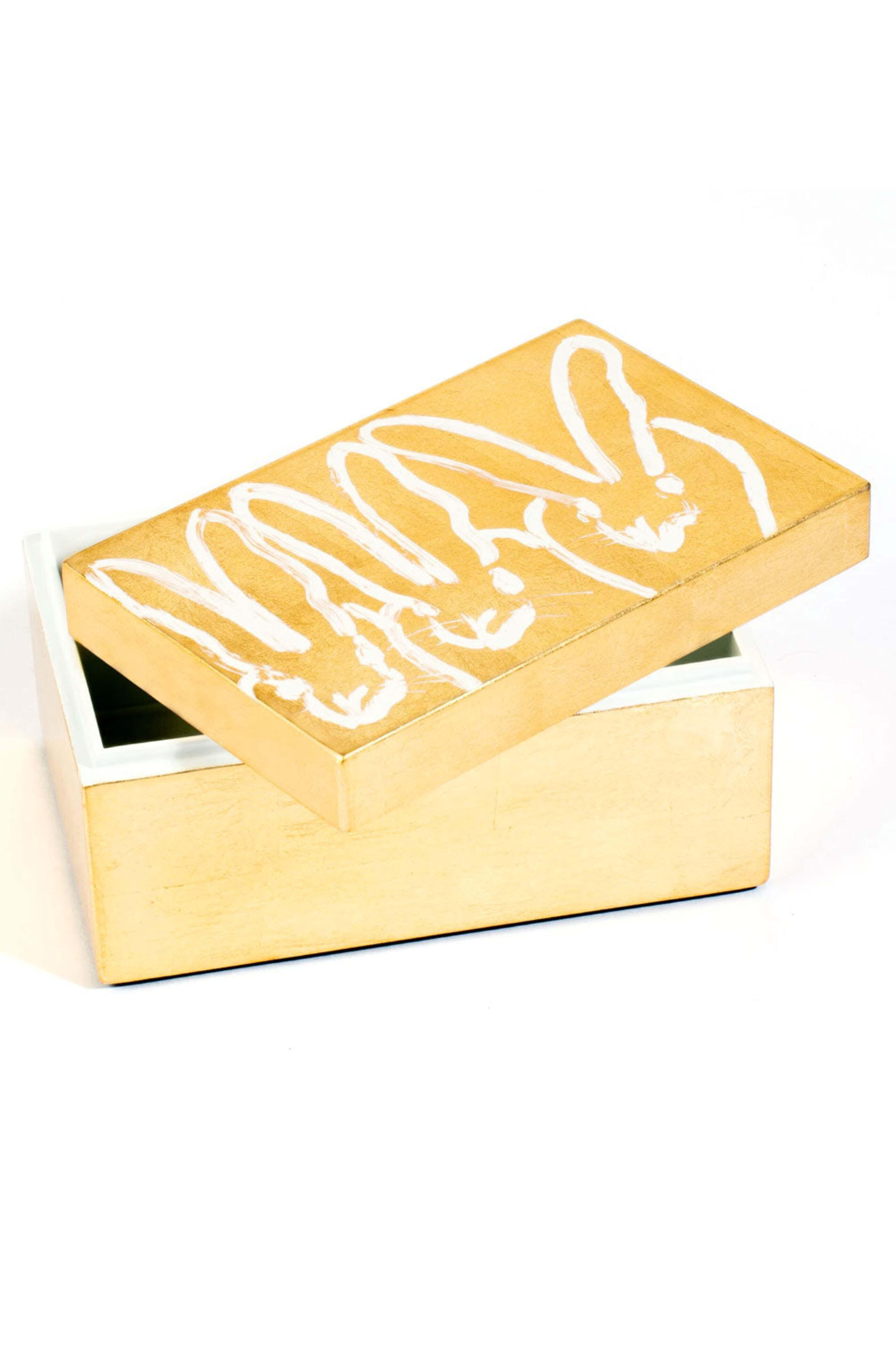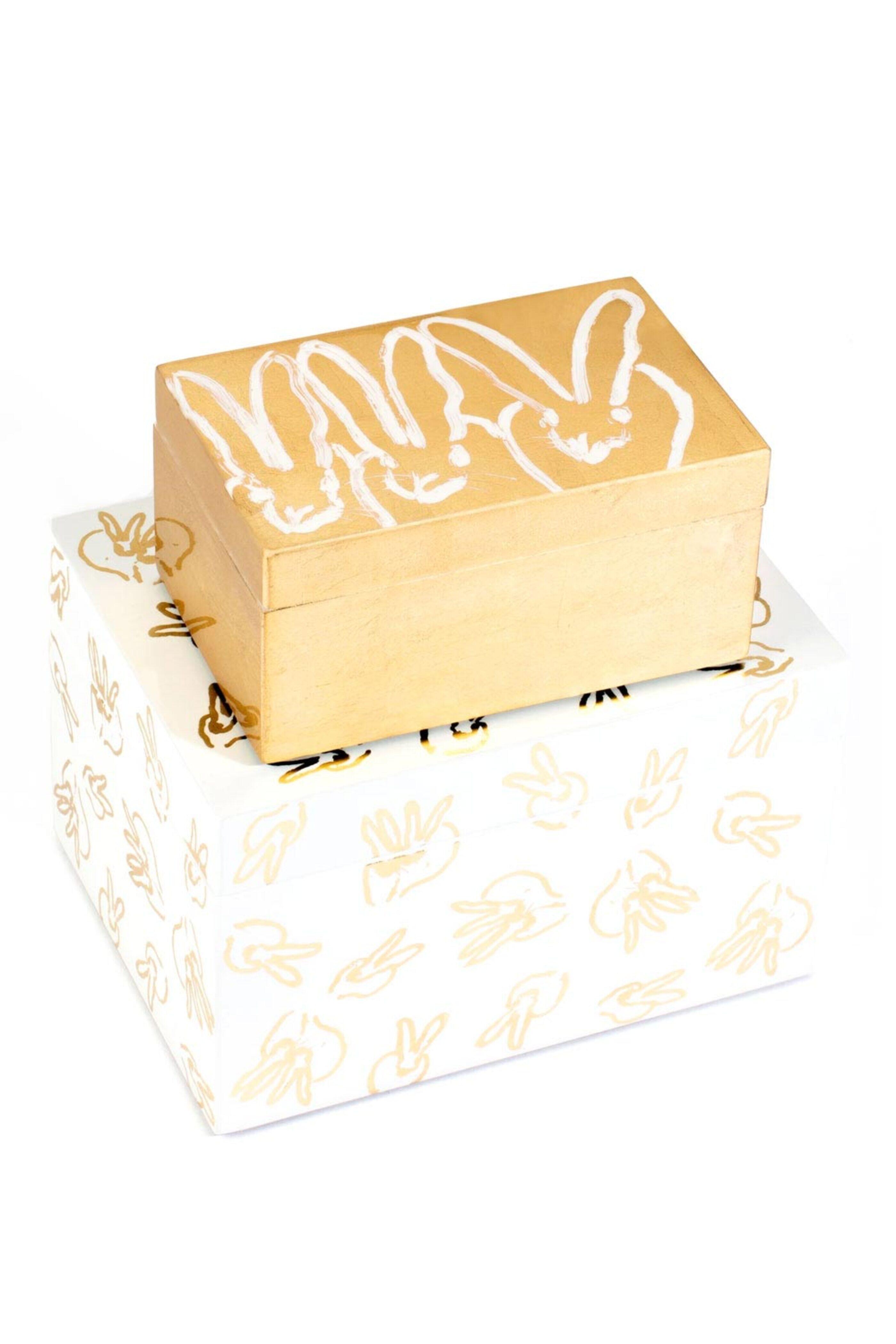- Hunt Slonem Gold Leaf Bunny Lacquer Box Set Includes both boxes Each box is finished inside in white Larger box measures 8 in. x 6 in. x 5 in. Smaller box measures 6 in. x 4 in. x 3 in.
