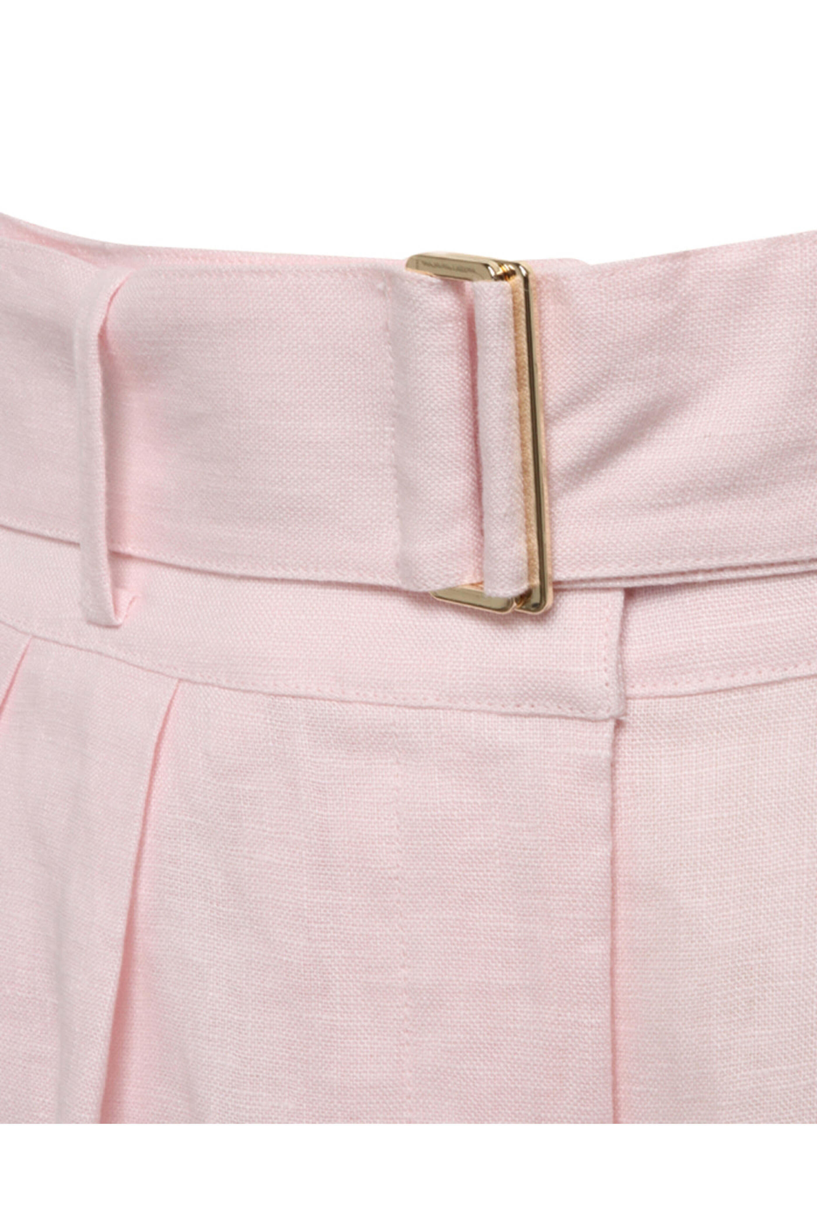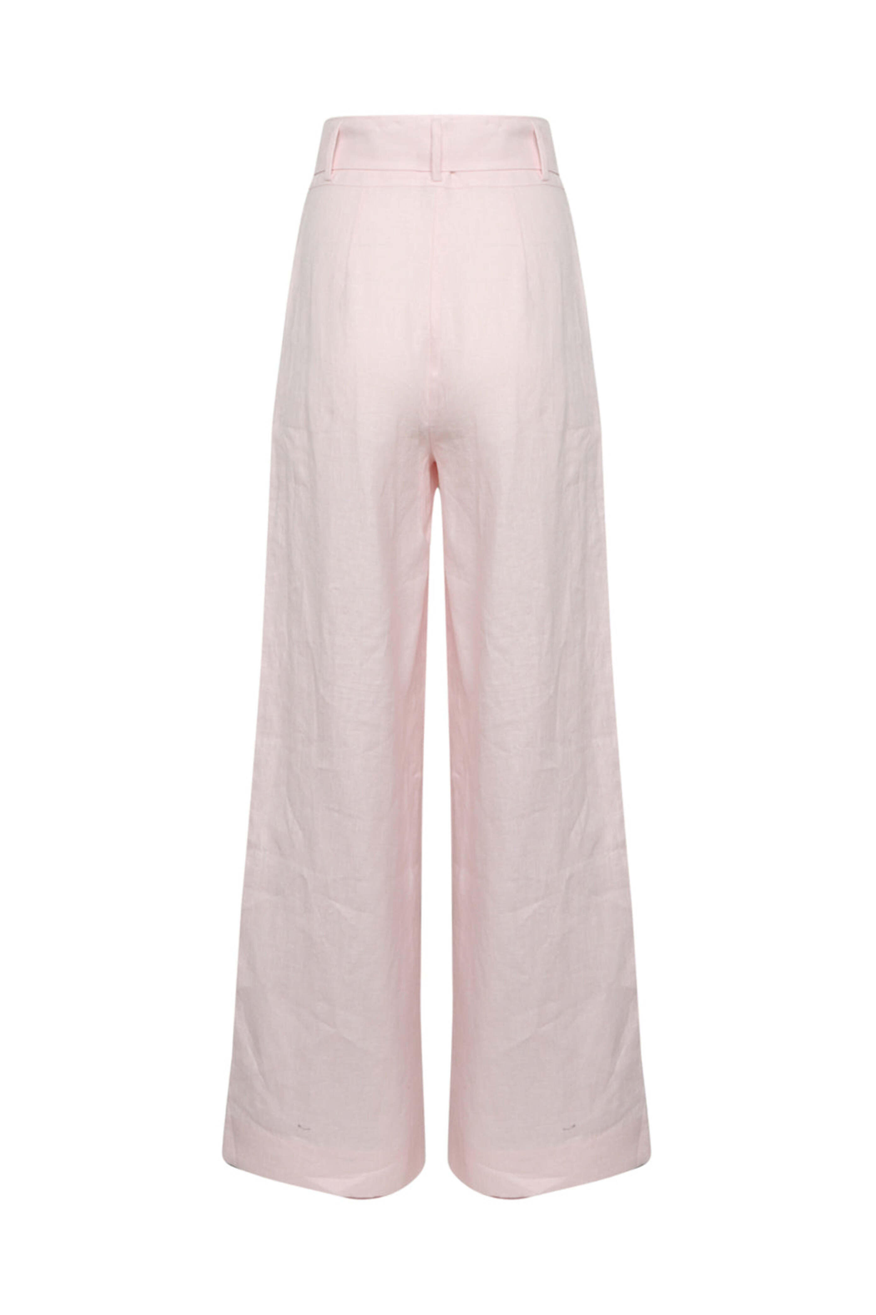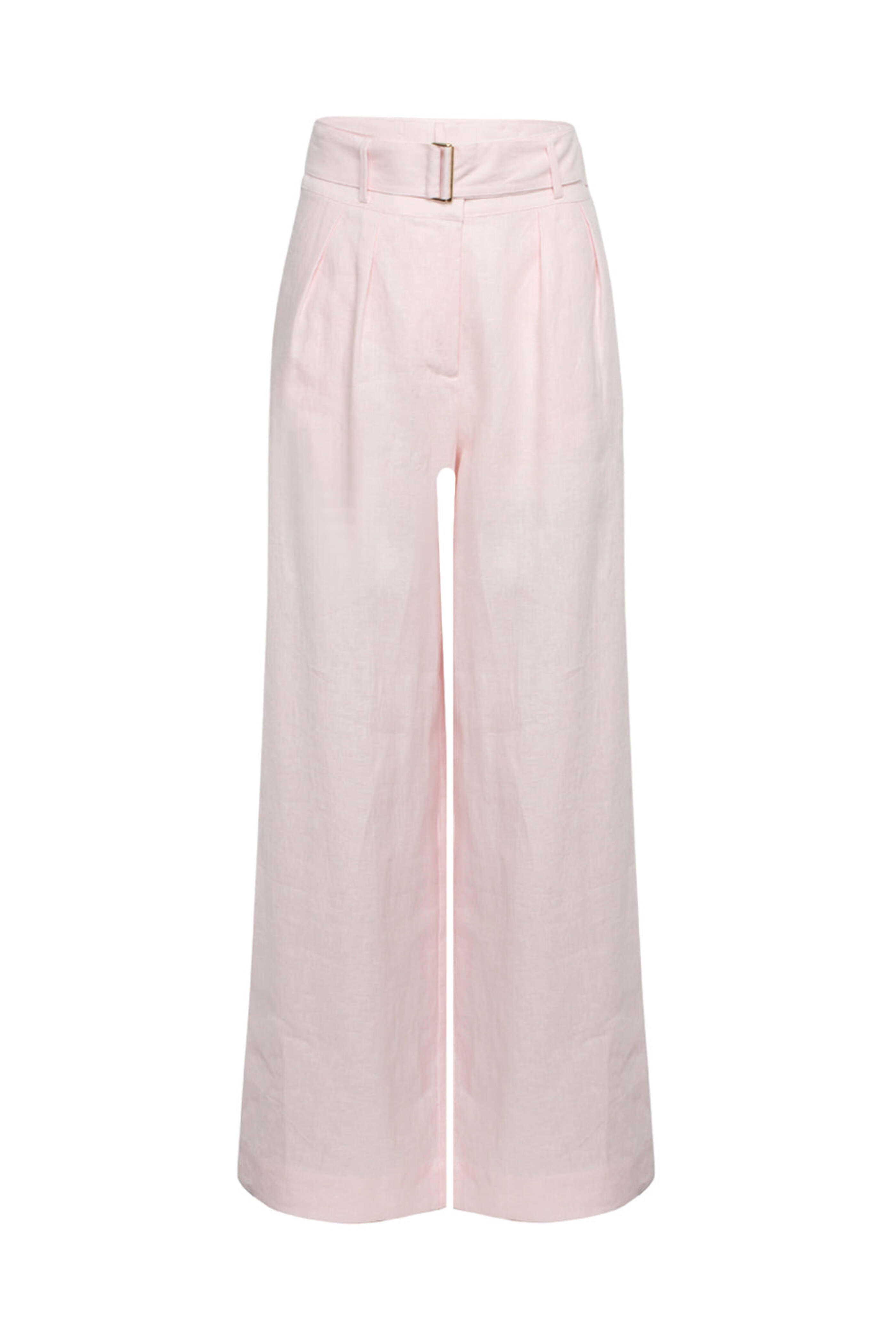 Hevron Rose Quartz Alina Pant. High rise. Hook and eye closure. Zip fly. Belt loops. Removable d-ring belt; self-fabrication. Front pleat detail. Side slip pockets. Wide through leg. Full length. 100% linen.