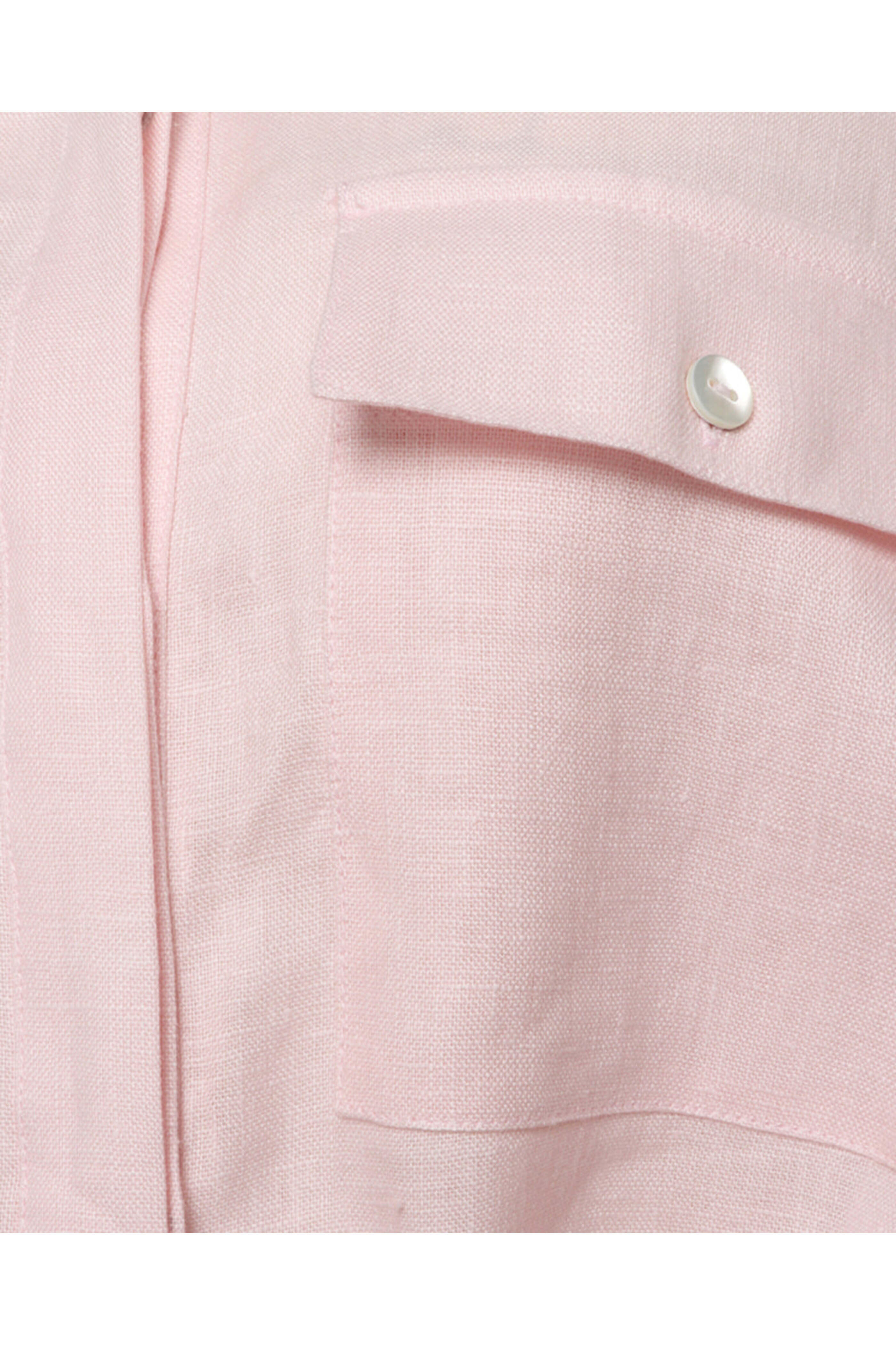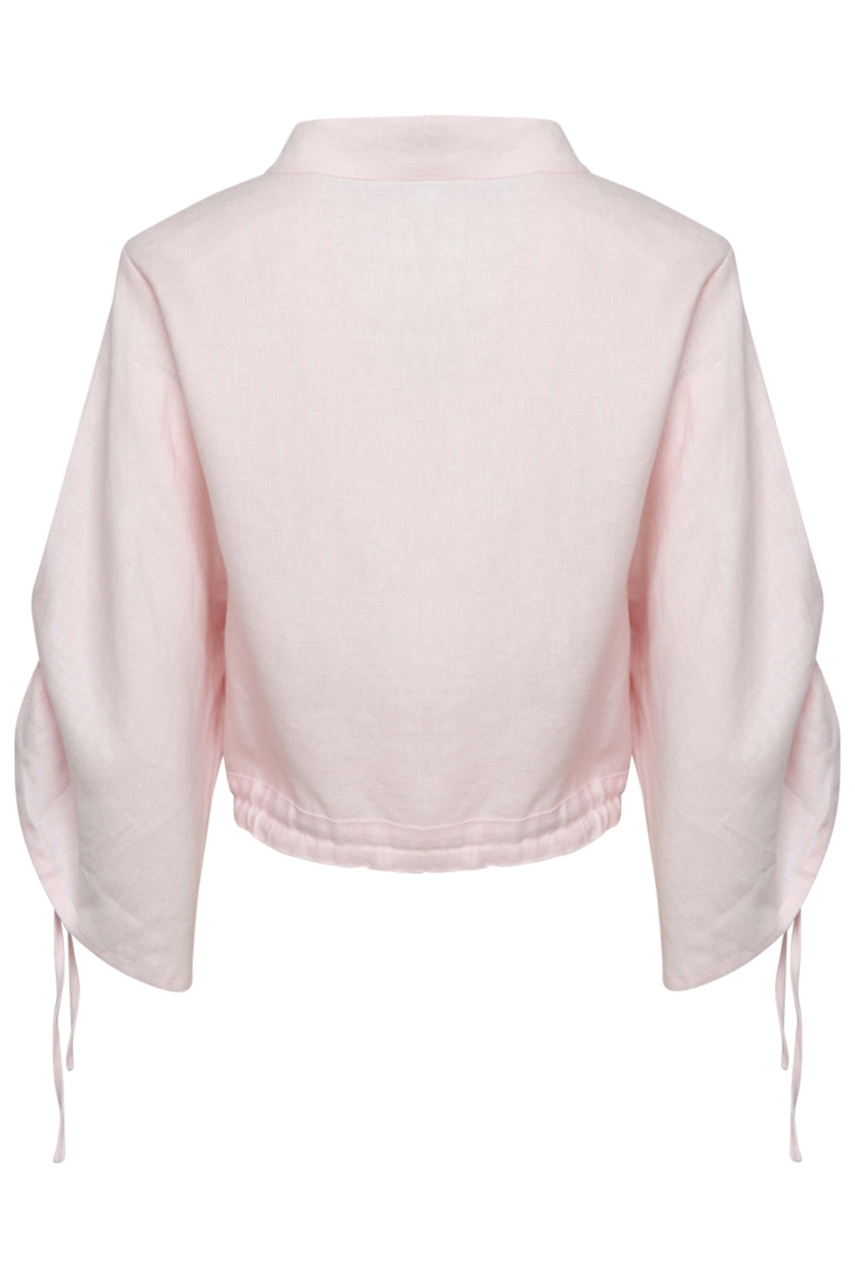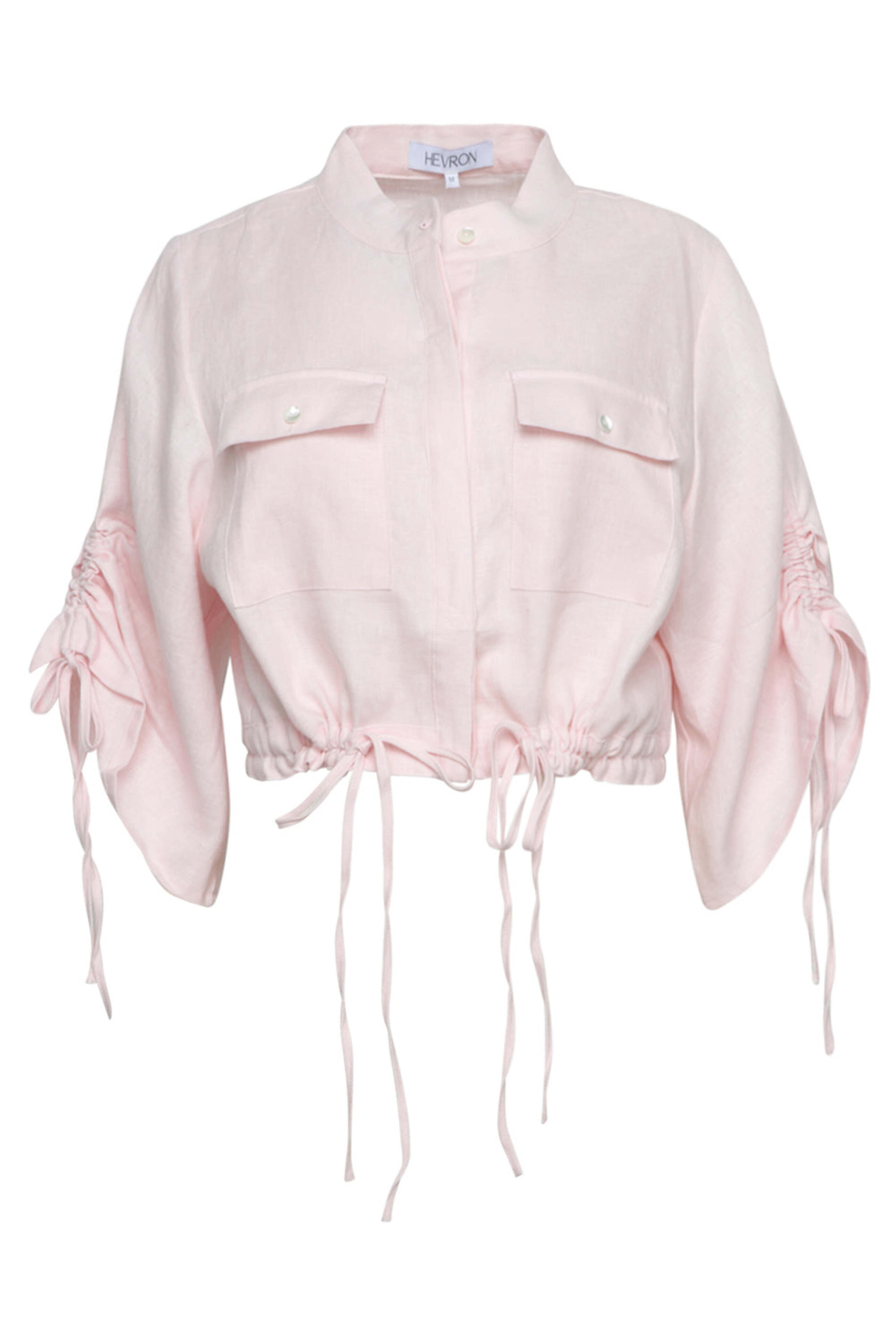 Hevron Rose Quartz Eva Top. Banded collar. ¾ length sleeve; ruched drawstring. Concealed button down front closure. Chest flap pockets; button closure. Drawstring hem. Boxy fit. Cropped length. 100% linen.