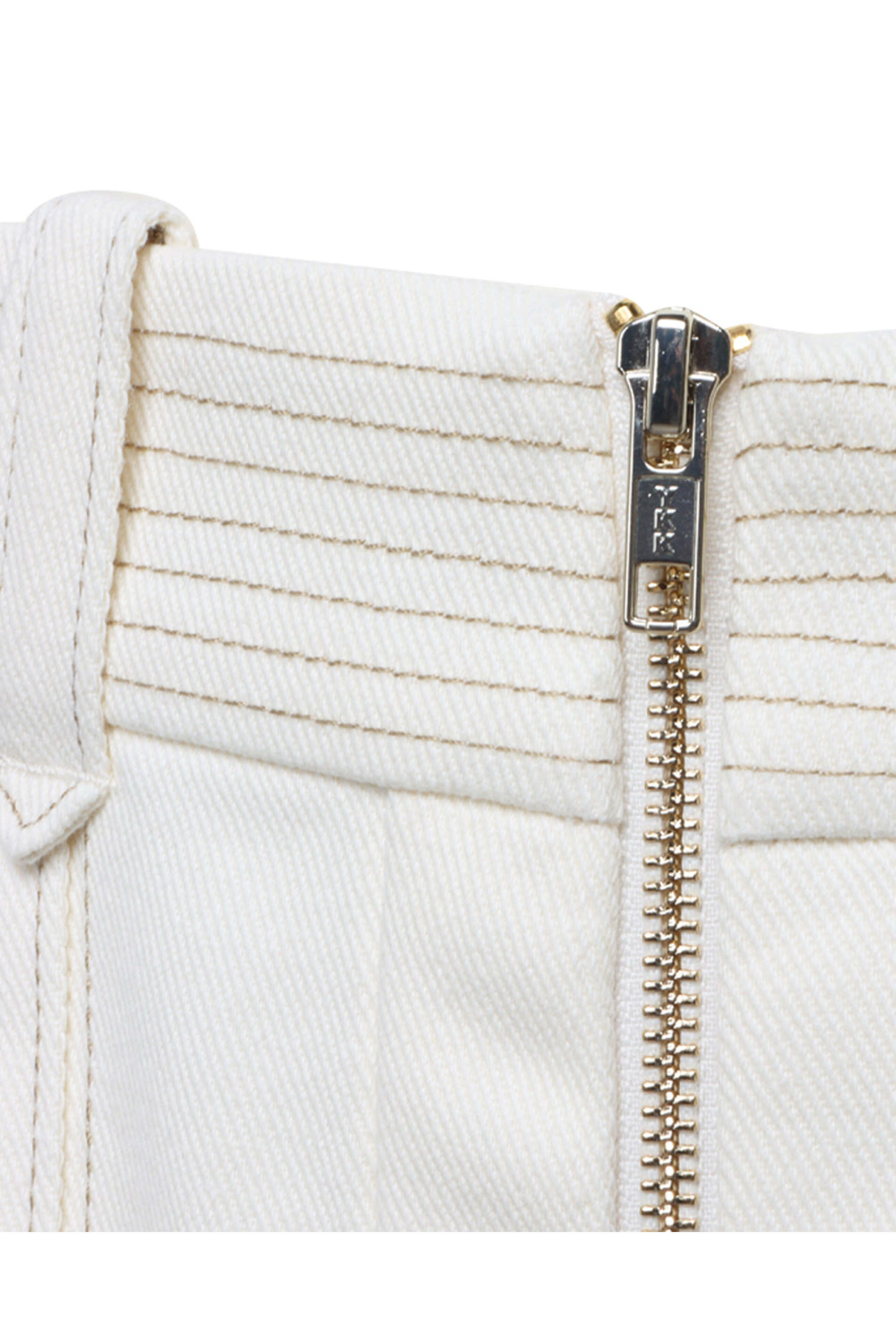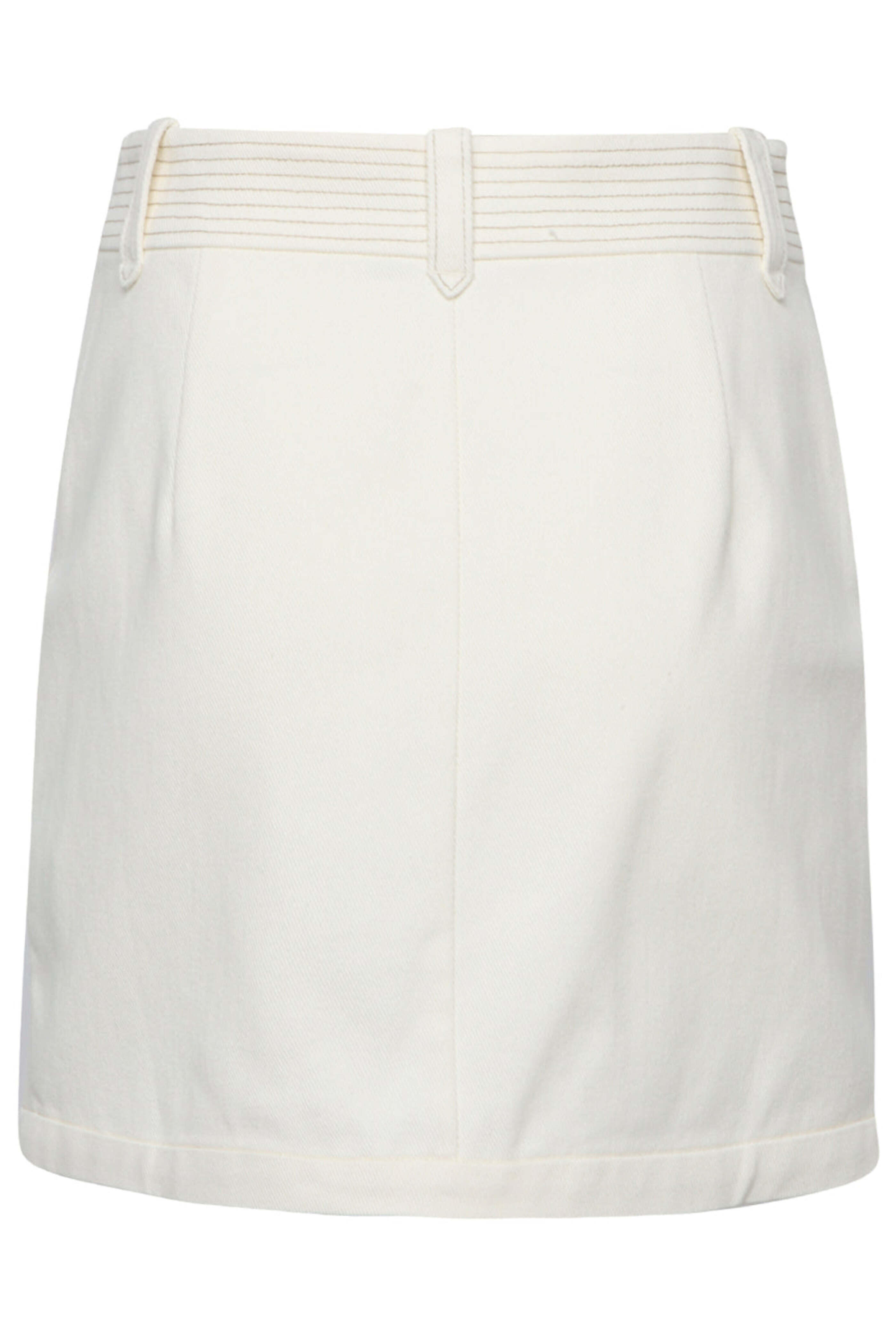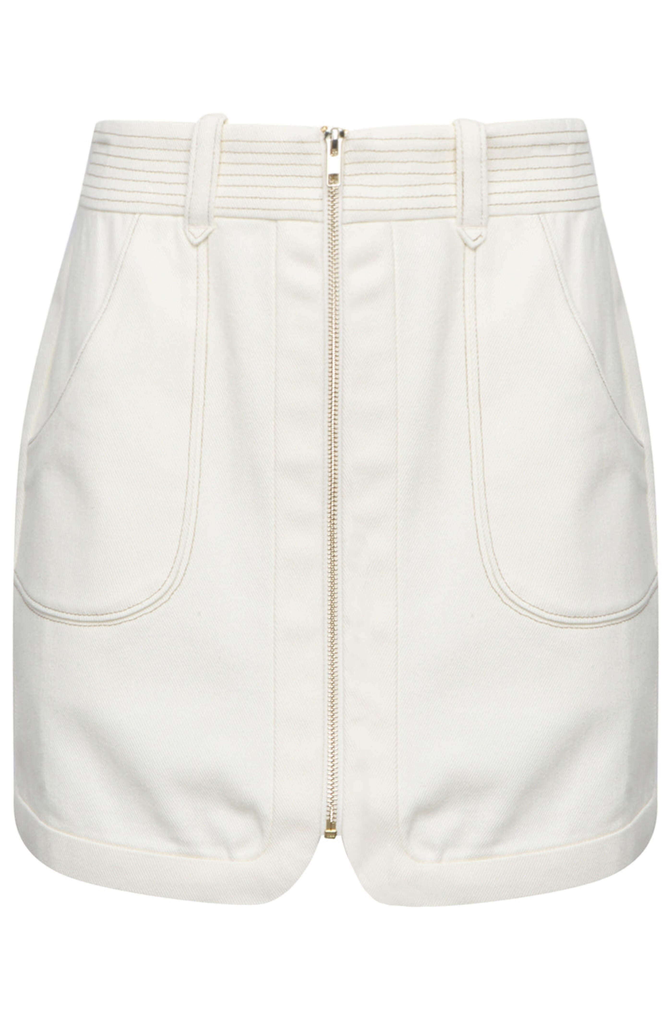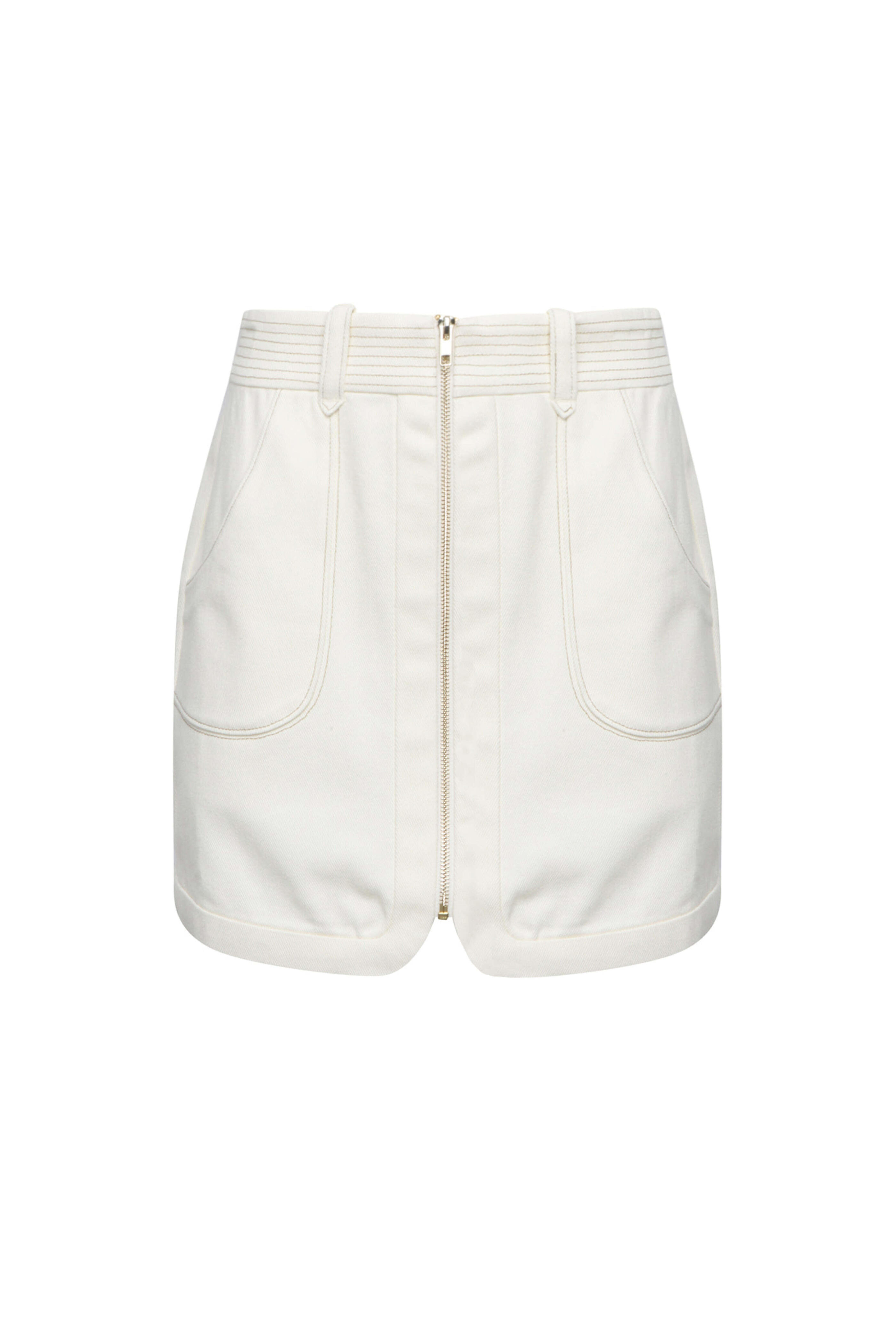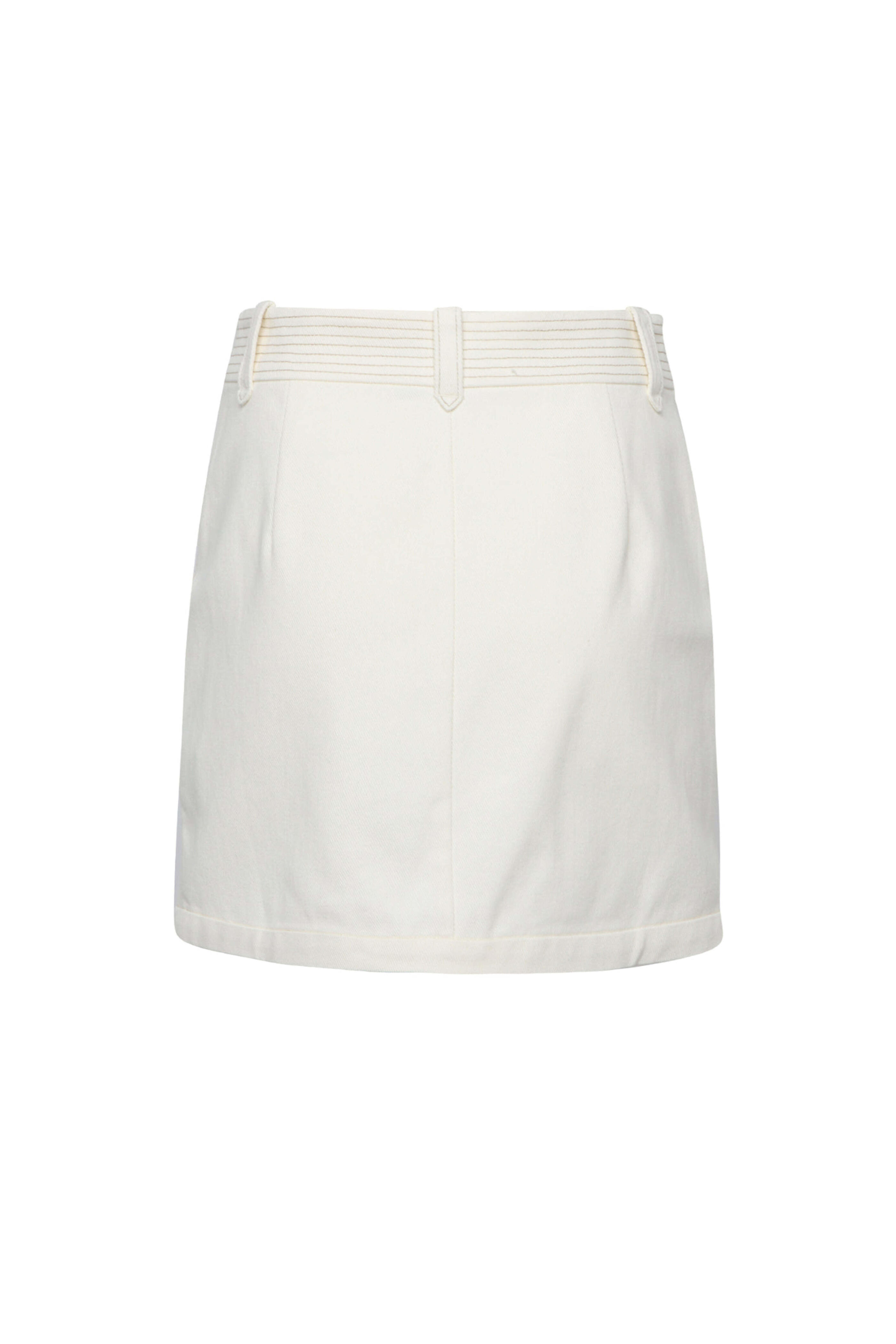 Hevron Ivory Nora Skirt. High rise. Belt loops. Front zip closure. Front slip pockets. Slim silhouette. Mini length. 100% cotton.