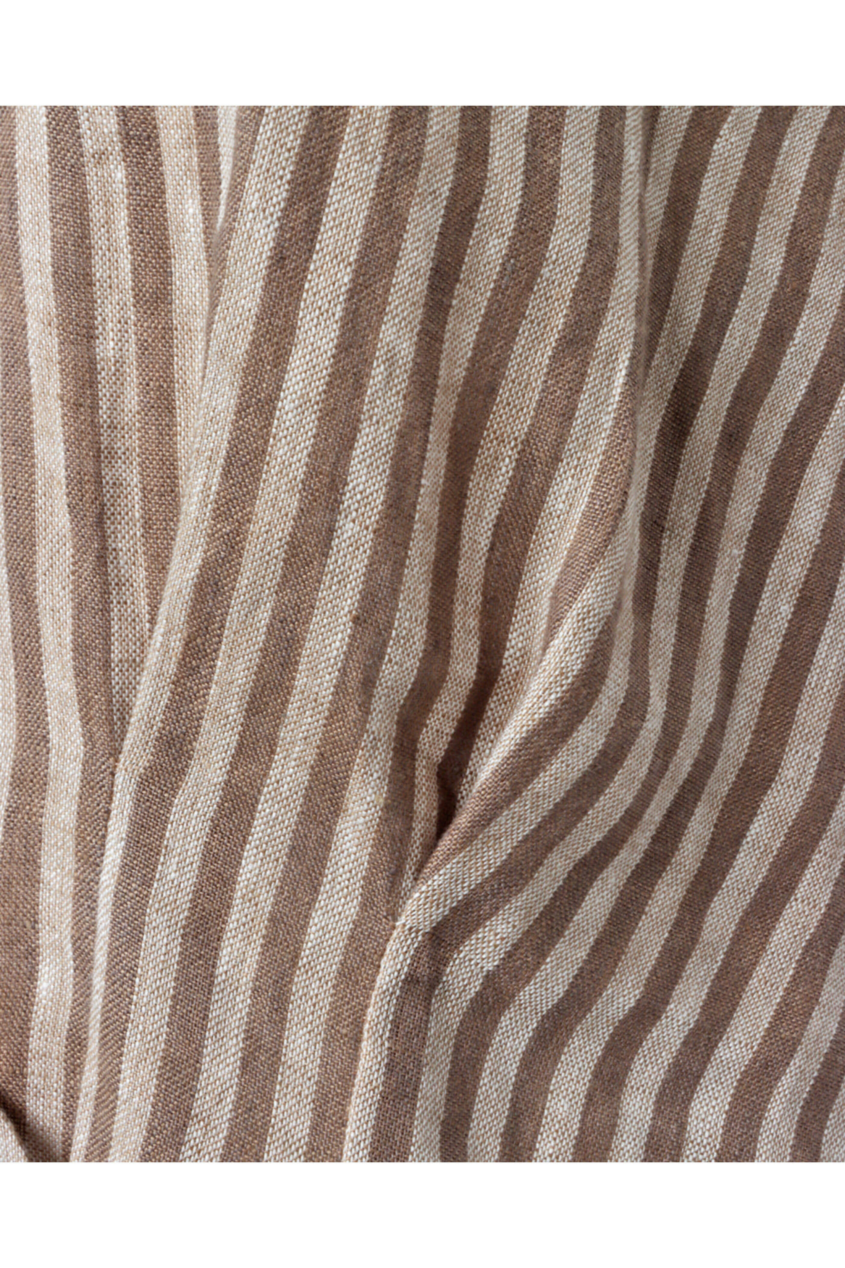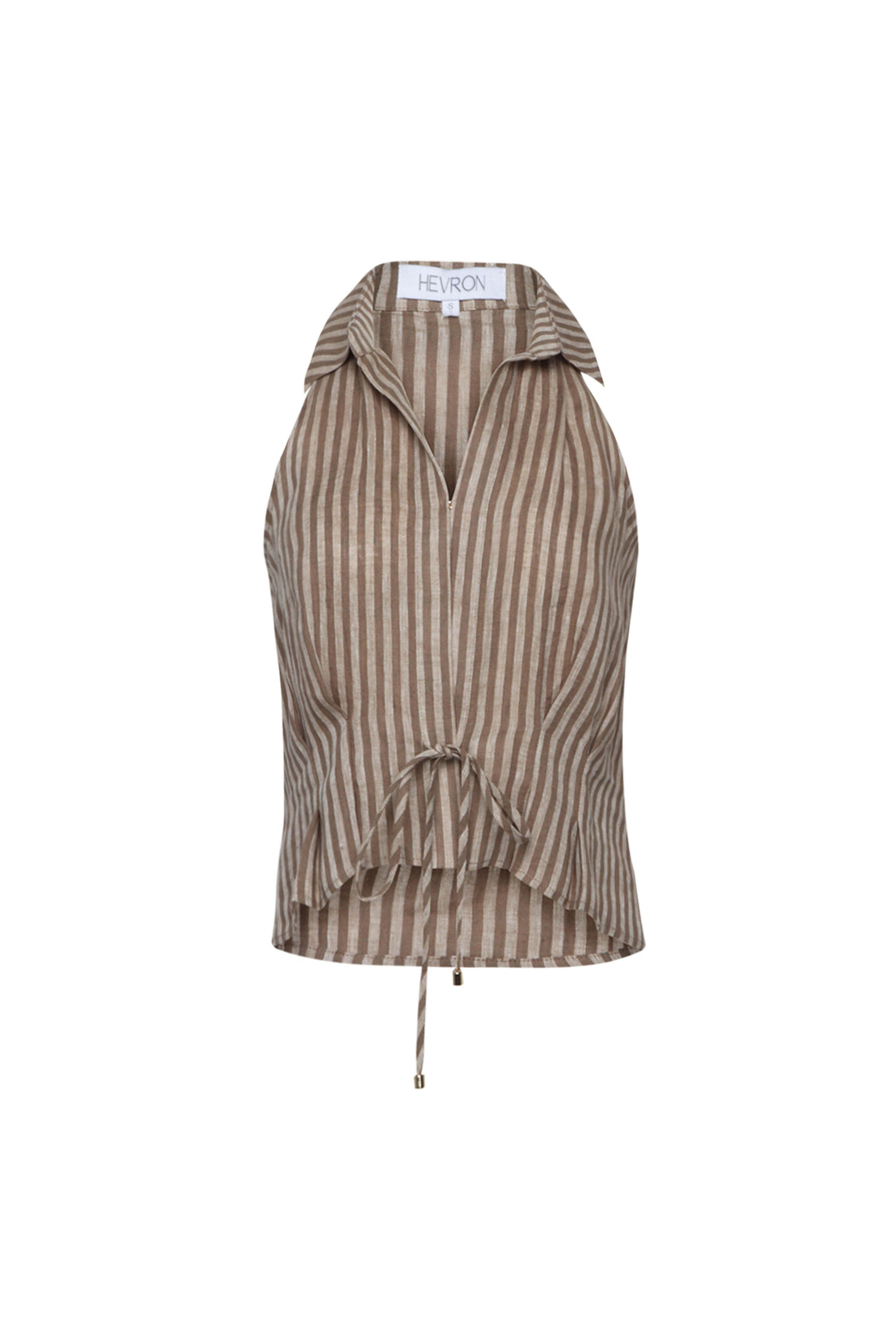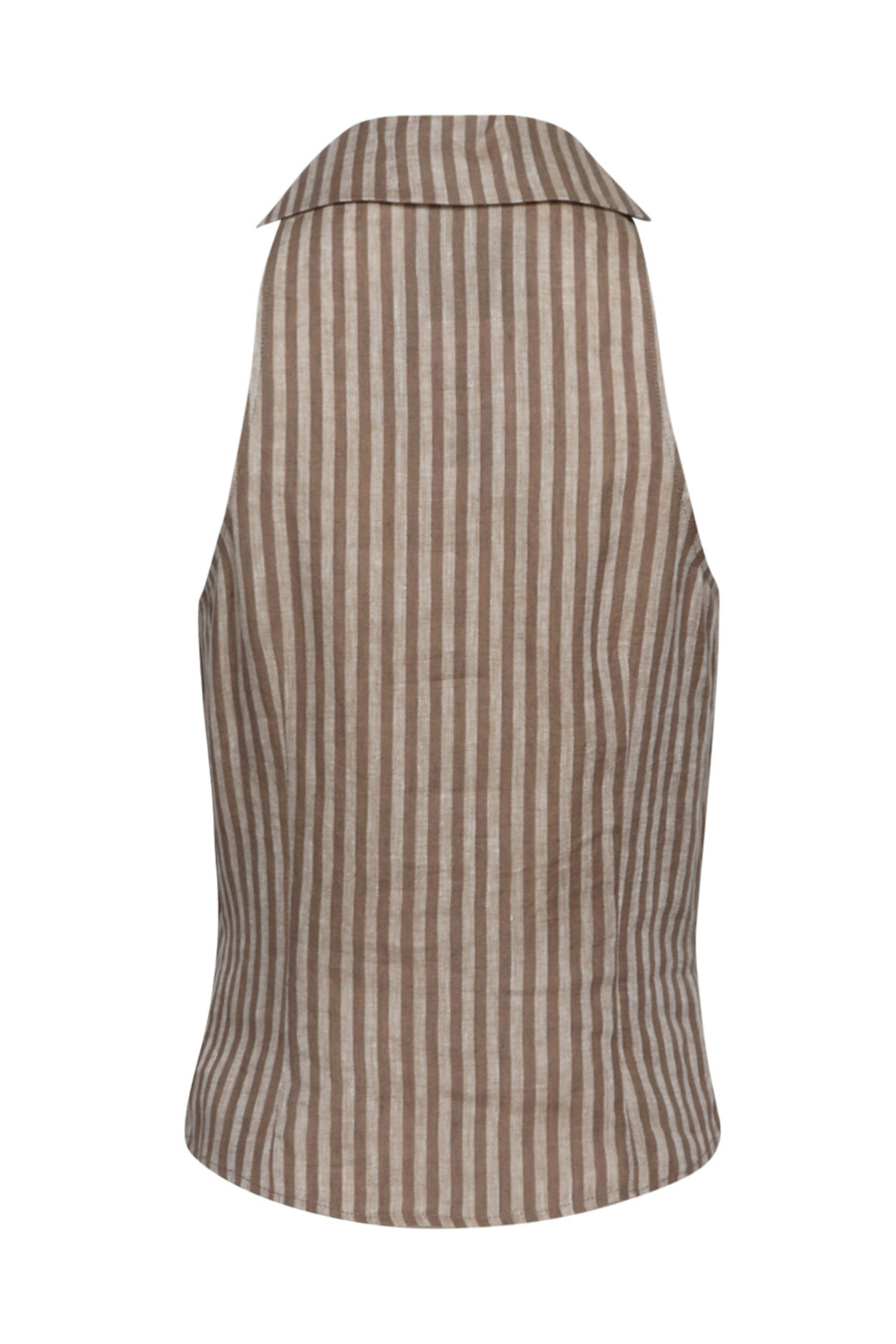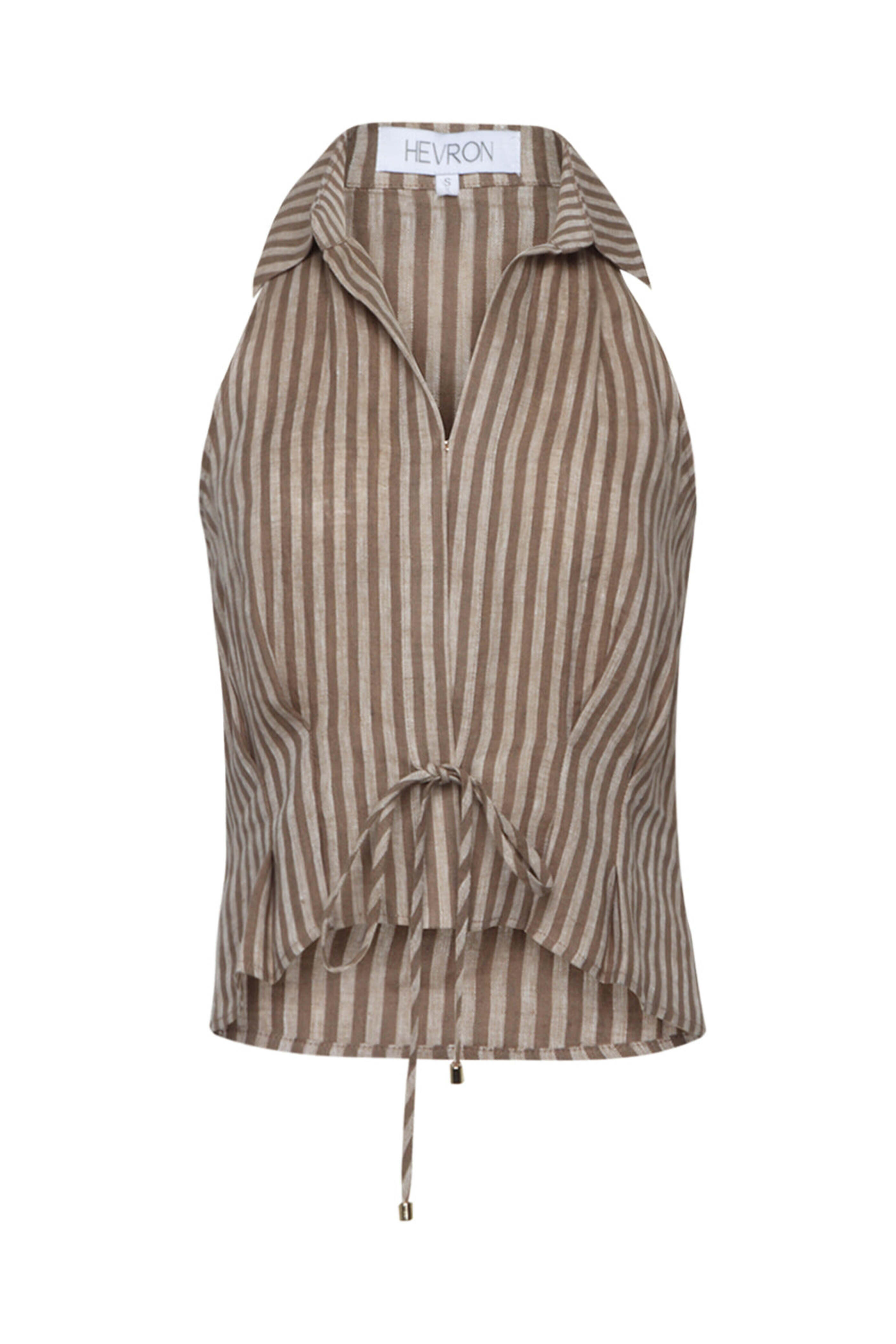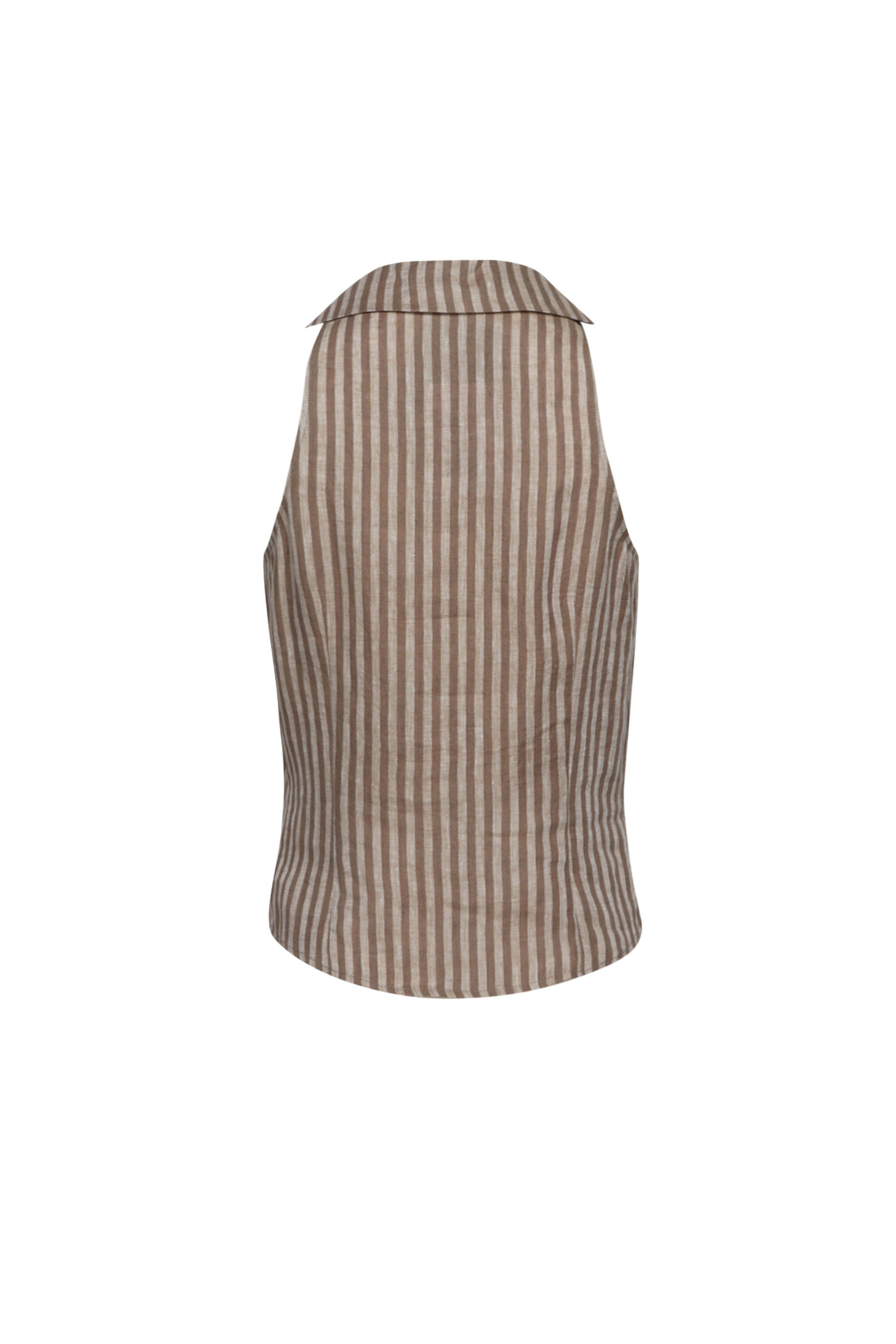 Hevron Chocolate Stripe Sloan Vest. Collar. V neck. Sleeveless. Concealed hook and eye closure. Self-tie drawstring. Pleated peplum silhouette. 100% linen.