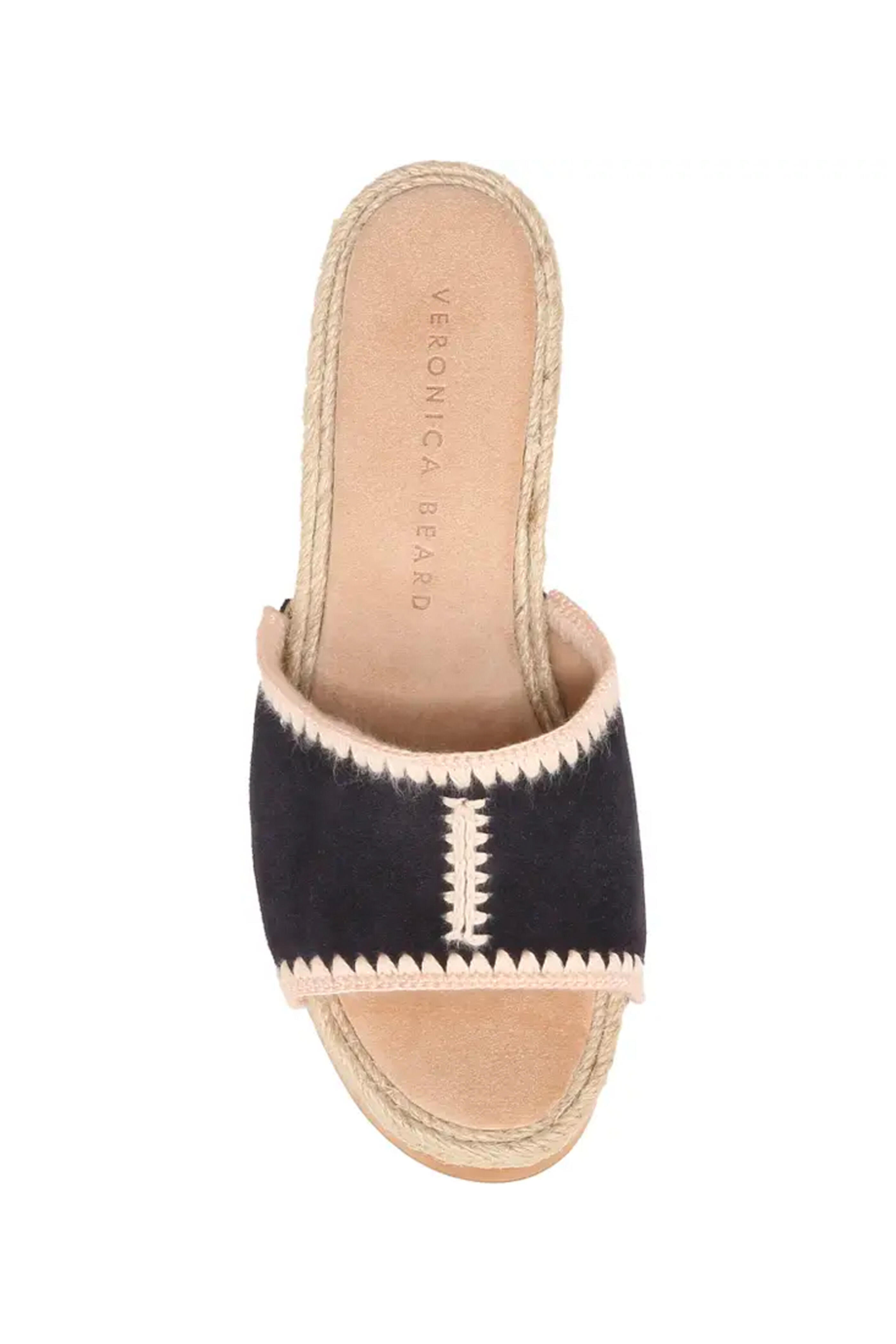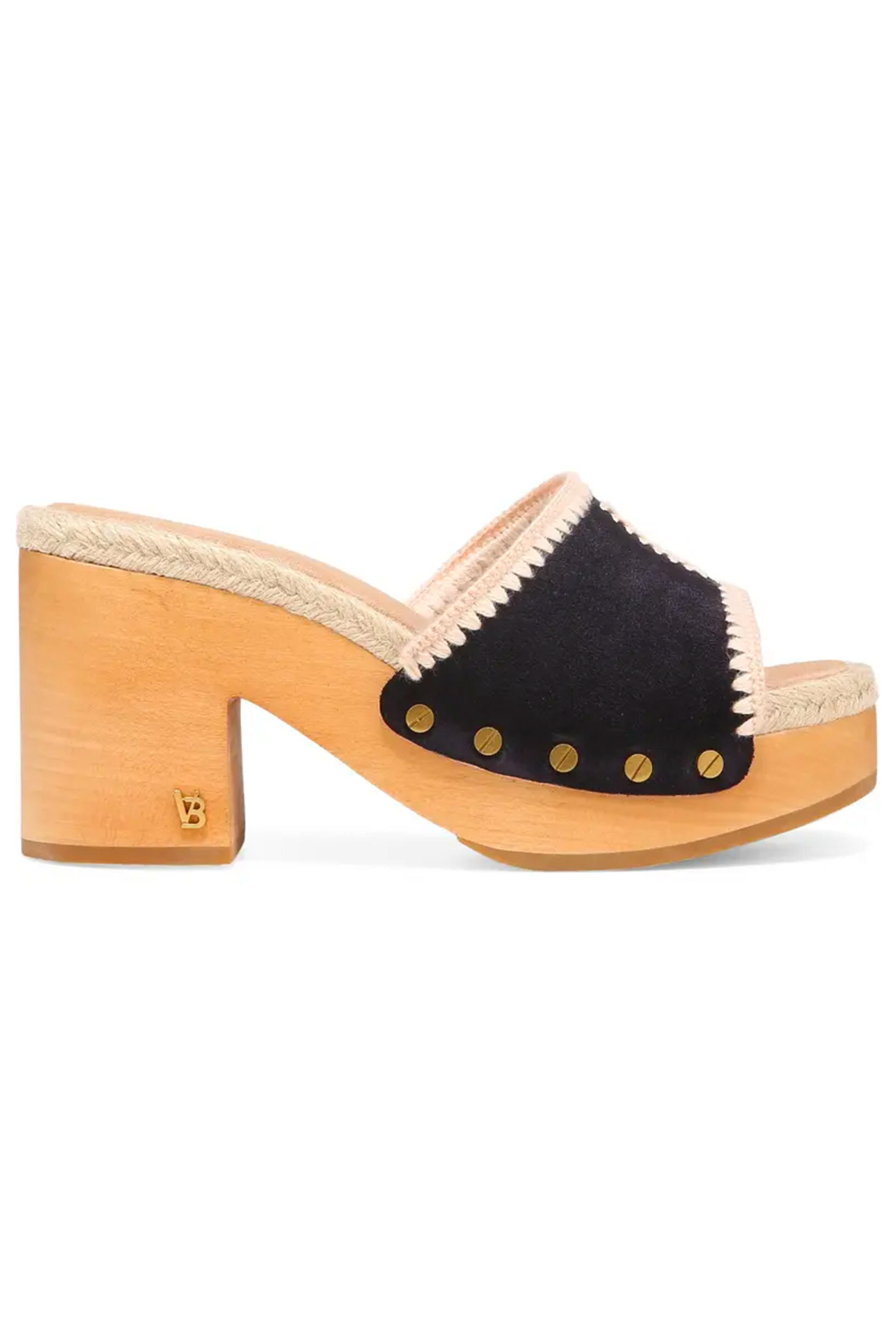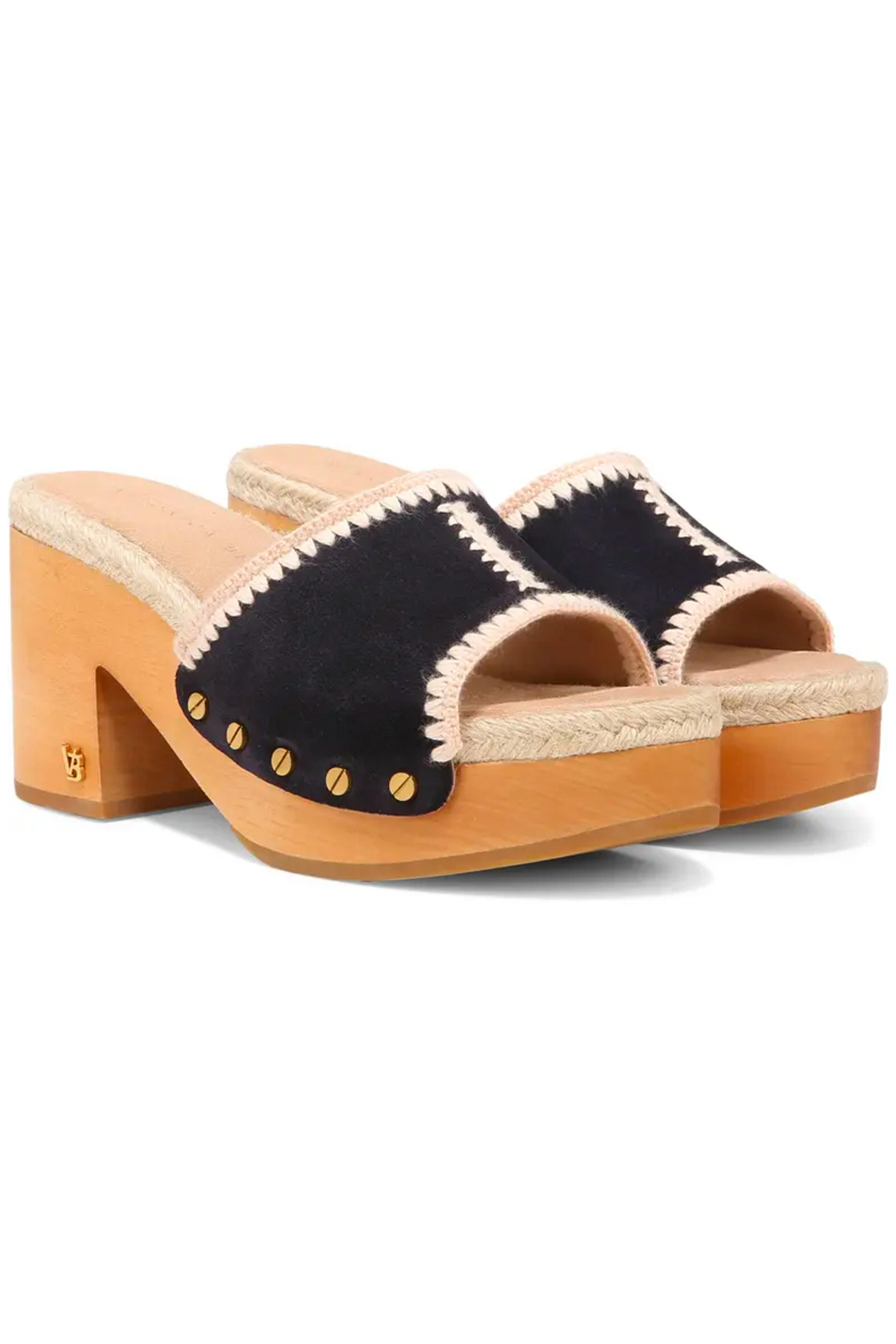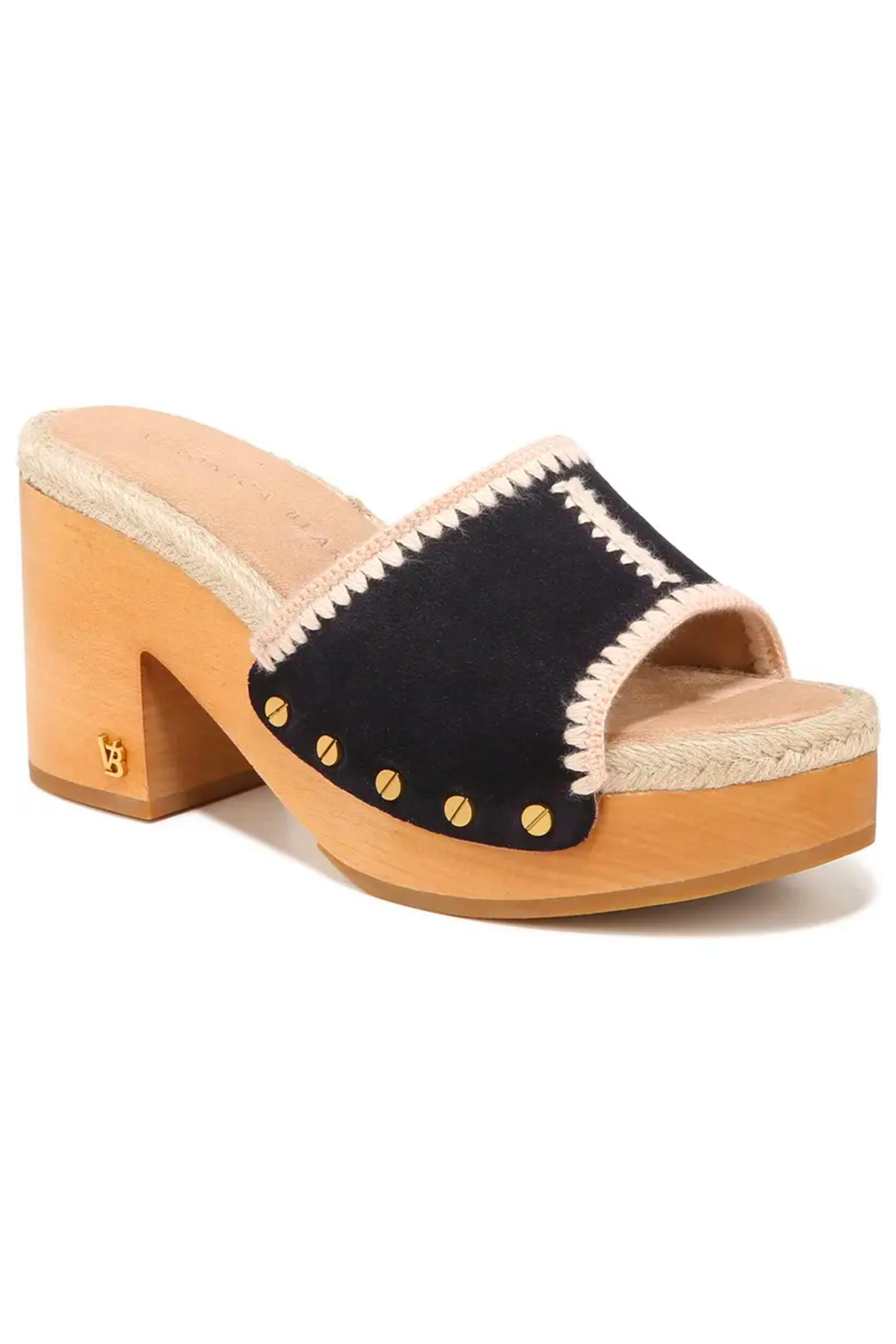 Veronica Beard Hannalee Clog Sandals. Round toe. Slip On. 3 1/2" wooden block heel. Suede vamp with side studs and white jute contrast. Suede and jute upper. Rubber sole.