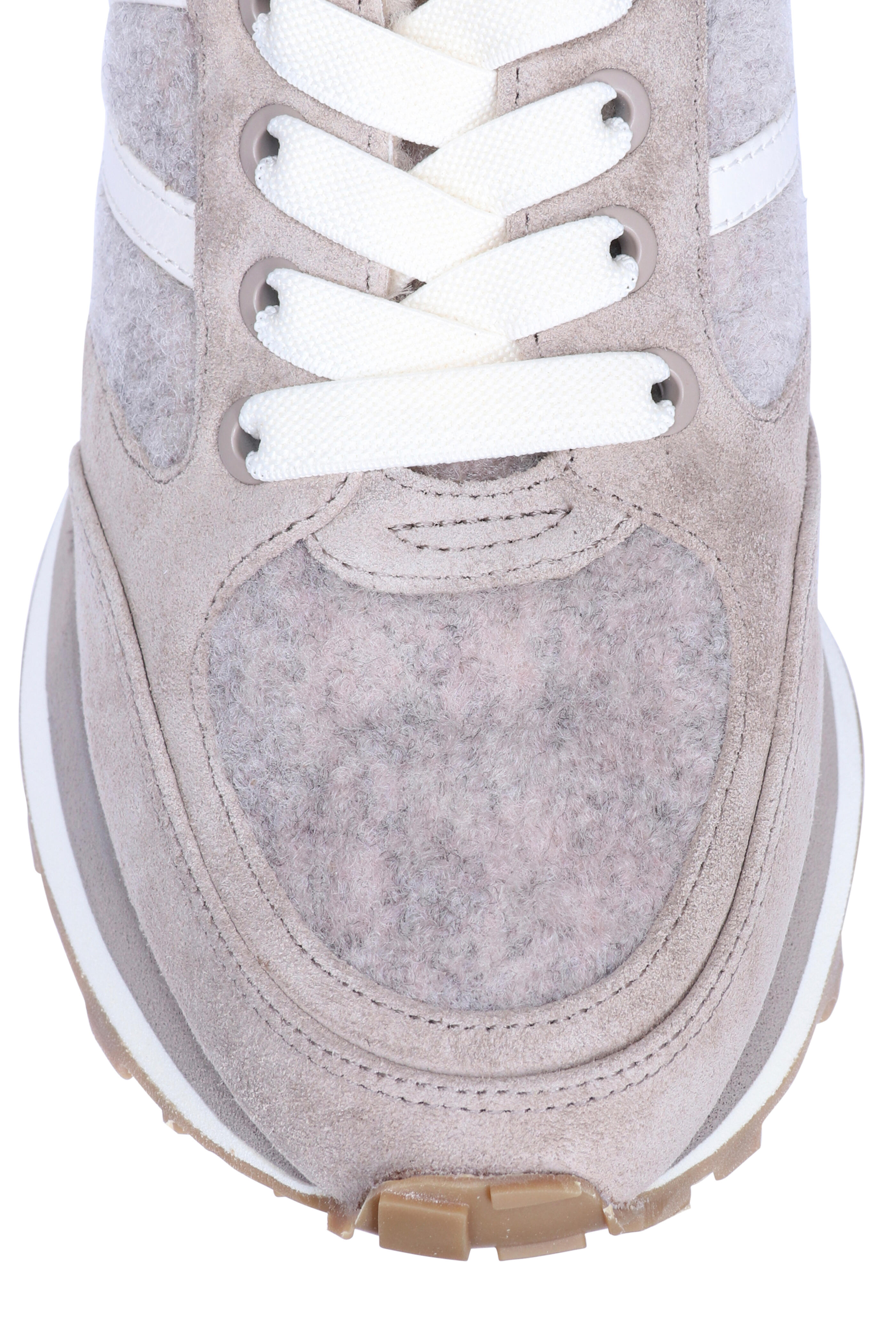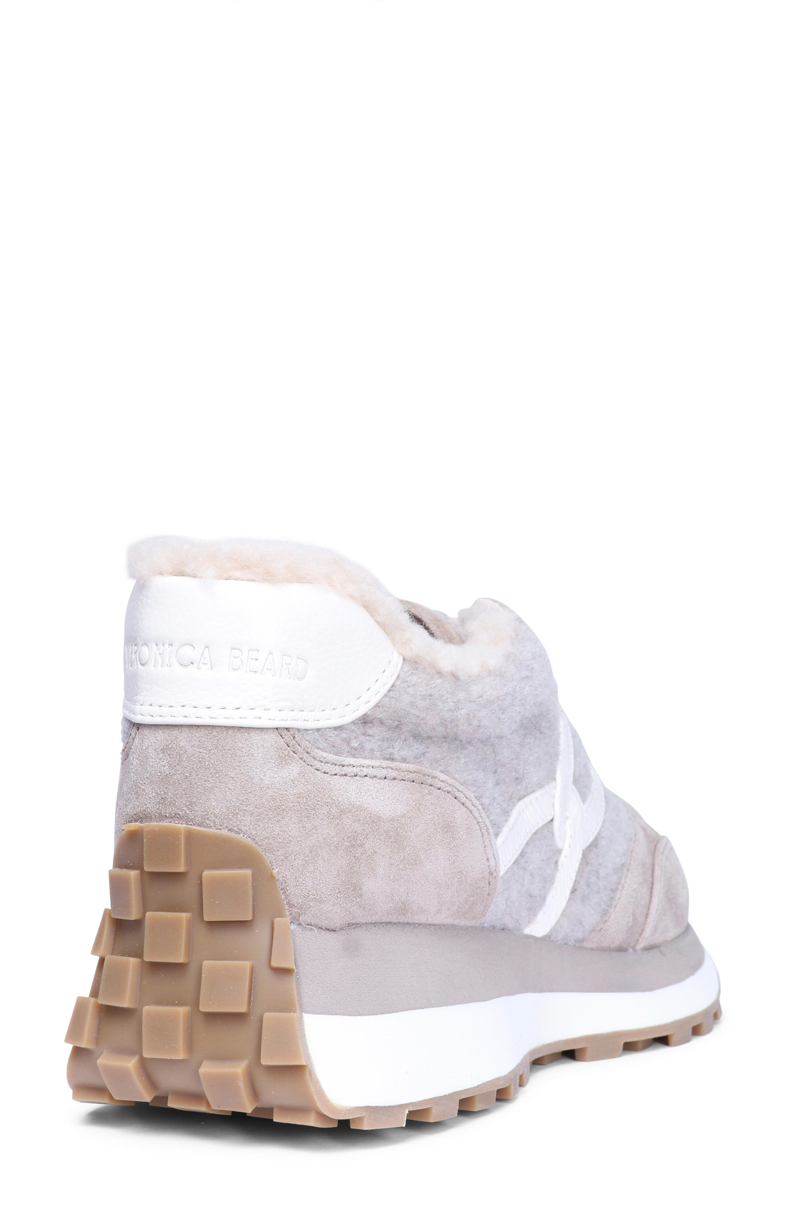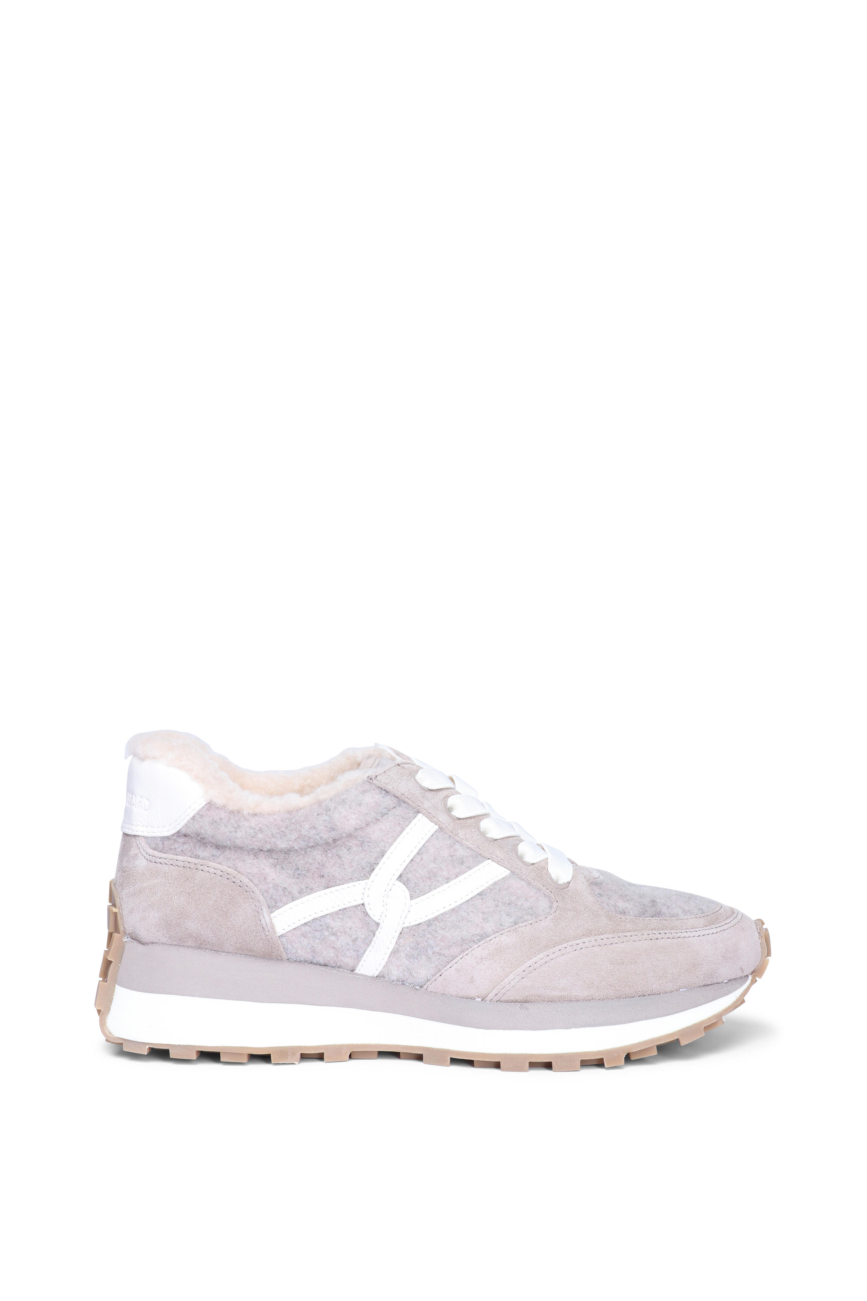 Suede and shearling upper. Shearling lining. Rubber sole. Tapered toe. Lace-up vamp. Flat fabric laces. Interlocking-V design. Slip-on style. Imported. Heel measurement: 50mm.